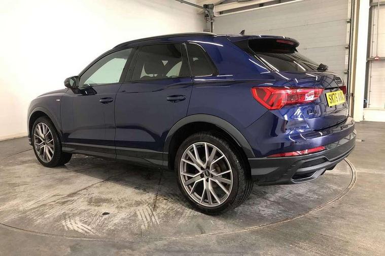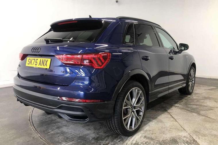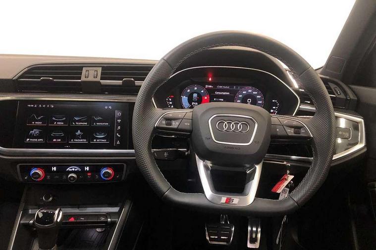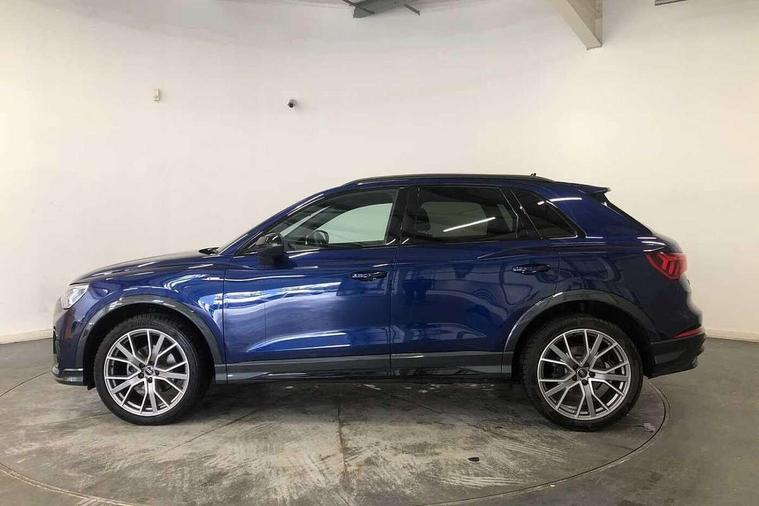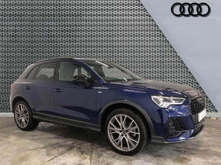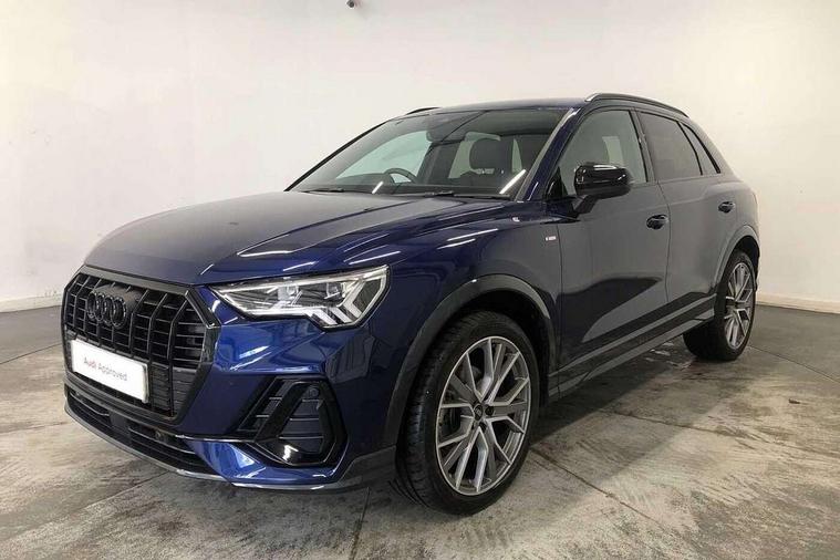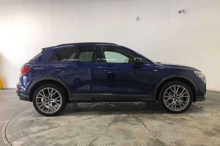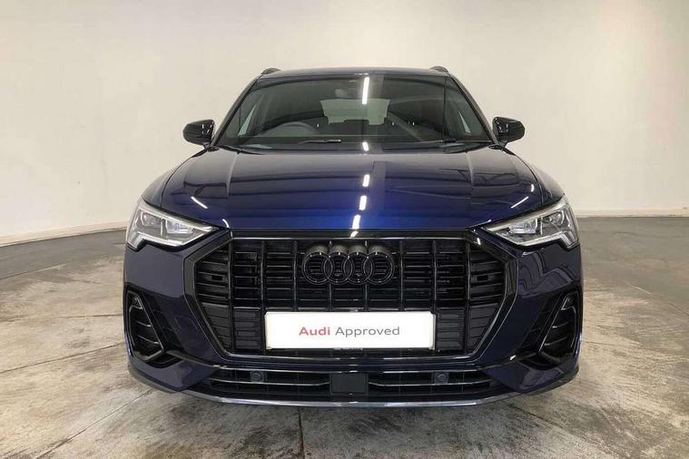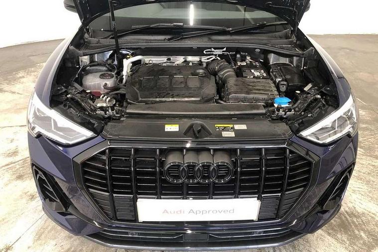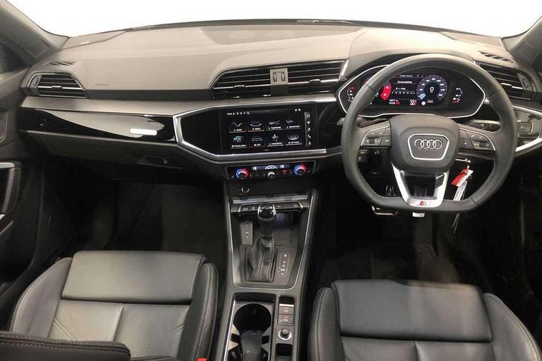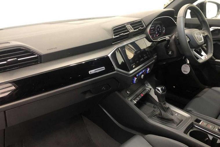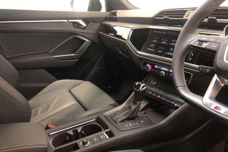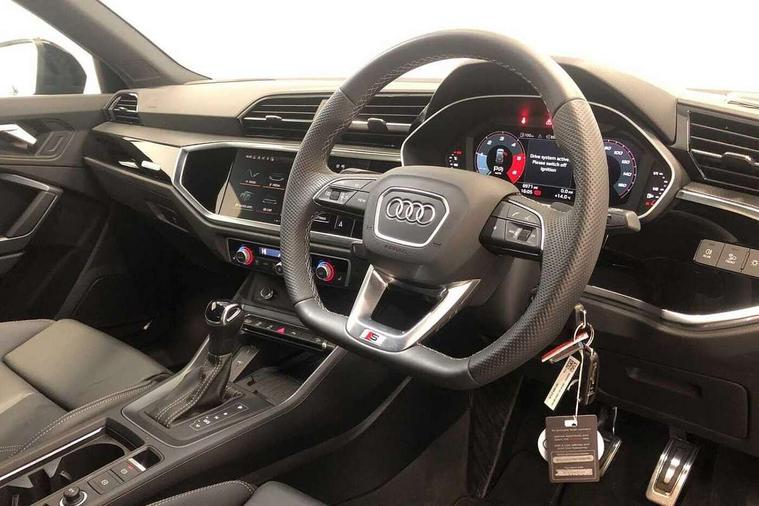 Amazon alexa Integration, Audi connect safety and service, Audi drive select, Audi lane departure warning, Audi Virtual Cockpit - 10.25" display, Bluetooth interface, Camera based traffic sign recognition, Distraction and Fatigue warning, Legal emergency call, MMI Navigation Plus with high resolution 10.1 inch touchscreen colour display, Power operated tailgate, Progressive steering, Service interval indicator, Smartphone interface includes wireless Apple carplay/Android Auto, Start stop system with recuperation, Voice control system with natural language interaction, Diesel particulate filter, Sports suspension, 2 USB-C ports with charge and data functions, 6 passive loudspeakers, DAB digital radio module, Acoustic windscreen, Anthracite black radiator grille, Audi Beam uses LEDs to project the Audi logo onto the ground as you exit your Q3, Auto dimming door mirrors, Auto dimming frameless rear view mirror, Black roof rails, Electrically folding, adjustable and heated door mirrors with integrated LED side indicators and kerb view function for passenger side, Front and rear electric windows, Front fog lights, Grille vertical bars in aluminium silver/Matt, High gloss black finish B and C pillars, LED Dynamic rear indicators, LED headlights with LED daytime running lights, LED rear lights, LED third brake light, Privacy glass dark tinted rear and rear-side windows (from B-pillar backwards), Rain and light sensors, Rear diffuser grille in grained matt black, Rear diffuser strip in matt anthracite black, Rear side wing doors, Rear wiper, S line bumpers in contrasting Manhattan grey, Variable front intermittent wipers, 12V socket in rear centre console, 3 seat bench in 2nd row, 40:20:40 folding with manual adjustment for 60:40 forwards/backwards position and backrest angle, Adjustable rear seat bench/backrest with centre armrest and cupholder, Black carpet mats, Black cloth headlining, Dual zone electronic climate control, Electric lumbar support, Front and rear black floor mats with contrast stitching in rock grey, Front and rear headrests, Front centre armrest, Height and reach adjustable steering wheel, Illuminated door sill trims with S logo, ISOFIX child seat mounting for front passenger with airbag deactivation and outer rear seat including top tether attachment point for outer rear seats, Luggage compartment sill protection in stainless steel, Manual front seats with height adjustment, Perforated leather gearknob, Single front passenger seat, Stainless steel pedals, Twin leather upholstery with front sport seats + S embossing, Black styling pack - Q3, Non smoking pack - Q3, 3x3 point rear seatbelts, 6 airbags - Driver, front passenger, curtain and side windows, Audi pre-sense front with pedestrain and cyclist recognition, Electrically operated child locks on rear doors, Electromechanical parking brake, Electronic stabilisation control including ABS, ASR and EDL, Front seatbelt reminder, Hill descent control, Hill hold assist, Pre sense basic, Seatbelt monitoring, Tyre pressure warning, Warning triangle and first aid kit, Anti theft wheel bolts, Immobiliser, Remote central locking, Thatcham approved category 1 anti theft alarm, Aluminium look interior elements, Detail dashboard around MMI touch colour display in glass look, black with surround in aluminium look, Leatherette door armrest, Piano black inlay,