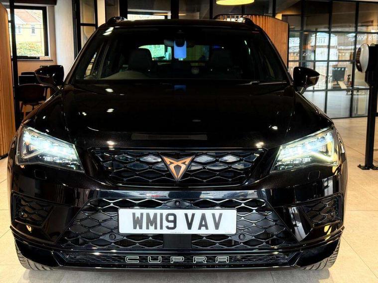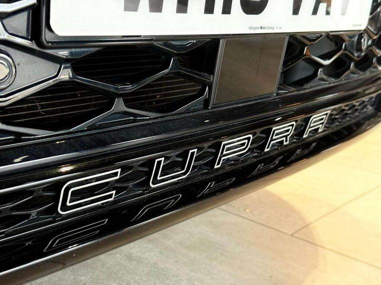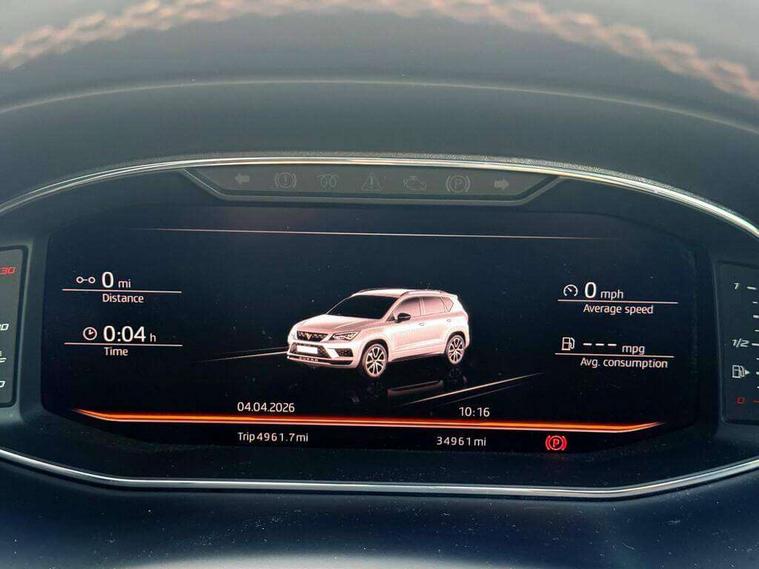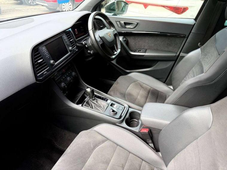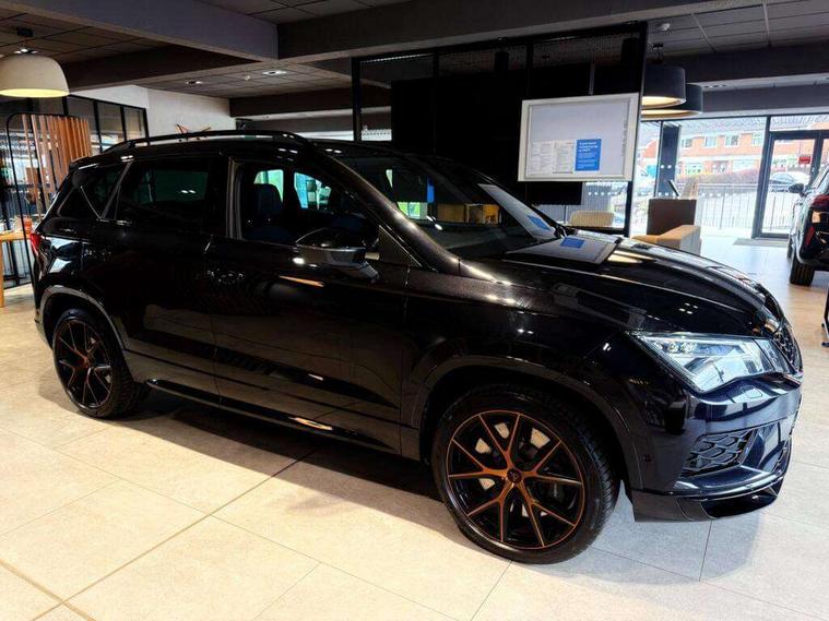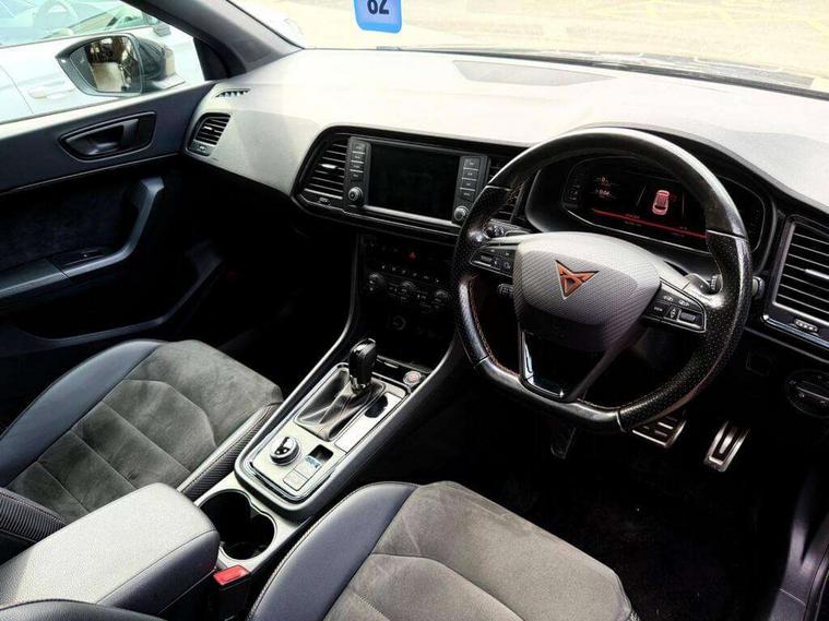 'Lights On' Reminder warning buzzer, 8.0" colour touchscreen with proximity sensor, Cruise control, Digital clock, Digital cockpit, Electric tailgate release, Front assist city emergency braking and pedestrian protection, Full Link Smartphone Integration with Mirror Link, Apple Car Play, Google Android Auto, Lane assist, Low fuel warning light, Navigation system (incl. media system plus) - Dynamic route guidance feature with 3D Map display and 3D emblematic buildings, Outside temperature gauge, Park assist system with steering assist, Progressive power assisted steering, Rear cross traffic alert, Rear view camera, RPM counter, SEAT Drive profile CUPRA, Self parking functionality (includes front and rear parking sensors), Top view camera, Trip computer, Wash water level indicator, Wireless Smartphone charger, CUPRA sport suspension, XDS electronic differential lock, 10 GB hard disk, 2 additional USB ports in rear with storage net, 2 USB ports, 2x SD card slot, 8 Speakers, AM/FM radio, Aux-in socket, Beats audio system, CD player, DAB digital audio broadcast, High resolution colour driver display, SEAT USB media cable, Steering wheel mounted audio/phone controls, Armrest with air outlet in rear, Automatic headlight adjustment, Black roof rails, Body colour door mirrors and handles, Body coloured wheel arch extensions, Dark tinted rear windows, Door mirrors with welcome CUPRA light silhouette, Electric adjustable/heated/folding door mirrors, Front and rear electric windows, Full LED headlights, Gloss black side window surrounds, High beam assist, High gloss black grille, Illuminated aluminium front door sill with CUPRA logo, LED daytime running lights, LED tail lights, Rear fog lights, Rear spoiler, Rear wash/wipe, Visible dual exhaust pipes, 12V power point front, 60/40 split folding rear seat, Adjustable front armrest with storage compartment, Advanced multicolour ambient light with LED interior light and LED illuminated glovebox, Alcantara upholstery + sports seats, Aluminium pedals, Ambient spot lighting and front footwell illumination, Black roof lining, Child seat ISOFIX attachment with rear outer seats includes top tether, Chrome dashboard detailing, Driver and passenger sun visor, covered and illuminated mirror, driver sun visor with card holder, Dual zone climate control, Four cargo rings in the boot, Front courtesy reading lights, Front cupholders, Front seat back storage pockets, Gear shift indicator, Height adjustable driver's seat, Height adjustable front headrests, Height adjustable passenger seat, Illuminated boot, Instrument lighting with brightness control, Rear armrest and easy back seat release mechanism from boot, Rear reading lights, Sports leather steering wheel + gearshift, Steering wheel gearshift paddles, Storage box under drivers seat, Convenience pack - Ateca, ABS, Active front headrests, Black brake callipers with CUPRA logo, Brembo brakes, Driver/Front Passenger airbags, Drivers knee airbag, Electronic parking brake with auto hold, Electronic stability control, Front and rear seatbelt reminder, Front passenger airbag deactivation, Front side airbags, Hill hold control, Tiredness recognition system, Traction control, Twin curtain airbags, Tyre pressure monitoring system, Central locking fuel filler cap, Keyless entry and go, Locking wheel bolts, Perimeter alarm with interior monitoring, Power locking and remote control with two foldable keys and opening boot selector, 19" Copper alloy wheels, Space saver spare wheel,