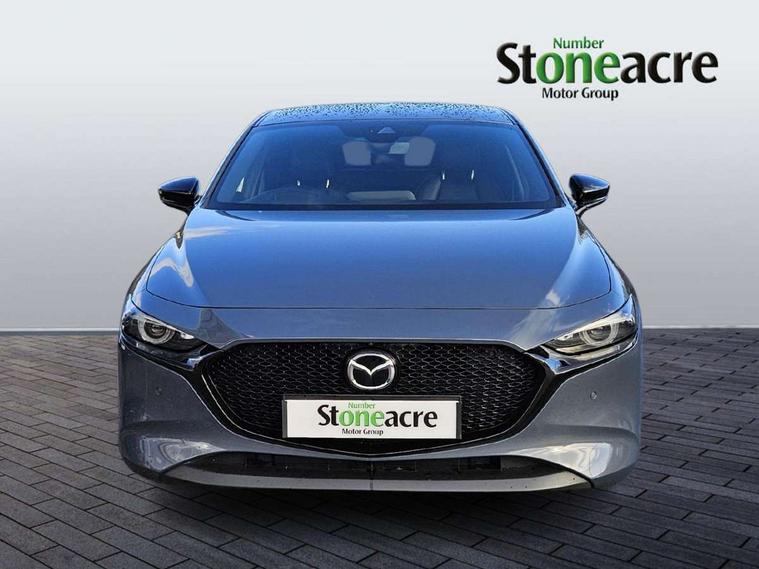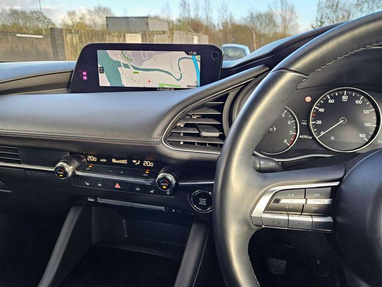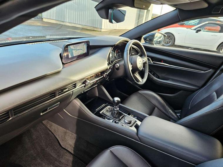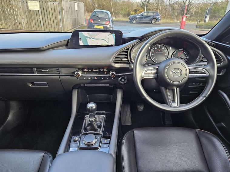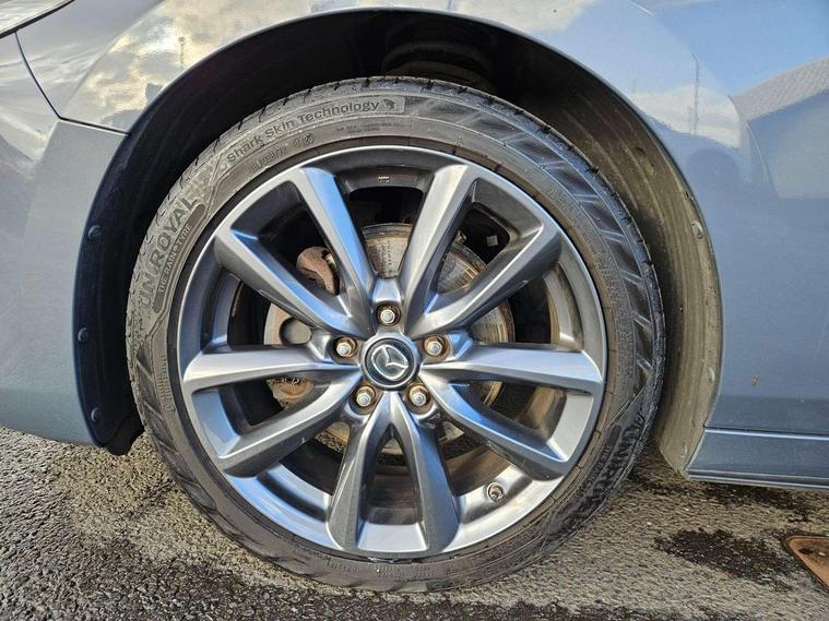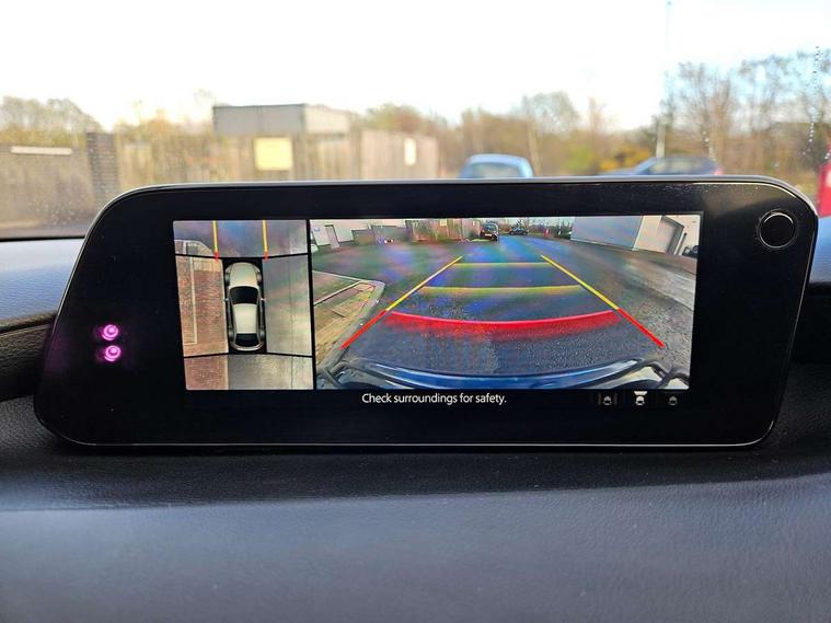 360 View Monitor, 7" colour TFT display, 8.8" Colour centre touch screen display with Mazda Connect infotainment, Apple car play/Android Auto, Audio transfer from bluetooth devices, Blind spot monitoring with rear cross traffic alert, Colour active driving display inc Windscreen projected, Traffic Sign Recognition, turn-by- turn navigation and Mazda Radar Cruise Control information, Cruising Traffic Support, Digital instrument cluster, Driver attention alert system, Driver attention alert system with camera, Driver monitoring system, E-call with GPS, Emergency stop signalling system, Engine start/stop button, Front and rear parking sensors, Front Cross Traffic Alert, Head up Display, Integrated bluetooth with steering wheel mounted controls, Intelligent speed assist, Lane keep assist system (LAS) with Lane departure warning system (LDWS), Mazda Navigation System with european mapping, Mazda Radar Cruise Control, Mobile App interface, Multimedia Commander, PAS, Reversing camera, Service indicator, Start/stop button chrome surround, Trip computer, Auxiliary input socket, Mazda Multimedia System with AM / FM / DAB radio, single CD / MP3 with 12 Speaker Bose sound system, bose centerpoint, bassmatch+audiopilot technology, Adaptive LED Headlights, Auto dimming door mirrors, Coming/leaving home lighting function, Dark metallic finish signature wing, Daytime running lights, Door mirrors with adjustable memory and tilt-down function when reversing, Dusk sensing headlights, Electric front/rear windows with one touch/auto up/down, Electrically adjustable/heated/auto power folding door mirrors with integrated indicators, Frameless auto dimming interior rear view mirror, Front body coloured bumper with black/bright lower bezel, Gloss black mesh grille, Gloss black rear roof spoiler, High beam assist, LED headlamps with auto levelling, LED indicator lights, LED third brake light, Piano black window garnish, Privacy glass with dark tinting on rear side windows and rear window, Rain sensing front wipers, Rear fog lights, Rear gloss black lower moulding, Signature LED lights, Signature LED rear combination lights with LED rear turn lights, Speed adjustable rear wash wiper with intermittent wipe, 60/40 split fold down rear seats, Chrome centre bezel steering wheel, Chrome-plated glovebox handle, Driver, Front passenger and two rear grab handles with coathooks, Driver/passenger sunvisors + vanity mirrors (drivers side with ticket holder), Dual zone climate control air conditioning, Electrical power outlet, Folding rear centre armrest with two cup holders, Front and rear courtesy lamps, Front armrest, Front centre console with storage box with tray, lid + 2 cupholders, Front head restraints, Front passengers seat manual slide, recline and height adjustment, Gear shift indicator, Heated steering wheel, Illuminated glovebox, ISOFIX child seat anchorage points attached on outer rear seats, Leather wrapped gear shift knob, Leather wrapped steering wheel, Leather/vinyl upholstery + front heated with 3 stage setting, LED interior light, Luggage compartment light, Power driver lumbar adjustment, Reach adjustable steering wheel, Storage - glovebox, driver and front passenger door pockets and roof mounted sunglasses holder, Three height adjustable rear head restraints, Tilt/height adjustable steering wheel, USB charging point, 3 point ELR front seatbelts with pretensioners, 3 rear 3 point seatbelts with ELR, Anti-lock braking system (ABS), Collision mitigation braking system, Drivers knee airbag, DSC - Dynamic Stability Control, Dual front airbags, EBD - Electronic brakeforce distribution, Electronic parking brake with auto disengage function and auto hold function, ESP, Front and rear curtain airbags, Front passenger airbag cut-off switch, Front side airbags, Front smart city brake support, G-Vectoring control plus, Hill launch assist, Intelligent Traction Control system, Mild Hybrid system with regenerative braking, Rear smart city brake support, Seatbelt reminder for driver/front passenger and rear seats, Tyre pressure monitoring system (TPMS), Auto door lock when driving, Remote central locking + deadlocks, Smart Keyless entry and start, Thatcham accredited alarm and immobiliser, 18" Grey metallic alloy wheels, Emergency tyre repair kit,
