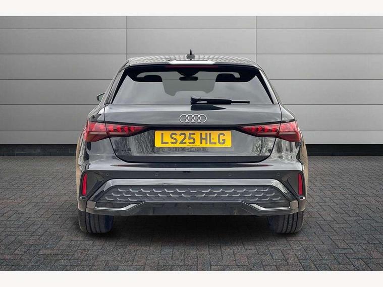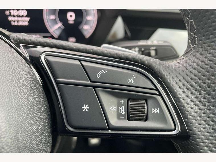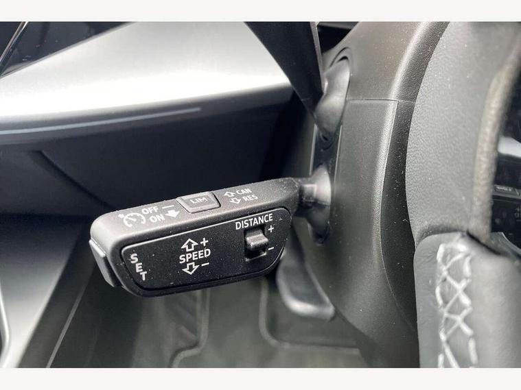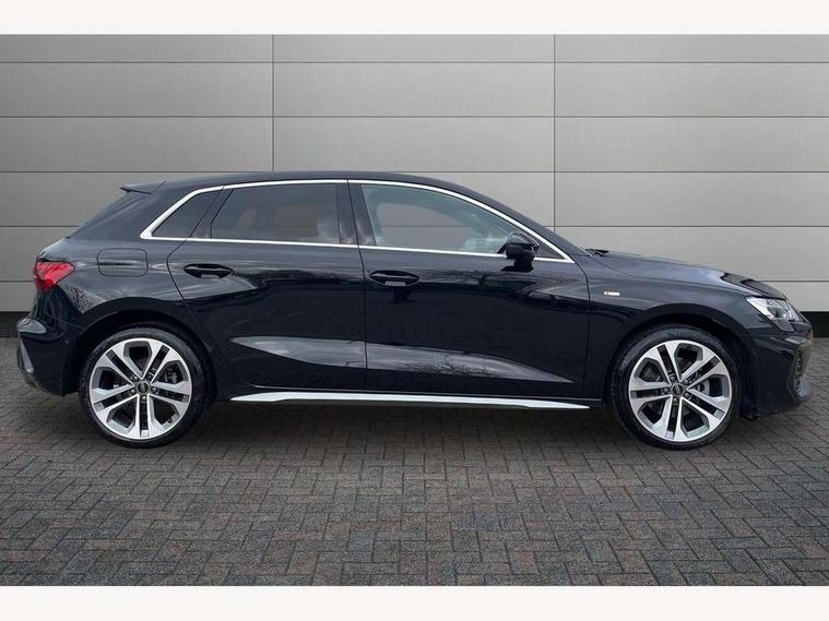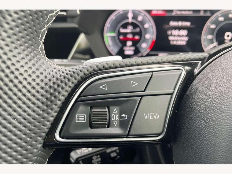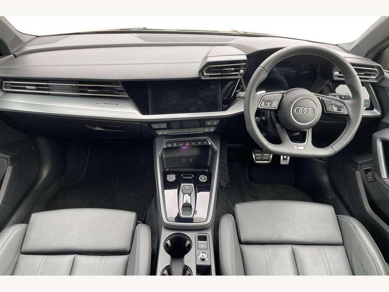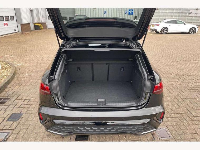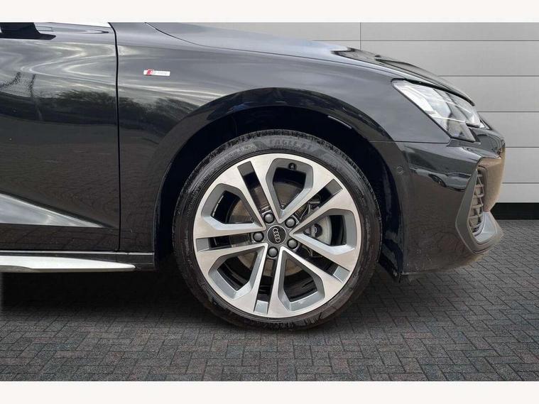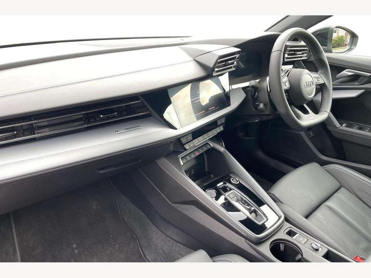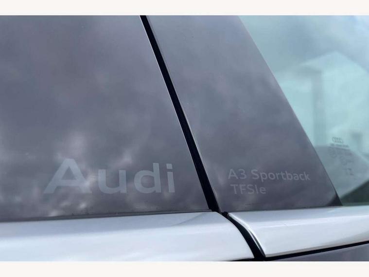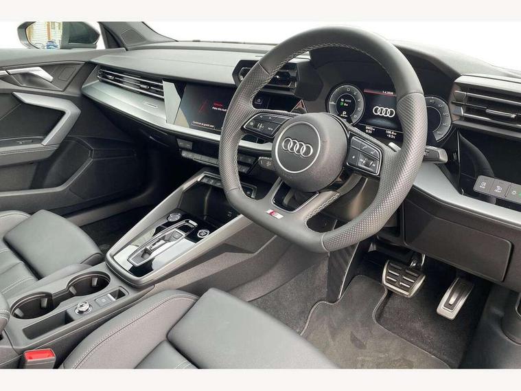 Adjustable speed limiter, Audi drive select, Audi smartphone interface with app store includes wireless Apple carplay, Android auto and Amazon alexa integration, Audi virtual cockpit plus - 12.3" full HD resolution dynamic digital instrument cluster, Automatic start/stop system with recuperation, Bluetooth interface, Camera based traffic sign recognition, Collision avoidance assistant, Cruise control, Distraction and Fatigue warning, e-Call (emergency call), Electromechanical power speed sensitive steering, Lane departure warning system, MMI Navigation Plus with high resolution 10.1" colour touch screen display, Park Assist with parking system Plus, Service indicator, Trip computer, Voice control system with natural language interaction, 3 pin 10 amp domestic charging cable, CCS socket for DC charging, Charging cable for public charging, mode 3 (type 2), up to 22 kW (AC), Compact charging system, Industrial connector CEE 32 A, 230 V, length 1.6 m, Standard suspension, Type 2 socket for AC charging, Audi Phonebox light with wireless charging, Audi sound system - 10 loudspeakers including centre loudspeaker and subwoofer, DAB Digital radio, USB ports with charging function in the rear, Acoustic glass windscreen, Aluminium window trim, Auto dimming frameless rear view mirror, Body colour exterior mirrors, Chrome exhaust tailpipes, Electrically adjustable/heated/folding/auto dimming door mirrors with integrated LED indications + kerb view function for passenger side, Exterior model badging, Front and rear side air inlets in grained matt black with dark liquid chrome frame, Front electric windows, Front radiator grill in high gloss dark chrome, Heat insulating glass windscreen, Illuminated door sills with aluminium inserts at the front with S logo, LED 3rd brake light, LED daytime running lights, LED headlights with LED rear lights and dynamic rear indicators, Light and rain sensors, Privacy glass - dark tinted rear window, rear door and side windows, Rear diffuser and grill in grained matt black with inlay in dark liquid chrome, Rear electric windows, Rear side wing doors, Rear wiper, S line bumpers, S roof spoiler, Side S line emblems on front wings, Side sill trim in dark liquid chrome, 12V socket and storage compartment in front centre console, 3 seat bench in 2nd row, 3 spoke flat bottomed leather multifunction sport steering wheel with gear shift paddles, 3-zone deluxe automatic air conditioning, 4 way electrically adjustable lumbar support for driver and front passenger, 40/20/40 split folding rear seat bench, Black cloth headlining, Convenience auxiliary air conditioning, Front and rear centre armrest in artificial leather, Front and rear centre armrest in artificial leather with contrasting stitching on armrests and instrument panel, Front and rear headrests, Front/rear floor mats, Heated front seats, Height and reach adjustable steering wheel, Manual boot compartment lid, Manually adjustable front seats, Rear cup holders, S badging on the steering wheel, Seat side bolsters, Single front passenger seat, Stainless steel pedals and front footrest in black, Twin leather upholstery with front sports seats S embossed logo, Aluminium interior elements pack - A3 Sportback, Multi-coloured LED interior lighting package - A3, 3x3 point rear seat belts, Acoustic vehicle alerting system, Driver and front passenger airbag with passenger airbag deactivation, Electronic Stabilisation Control (ESC) including ABS, ASR and EDL, First aid kit with warning triangle and 2 safety vests, Front side airbags with head airbags and interaction airbag, Hill hold assist, Pre-sense front with pedestrian and cyclist detection, Seatbelt monitoring, Tyre pressure loss indicator, Anti theft alarm, Anti-theft wheel bolts, Electronically operated child locks, Immobiliser, Remote central locking with safelock, Dash & door Inlay in dark aluminium Spectrum, Tyre repair kit,