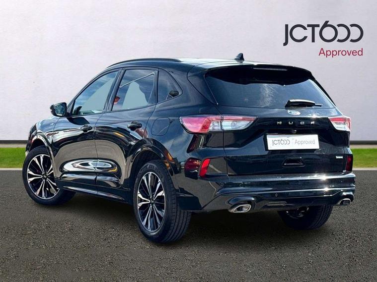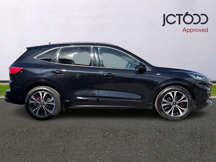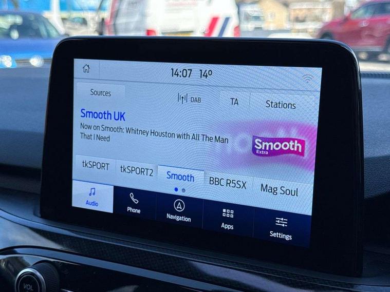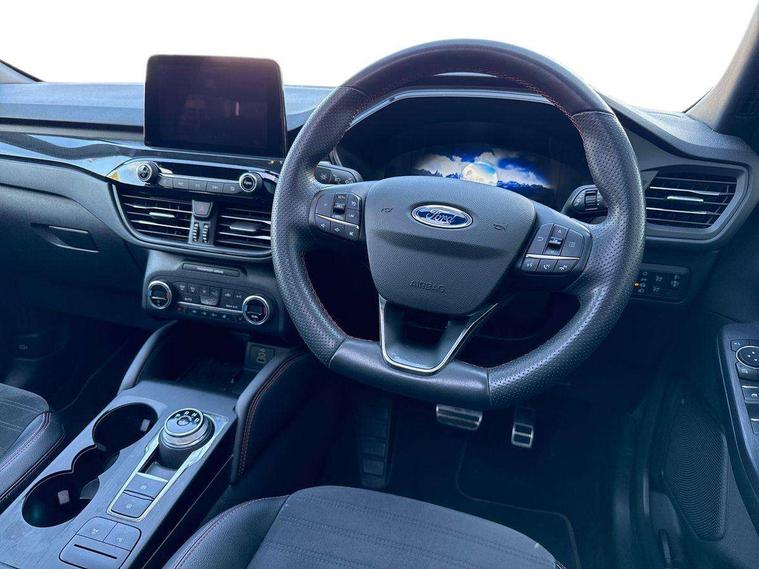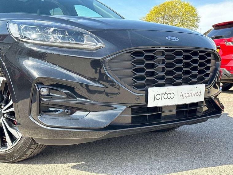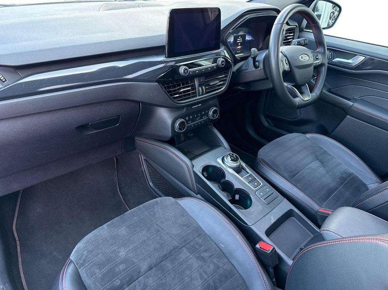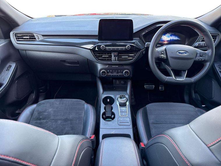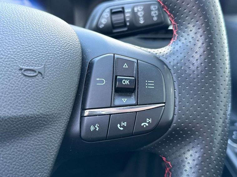 12.3" digital colour instrument cluster, Ford easy fuel, Ford SYNC 3 with 8" TFT LCD touchscreen, App Link, andriod auto/apple carPlay, emergency assistance and navigation with Ford pass connect, Front and rear parking sensors, Hands free power tailgate, Lane keeping aid with lane departure warning, Power assist steering, Rear view camera, Selectable drive modes, Service interval indicator, Sports suspension, Twist beam rear suspension, B&O premium audio system with 10 speakers and subwoofer, 2 USB ports, DAB radio/CD, Auto headlamps with high and low beam, Black roof rails, Day/night rear view mirror, Front LED fog lamps, Large rear spoiler, LED daytime running lights, LED rear lights, Power folding heated door mirrors with puddle lights, Power front/rear windows with global close, Power opening panoramic roof, Privacy glass, Quickclear heated windscreen, Rear side wing doors, Rear wiper, ST Line body styling kit with unique front and rear fascia and bumper, rear painted diffuser, front painted skid plates, dark mesh upper grille, ST Line front scuff plates, Third brake light, Twin exhausts, 10 way power adjustable drivers seat, 2nd row sliding seats with 60:40 split, 8 way manual passenger seat including lumbar support and height adjust, Alloy pedals, Centre console with electronic parking brake, Dark headlining and pillars, Electronic automatic temperature control (EATC), Flat bottomed leather steering wheel in sensico with red stitching, Front and rear head restraints, Heated passenger and driver seats, Heated rear seats, Heated steering wheel, Partial premium touch sensico leather upholstery with black cloth inserts and red stitching, Rear charging point, Single front passenger seat, Sports seats, ST Line front and rear floor mats, 3x3 point rear seatbelts, Airbags - front driver/passenger, front and rear curtain, Drivers knee airbag, Electronic stability control (ESC) and ABS, Ford MyKey Gen 2 safety system, Manual child proof rear door locks, Post collision braking, Pre collision assist with autonomous emergency braking, Rear seat Occupancy alert, Red brake calipers, Tyre pressure monitoring system, Engine immobiliser, Keyless entry and Ford power start button (Keyless start), Locking wheel nuts, Remote powered central double locking doors, Thatcham category 1 alarm,