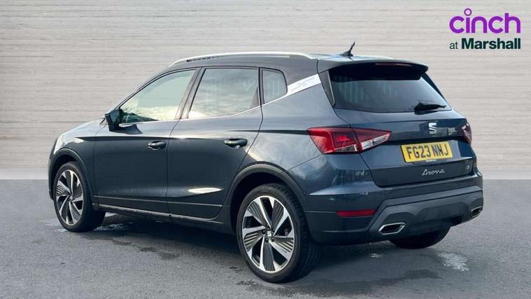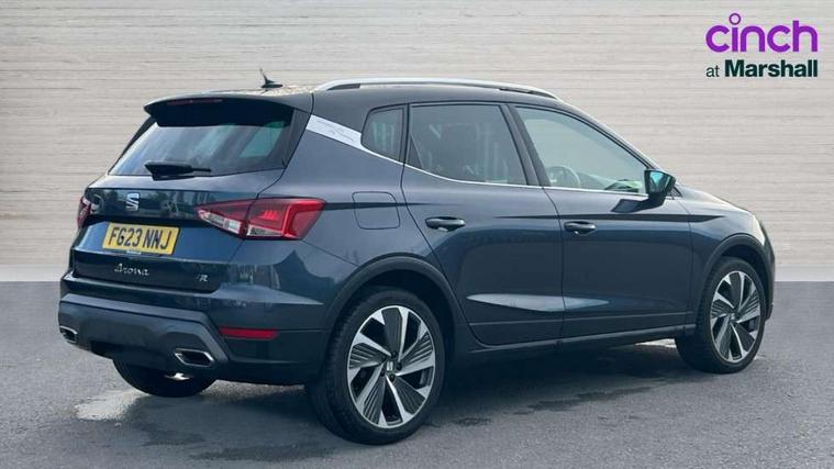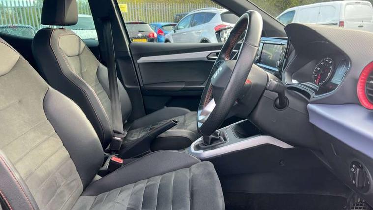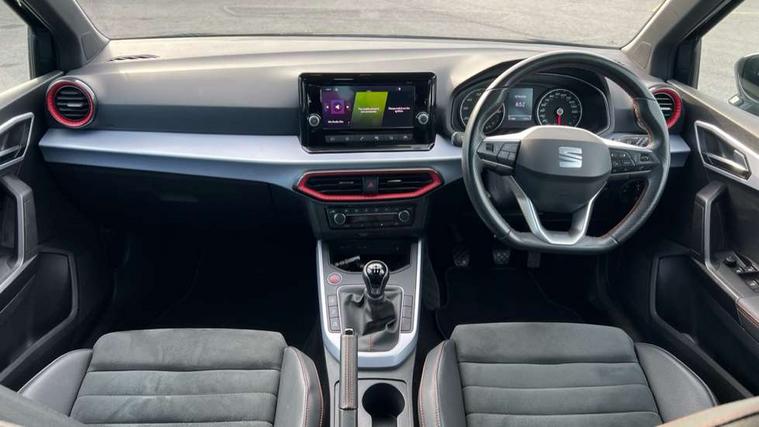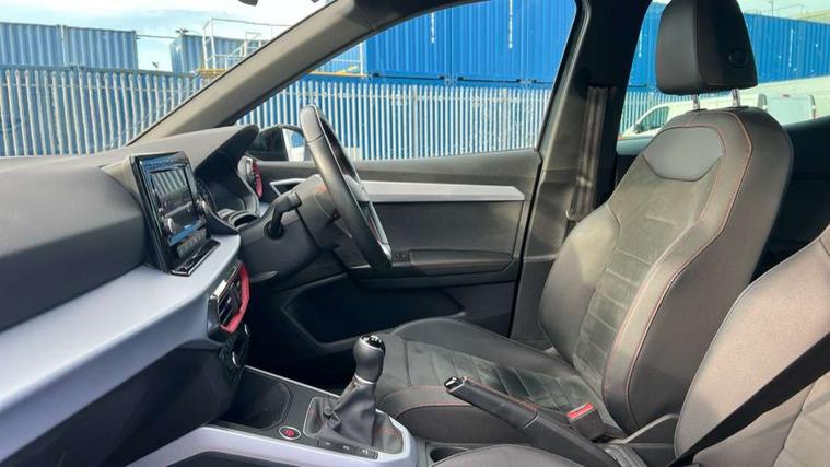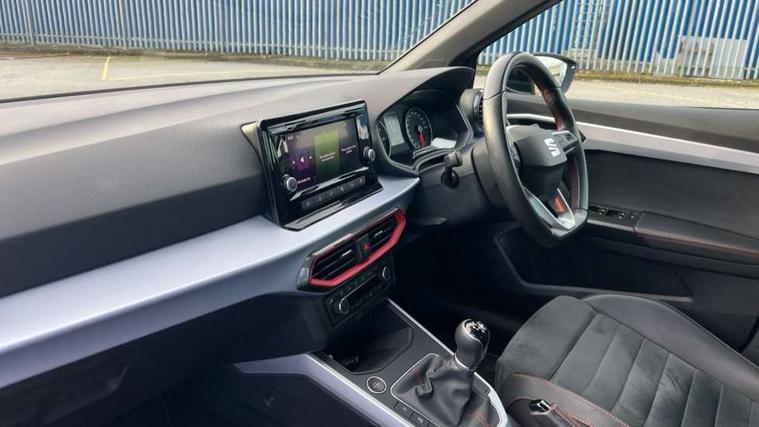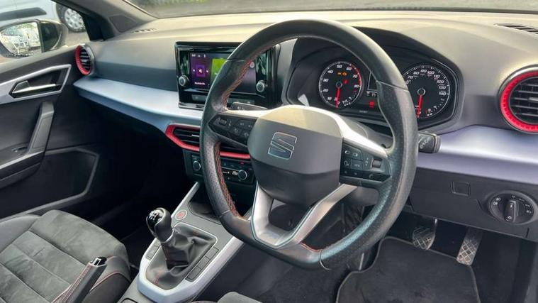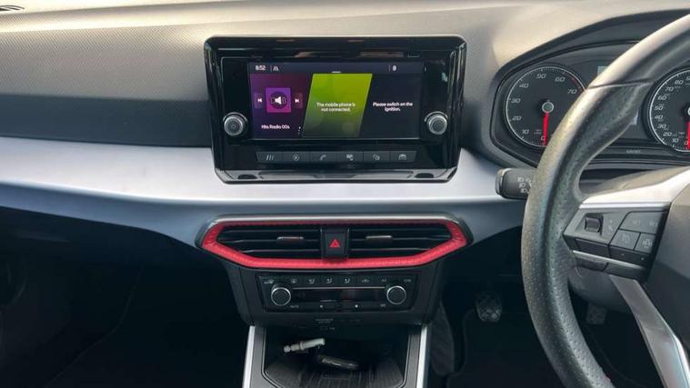 'Lights On' Reminder warning buzzer, Analogue cockpit with physical dials, Digital clock, E-call, Electric speed sensitive power steering, Full Link Smartphone Integration with Mirror Link, Apple Car Play, Google Android Auto with USB cable for Apple and Android compatibility, Lane keeping system, Low fuel warning light, Outside temperature display, Rear parking sensor, RPM counter, Seat connect with safety, service and remote, SEAT Drive profile - Four different models normal-sport-eco-individual, steering response, throttle response, Trip computer, Wireless phone charger, Bluetooth interface for hands free and audio streaming, DAB digital radio and AM/FM radio, Media system with 8.25" colour touchscreen with USB port (type c), Steering wheel mounted audio controls, Anti theft roof antenna, Automatic activation of hazard warning lights, Body coloured bumpers, Body coloured door handle inserts, Chrome roof rails and window surrounds, Dark tinted rear windows, Dimming rear view mirror, Electric front/rear windows, Electrically adjustable and heated door mirrors, Front fog lights with cornering function and rear fog light, FULL LED automatic headlights with dynamic headlight range control, coming and leaving home, LED daytime running lights, LED rear tail lights and licence plate lights, Protective side mouldings, Rear side wing doors, Rear spoiler, Rear window wash/wipe, Roof colour door mirrors, Third brake light, Twin exhaust pipe styling hidden exhaust pipe, Visible VIN plate, Windshield wiper with intermittent control and potentiometer, 2 cupholders, 3 seat bench in 2nd row, 60/40 split folding rear seat, Aircare filter, Black interior roof, Double boot floor, Driver sunvisor with covered mirror + card holder, Dual zone climate control, Front comfort seats, Front courtesy light with front and rear reading lights, Gear shift indicator, Height adjustable front seats, Height/reach adjustable steering column, Illuminated boot, Instrument lighting with brightness control, Interior ambient lighting, Interior light in footwell, central console and door panel, ISOFIX points in outer rear seats with top tether anchorage points, Microsuede cloth upholstery, Passenger sunvisor with vanity mirror, Perforated flat bottomed leather steering wheel/gear knob/handbrake with red stitching and FR logo, Single front passenger seat, Two front and three rear height adjustable headrests, Interior chrome pack - Arona, 3 point seatbelts on all rear seats, ABS, Active front headrests, Child locks on rear doors, Driver and front passenger airbags with front passenger airbag de activation, front side and curtain airbags, Electronic stability control, Emergency Brake Assist (EBA) and front assist, Front and rear seatbelt reminder, Hill hold control, Multi-Collision braking, Tiredness recognition system, Traction control, Tyre pressure monitoring system, Alarm with back-up horn, Electronic engine immobiliser, KESSY Keyless entry and go, Locking wheel bolts, Remote central locking + deadlocks, Tow away protection, Titan black dashboard,