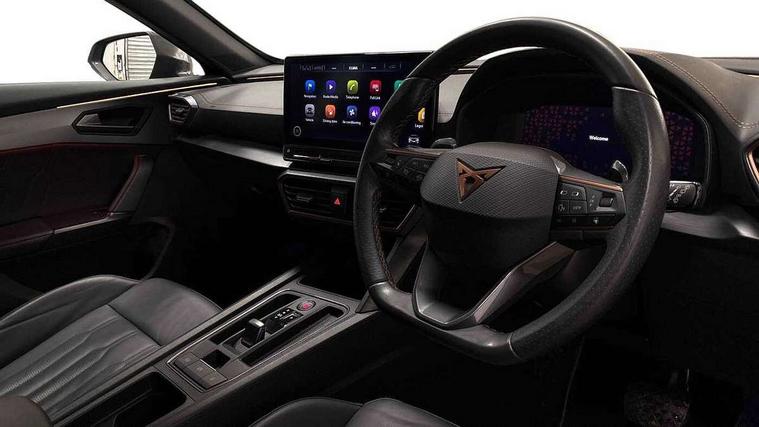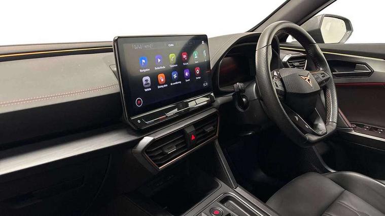 Digital cockpit and configurable dashboard, Driver alert system, Driving profile selection, Forward collision warning with automatic braking, Lane assist, Navigation system with 12'' Touchscreen Display, Park assist (inc front/rear parking sensors), PAS, Predictive adaptive cruise control with speed limiter, Rear view camera, RPM, trip computer, outside temp gauge, instrument light brightness, low fuel warning light, lights on reminder, gearshift indicator, Service interval indicator, Start/stop system with regenerative braking, Voice control system, Wireless apple carplay, Wireless phone charger, Electronic locking differential and dynamic traction support, Standard suspension, 2 front and 2 rear USB type C sockets, Auxiliary input socket, DAB radio, Auto dimming rear view mirror, Body colour door handles, Body coloured bumpers, Dark grey wing mirror, Daytime running light with automatic headlight control and coming home feature, Dynamic headlight range control, Electric front/rear windows, Electrically adjustable heated and folding door mirrors with memory function, Front fog lamps with cornering function, Gloss black roof rails and window surrounds, LED Headlights, LED Taillights with dynamic indicator, Rain sensing wipers, Rear diffuser with black simulated exhaust pipes, Rear side wing doors, Rear wash/wipe, Third brake light, Tinted rear windows, Welcome lights, 12v power supply in centre console, 12V socket, 12v socket in loadspace, 2 front and 2 rear reading lights, 230V socket, 3 seat bench in 2nd row, 60/40 split rear bench seat with armrest and mechanical seat release, Black headlining, Dust/pollen filter, Front and rear head restraints, Front centre armrest, Height/reach adjust steering wheel, Illuminated interior front door sills, Illuminated sunvisor with mirror, Isofix, Leather multi function heated steering wheel with gear shift paddles, Luggage tie-down hooks, Single front passenger seat, Three zone climate control with control panel in rear, Variable luggage/load compartment floor, Wraparound lighting, Genuine Nappa leather Pack - Cupra, 3 point seatbelts on all rear seats, ABS, Brake control system - ESC and brake booster, Child proof door locks, Driver and front passenger airbags with front passenger airbag de-activation, Electronic parking brake, Front and rear disc brakes, Front side curtain airbags, Hill hold control, Public e-call, Seat belt reminder for front and rear seats, Tyre pressure monitoring system, Anti theft alarm system, Keyless entry and start system (KESSY), Locking wheel bolts, Copper and aluminium interior detailing, 19" 'Exclusive' machined sport matte black and silver alloy wheels,