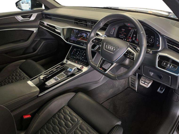 360 degree parking camera, Audi connect safety and service (e-call), Audi connect with Amazon Alexa Integration, Audi drive select, Audi virtual cockpit plus with RS specific design and 12.3" display with additional graphic display options, Automatic start/stop system, Bluetooth interface, Dynamic all wheel steering, Head up Display, Lane departure warning system, MMI navigation with MMI touch + twin touch screens 10.1" and 8.6" with haptic and acoustic feedback, Operating buttons in black, glass look with haptic feedback including extended aluminium look, Power door closure, Power latching doors, Power operated tailgate, Service interval indicator, Smartphone interface includes wireless Apple carplay/Android Auto, Voice control system, 73 litre fuel tank, Increased top speed to 174mph, Quattro sports differential, RS Sports suspension plus with dynamic ride control, 2 USB-C ports with charging functionality in the rear, Audi music interface, Bang & Olufsen 3D Premium Sound System, DAB Digital radio, 3rd brake light, Adaptive windscreen wipers with integrated washer jets, Black mirror caps, Body colour rear roof spoiler, Electric front/rear windows, Electric panoramic opening glass sunroof, Electrically folding auto dimming/adjustable/heated door mirrors with LED side indicators and kerb view function for passenger side, Frameless auto dimming interior rear view mirror, HD Matrix LED headlights with Audi laser light with dynamic light design and dynamic turn signal, Headlight washers, Heat insulating darkened glass in side and rear windows, Illuminated door sill trims with RS lettering, LED daytime running lights, LED rear combination lamps with dynamic light design and dynamic turn signal, Privacy glass with rear/side windows and acoustic glazing side windows, Radiator grille in honeycomb structure, large front air inlets and rear diffuser in gloss black, Rain and light sensors, Rear side wing doors, Rear sports exhaust system with gloss black oval tailpipe, Rear wiper, RS front bumper with air inlets on both side, Wheel arch extensions, 2 seat bench in 2nd row, 3 spoke RS flat bottomed leather multifunction steering wheel with shift paddles, heated funtion, contrast stitching, RS mode button and RS emblem, 4 way electric lumbar support for driver and front passenger, 4 zone deluxe automatic climate control, Aluminiium gear shift paddles, Audi Sport logo projection (Audi Beam) in front and rear, Black cloth headlining, Electric steering wheel adjustment, Electrically adjustable front seats with driver memory, Front and rear headrests, Front centre armrest, Front seat ventilation, Front/rear floor mats, Heated front and rear seats, ISOFIX child seat mounting and Top Tether with front passenger airbag deactivation, RS Front sports seats, Single passenger seat, Stainless steel pedals and foot rest, Valcona leather upholstery with perforated honeycomb and RS lettering, Air quality pack - RS6, City assist pack - RS6, Extended LED interior multi coloured lighting pack - RS6, Gloss black styling pack - RS6, Parking assistance plus pack - RS6, Storage pack - RS6, Tour pack - RS6, 2 x 3-point rear seatbelts, Airbags - Front side, front and rear including head, Audi pre-sense front, Direct tyre pressure monitoring system, EBD - Electronic brakeforce distribution, Electromechanical parking brake, Electronic Stability Control (ESC) including ABS, ASR and EDL, Extended pedestrian protection measures, Manual child lock in rear doors, Warning triangle and first aid kit, Advanced key, Anti theft alarm with tow away protection, Anti-theft wheel bolts and wheel loosening detection, Immobiliser, Keyless Go, Remote central locking, 22" Titanium matt gloss turned finish alloy wheels, Tyre repair kit,