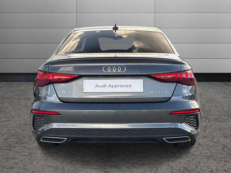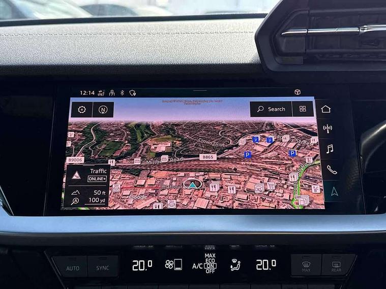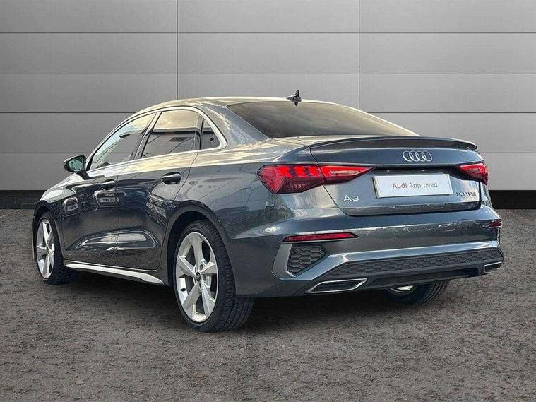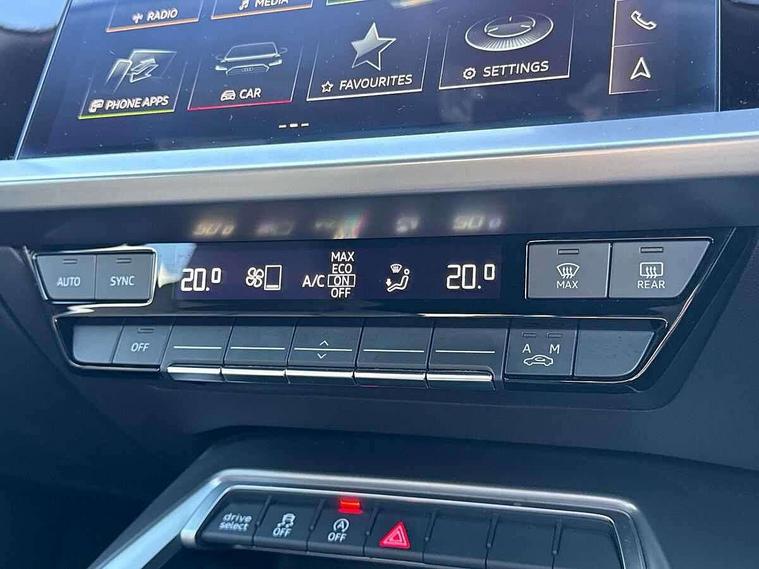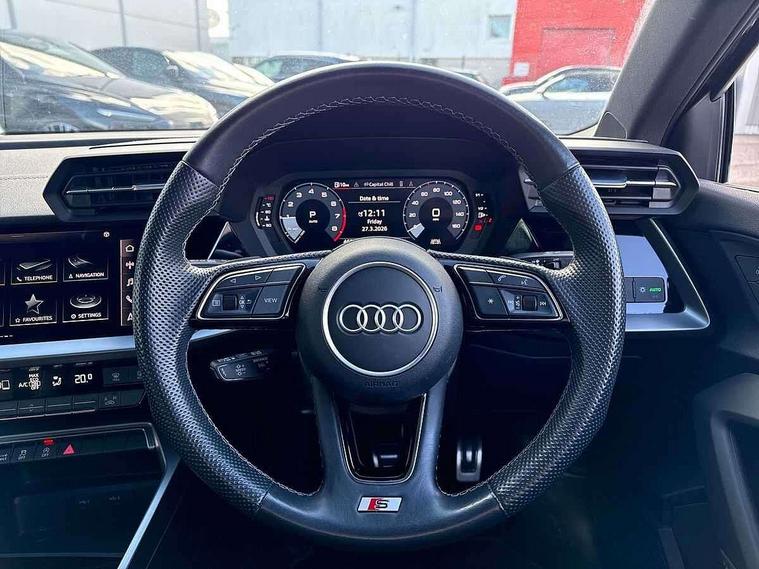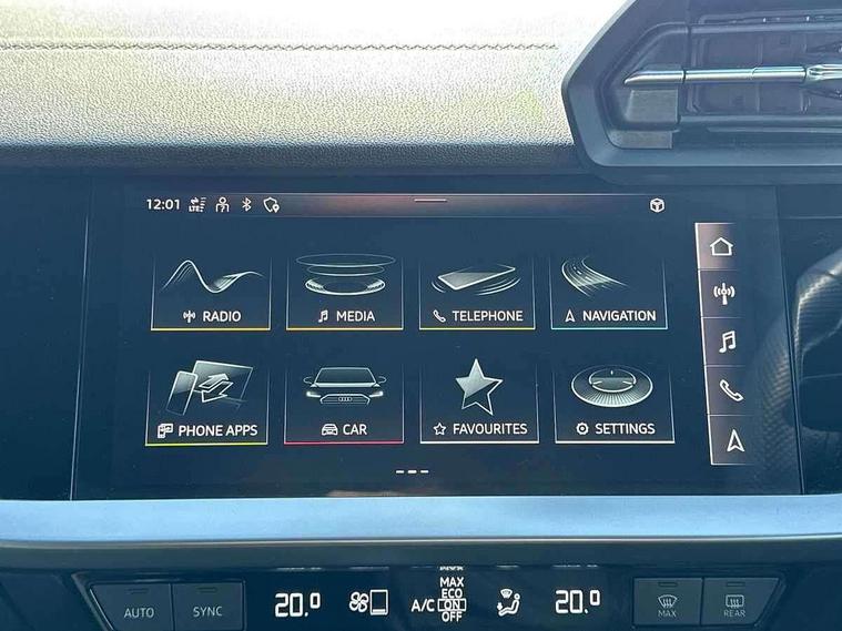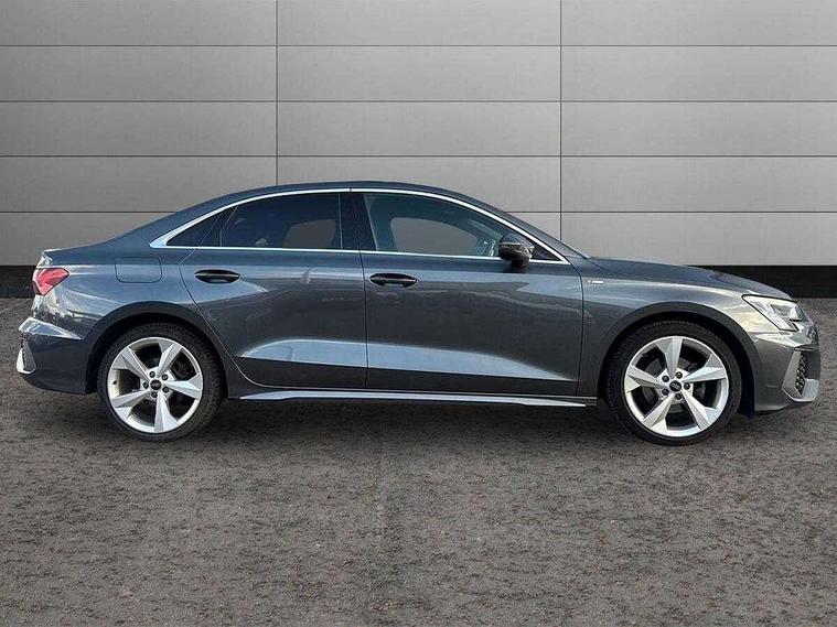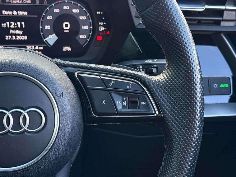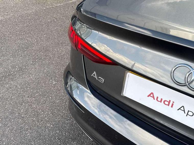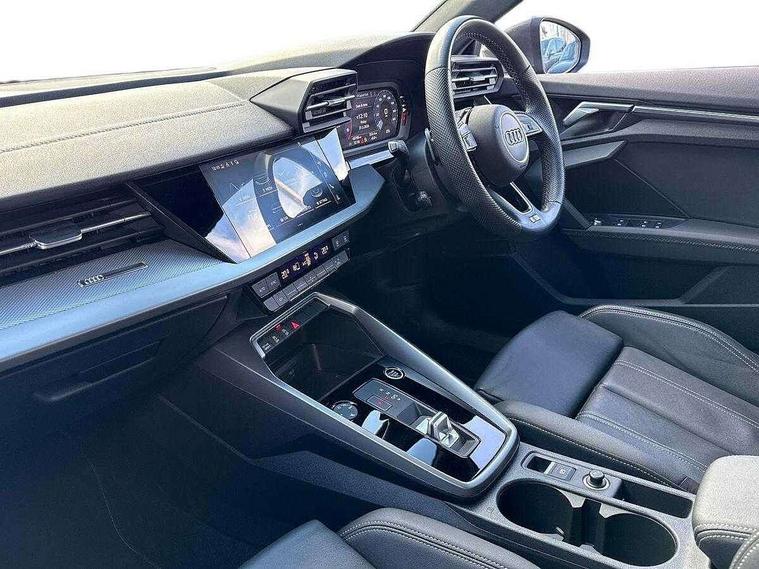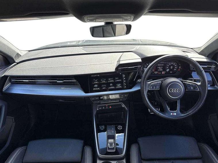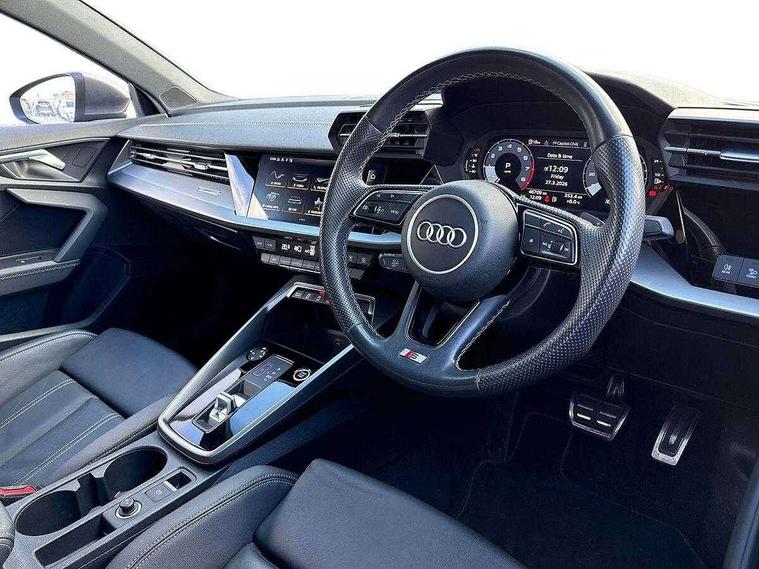 Audi connect emergency call and service, Audi drive select (Auto, Comfort, Dynamic and Individual), Audi smartphone interface, Audi Virtual Cockpit - 10.25" digital and colour instrument cluster, Automatic start/stop system with recuperation, Bluetooth interface, Collision avoidance assistant, Electromechanical power speed sensitive steering, Lane departure warning system, MMI Navigation Plus with high resolution 10.1" colour touch screen display, Service indicator, Voice control system with natural language interaction, Sports suspension, 2x USB Type C ports (for charging and data transfer), 6 passive loudspeakers, CD player, DAB Digital radio, 3rd brake light, Acoustic glass windscreen, Aluminium window trim, Auto dimming frameless rear view mirror, Body colour exterior mirrors, Electrically adjustable/heated/folding/auto dimming door mirrors with integrated LED indications + kerb view function for passenger side, Front electric windows, Illuminated door sills with aluminium inserts at the front with S logo, LED daytime running lights, LED headlights with LED rear lights and dynamic rear indicators, Light and rain sensors, Model and engine designation badges at rear, Privacy glass - dark tinted rear window, rear door and side windows, Rear boot, Rear electric windows, Rear side wing doors, S line bumpers, S roof spoiler, 12V socket and storage compartment in front centre console, 3 seat bench in 2nd row, 3 spoke leather multifunction steering wheel with gear shift paddles, 40/20/40 split folding rear seat bench with cupholder, Black cloth headlining, Dual zone electronic climate control, Front and rear centre armrest in leather, Front and rear headrests, Front/rear floor mats, Height and reach adjustable steering wheel, Illuminated vanity mirror, Interior lighting - glove compartment light and right hand side, Luggage compartment floor covering, Manual boot compartment lid, Manually adjustable front sport seats, Seat side bolsters, Single front passenger seat, Stainless steel pedals and front footrest in black, Twin leather upholstery with front sports seats S embossed logo, Aluminium interior elements pack - A3, LED interior lighting pack - A3 Saloon, S line styling pack - A3 Saloon, 3x3 point rear seat belts, Driver and front passenger airbag with passenger airbag deactivation, Electronic Stabilisation Control (ESC) including ABS, ASR and EDL, First aid kit with warning triangle and 2 safety vests, Front side airbags with head airbags and interaction airbag, Hill hold assist, Pre-sense front with pedestrian and cyclist detection, Seatbelt monitoring, Tyre pressure loss indicator, Anti theft alarm, Anti-theft wheel bolts, Electronically operated child locks, Immobiliser, Remote control central locking, Aluminium air vent surrounds, Aluminium trim elements, Dark spectrum aluminium inlays, accent surfaces in the dashboard and centre console in platinum grey silk effect paint finish,