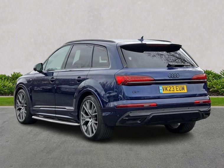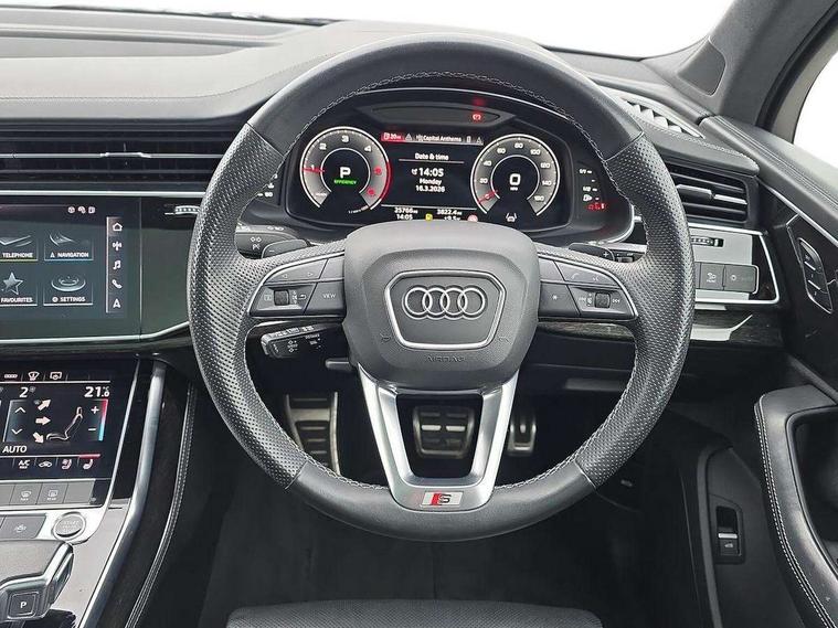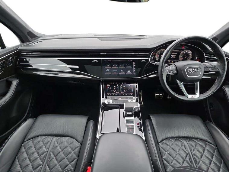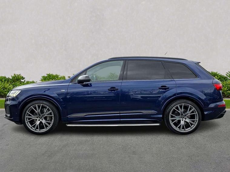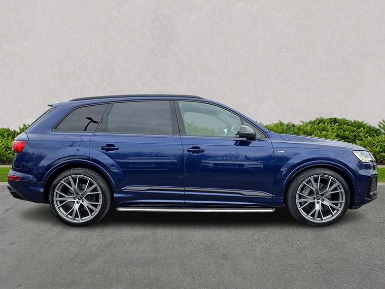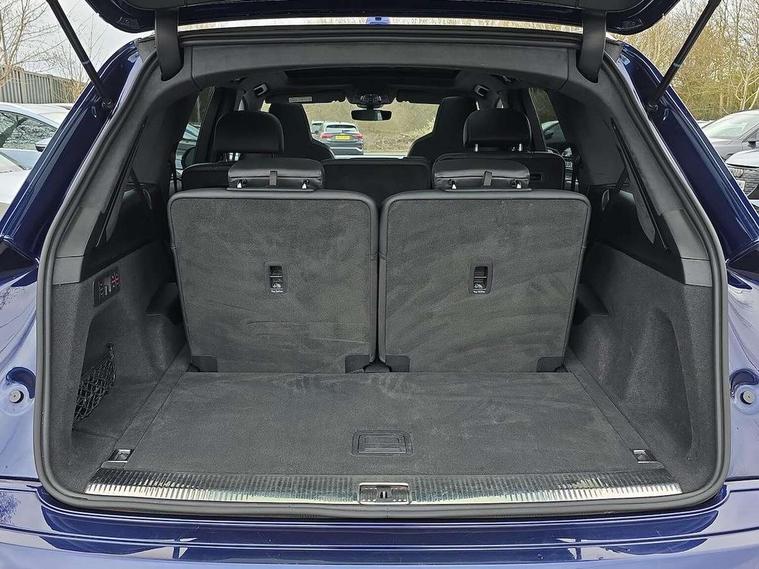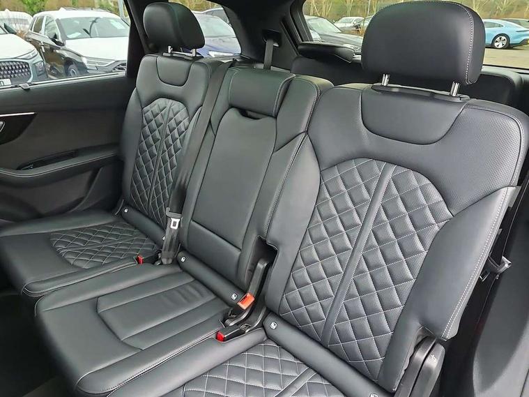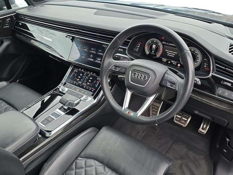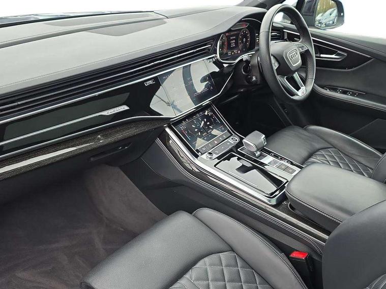All wheel steering, Audi connect safety and service (e-call), Audi connect with Amazon Alexa Integration, Audi drive select (Auto, Comfort, Dynamic, Efficiency, Individual, Off-road and All road), Audi virtual cockpit - 12.3" high-resolution LCD display with fully customisable instrument cluster, Bluetooth interface, Camera based traffic sign recognition, Head up Display, MMI navigation plus with MMI touch screens includes 10.1" and 8.6" screens with haptic feedback, Natural voice recognition, Power door closure, Power operated tailgate, Smartphone interface includes wireless Apple carplay/Android Auto, Start/stop system, 48V Mild hybrid technology, Adaptive air sports suspension, Quattro all wheel drive with self locking centre differential, 2 USB-C ports with charging functionality in the rear, Audi music interface - front 2 USB-C ports with charger and data functions, DAB digital radio module, 3rd brake light, Audi Beam uses LEDs to project Audi logo onto the ground as you exit your Q7, Audi HD matrix LED headlights with Audi laser light + dynamic front and rear indicators, Auto dimming frameless rear view mirror, Black roof rails, Bumpers in contrast paint scandium grey finish includes door trim and wheel arch trim strips, inlays in door strip contain quattro embossing, Electric panoramic glass sunroof, Electrically adj heated/folding + automatically dimming exterior mirrors with memory + automatic kerb side function for passenger side exterior mirror, Gloss black finish for exterior Audi rings and Q7 logos without engine badging, Headlight washers, Heat insulating glass in windshield, Integrated LED indications in door mirrors, LED daytime running lights, LED rear tail lights, Privacy glass - dark tinted rear and rear side windows from B-pillar backwards, Rear side wing doors, Rear wiper, Side running boards, 2 seat bench in 3rd row, 3 seat bench in 2nd row, 3 spoke heated leather multi-function steering wheel including paddle shift, 4 zone deluxe automatic climate control, 7 seat layout with ISOFIX points for the front passenger seat and rear passenger seat, Black dinamica headlining, Comfort front centre armrest, Double sun visors with illuminated vanity mirrors, Electric adjustable front seats/backrest bolsters, lumbar support, memory functionality, Folding rear seats, Front head restraints, Front/rear floor mats, Heated front and outer rear seats for second row, Illuminated door sill trims with S logo, Luggage compartment cover, Manual sunblind for the rear side windows and manual sunblind for the rear window, Rear head restraints, Seat ventilation and massage function in the front, Single front passenger seat, Stainless steel pedals, Valcona leather upholstery with front super sport seat S embossed logo, Anthracite black styling pack - Q7/SQ7, City assist pack - Q7, Comfort and sound pack with Bang + Olufsen premium sound system - Q7, Extended leather pack - Q7, Tour pack with Adaptive cruise assist - Q7, 3 point seatbelts on all rear seats, Audi pre sense front, Child locks on rear doors, Driver and front passenger, front side and curtain airbags, Electromechanical parking brake, Electronic Stabilisation Control (ESC) including ABS, ASR and EDL, Extended pedestrian protection measures, Hill hold assist, Seatbelt monitoring, Tyre pressure loss indicator, Warning triangle and first aid kit, Anti theft alarm, Anti-theft wheel bolts and wheel loosening detection, Remote central locking, Polished oak trim with grey finish inlay, Tool kit, Tyre repair kit,