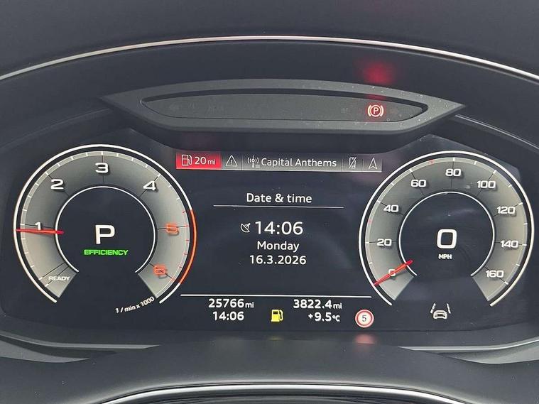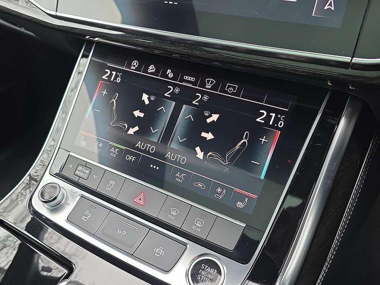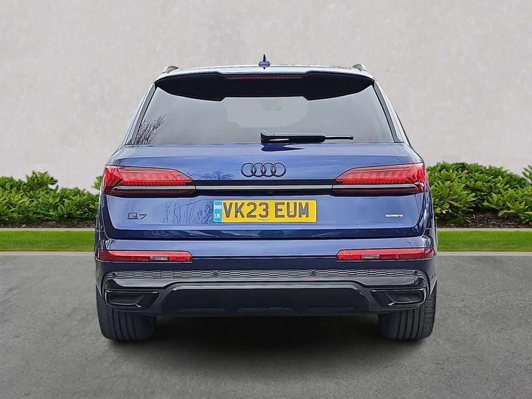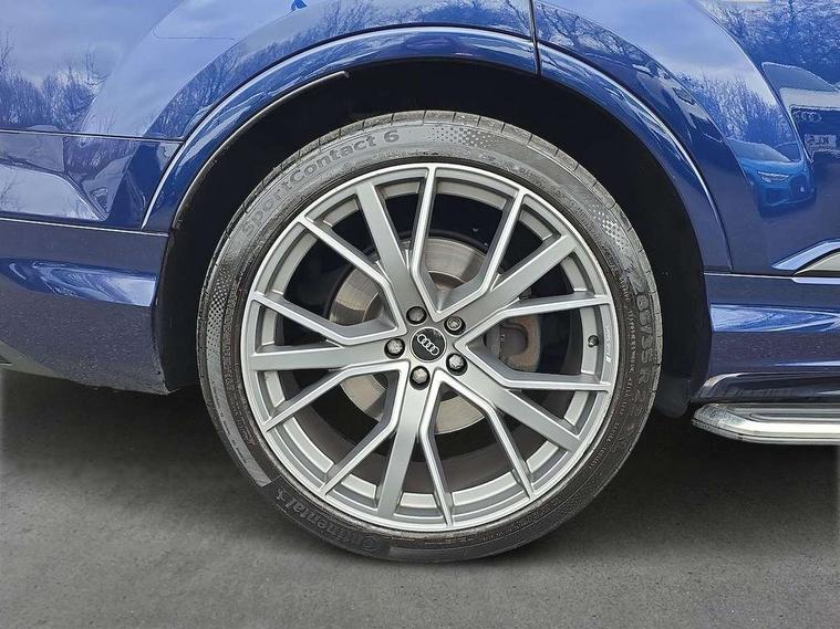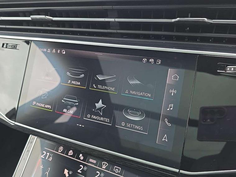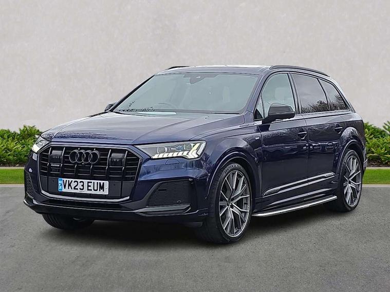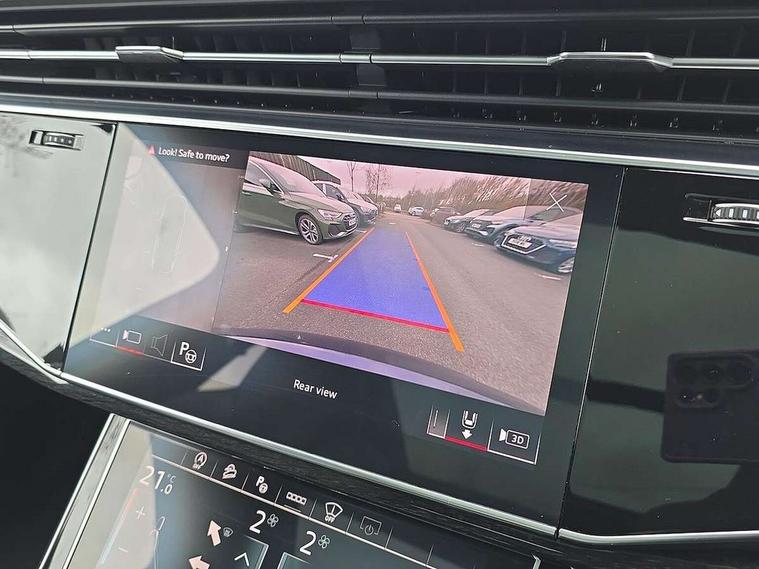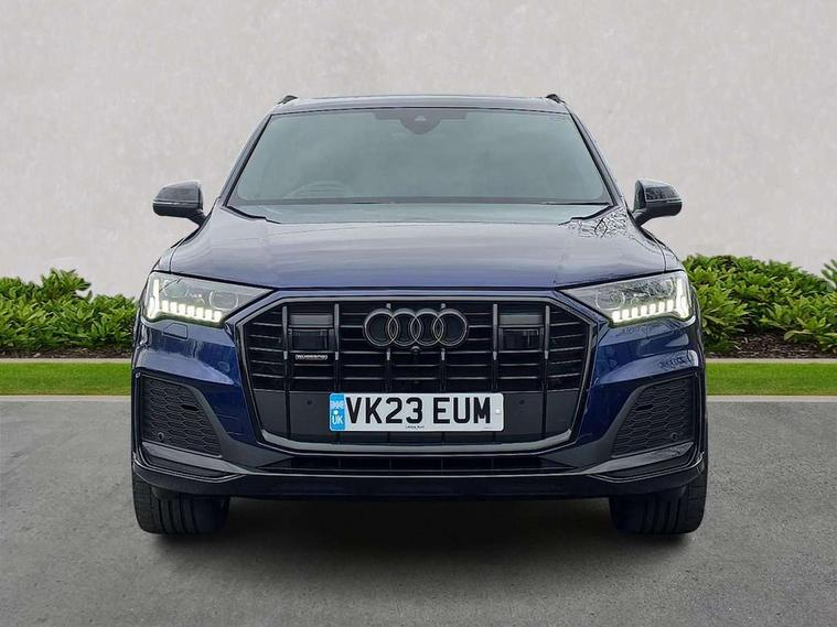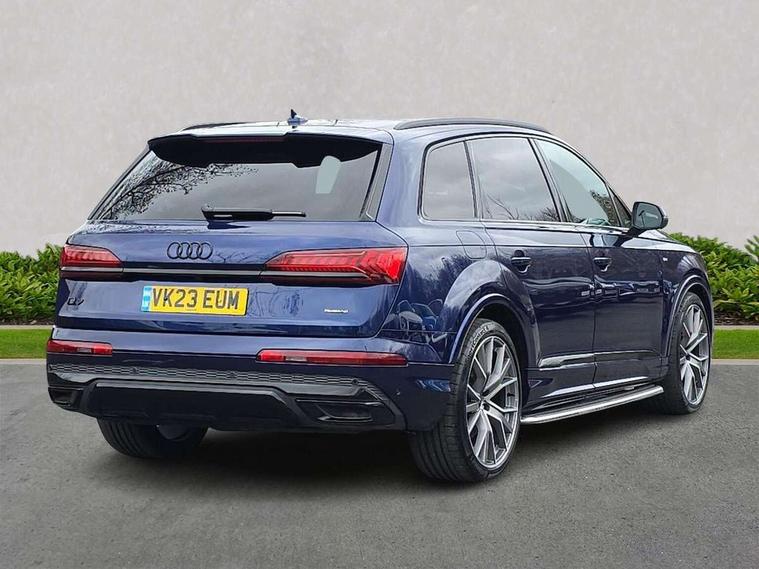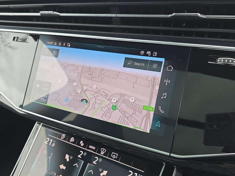 All wheel steering, Audi connect safety and service (e-call), Audi connect with Amazon Alexa Integration, Audi drive select (Auto, Comfort, Dynamic, Efficiency, Individual, Off-road and All road), Audi virtual cockpit - 12.3" high-resolution LCD display with fully customisable instrument cluster, Bluetooth interface, Camera based traffic sign recognition, Head up Display, MMI navigation plus with MMI touch screens includes 10.1" and 8.6" screens with haptic feedback, Natural voice recognition, Power door closure, Power operated tailgate, Smartphone interface includes wireless Apple carplay/Android Auto, Start/stop system, 48V Mild hybrid technology, Adaptive air sports suspension, Quattro all wheel drive with self locking centre differential, 2 USB-C ports with charging functionality in the rear, Audi music interface - front 2 USB-C ports with charger and data functions, DAB digital radio module, 3rd brake light, Audi Beam uses LEDs to project Audi logo onto the ground as you exit your Q7, Audi HD matrix LED headlights with Audi laser light + dynamic front and rear indicators, Auto dimming frameless rear view mirror, Black roof rails, Bumpers in contrast paint scandium grey finish includes door trim and wheel arch trim strips, inlays in door strip contain quattro embossing, Electric panoramic glass sunroof, Electrically adj heated/folding + automatically dimming exterior mirrors with memory + automatic kerb side function for passenger side exterior mirror, Gloss black finish for exterior Audi rings and Q7 logos without engine badging, Headlight washers, Heat insulating glass in windshield, Integrated LED indications in door mirrors, LED daytime running lights, LED rear tail lights, Privacy glass - dark tinted rear and rear side windows from B-pillar backwards, Rear side wing doors, Rear wiper, Side running boards, 2 seat bench in 3rd row, 3 seat bench in 2nd row, 3 spoke heated leather multi-function steering wheel including paddle shift, 4 zone deluxe automatic climate control, 7 seat layout with ISOFIX points for the front passenger seat and rear passenger seat, Black dinamica headlining, Comfort front centre armrest, Double sun visors with illuminated vanity mirrors, Electric adjustable front seats/backrest bolsters, lumbar support, memory functionality, Folding rear seats, Front head restraints, Front/rear floor mats, Heated front and outer rear seats for second row, Illuminated door sill trims with S logo, Luggage compartment cover, Manual sunblind for the rear side windows and manual sunblind for the rear window, Rear head restraints, Seat ventilation and massage function in the front, Single front passenger seat, Stainless steel pedals, Valcona leather upholstery with front super sport seat S embossed logo, Anthracite black styling pack - Q7/SQ7, City assist pack - Q7, Comfort and sound pack with Bang + Olufsen premium sound system - Q7, Extended leather pack - Q7, Tour pack with Adaptive cruise assist - Q7, 3 point seatbelts on all rear seats, Audi pre sense front, Child locks on rear doors, Driver and front passenger, front side and curtain airbags, Electromechanical parking brake, Electronic Stabilisation Control (ESC) including ABS, ASR and EDL, Extended pedestrian protection measures, Hill hold assist, Seatbelt monitoring, Tyre pressure loss indicator, Warning triangle and first aid kit, Anti theft alarm, Anti-theft wheel bolts and wheel loosening detection, Remote central locking, Polished oak trim with grey finish inlay, Tool kit, Tyre repair kit,