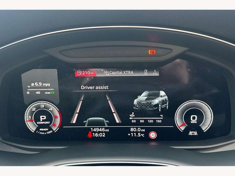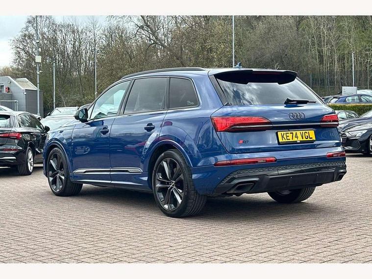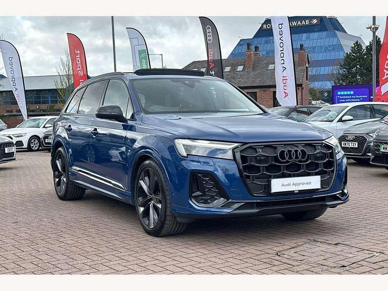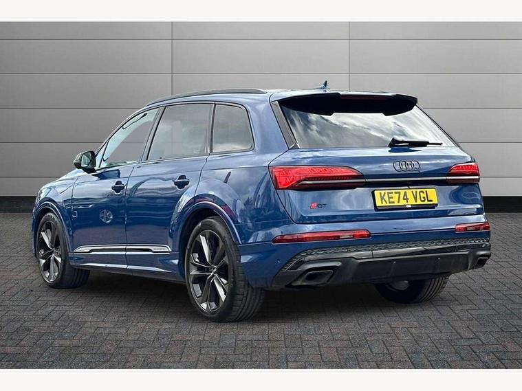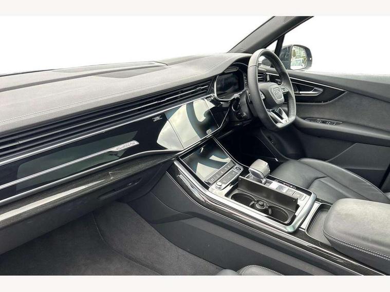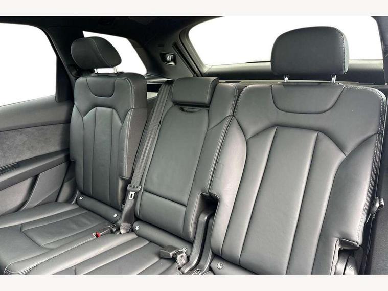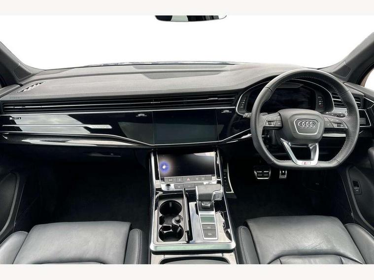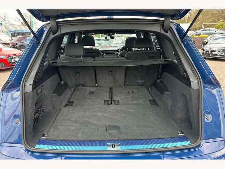 Audi connect safety and service (e-call), Audi connect with Amazon Alexa Integration, Audi drive select (Auto, Comfort, Dynamic, Efficiency, Individual, Off-road and All road), Audi phone box light with wireless charging, Audi virtual cockpit - 12.3" high-resolution LCD display with fully customisable instrument cluster, Bluetooth interface, Camera based traffic sign recognition, Electromechanical power steering, MMI navigation plus with MMI touch screens includes 10.1" and 8.6" screens with haptic feedback, Natural voice recognition, Operating buttons in Matte black, Parking system plus with 360 degree display (front, rear and side sensors) - acoustic and visual park assist system, Power operated tailgate, Rear view camera, Smartphone interface includes wireless Apple carplay/Android Auto, Start/stop system, 48V Mild hybrid technology, Adaptive air sports suspension, Quattro all wheel drive with self locking centre differential, Audi music interface - front 2 USB-C ports with charger and data functions, Audi sound system with 6 channel amplifier, 180 watt amplifying capacity and 10 loudspeakers including subwoofer, DAB digital radio module, Audi Beam uses LEDs to project S emblem with red rhombus onto the ground when opening the side doors (front/rear), Auto dimming frameless rear view mirror, Black exhausts, Black roof rails, Electrically adj heated/folding + automatically dimming exterior mirrors with memory + automatic kerb side function for passenger side exterior mirror, Heat insulating glass in windshield, Integrated LED indications in door mirrors, LED 3rd brake light, LED daytime running lights, LED rear tail lights, Loading edge protection in stainless steel, Matrix LED headlights with dynamic front and rear indicators, Privacy glass - dark tinted rear and rear side windows from B-pillar backwards, Rear side wing doors, Rear wiper, 2 seat bench in 3rd row, 2 zone automatic climate control, 3 seat bench in 2nd row, 7 seat layout with ISOFIX points for the front passenger seat and rear passenger seat, Black cloth headlining, Comfort front centre armrest, Electric adjustable front seat with 4 way lumbar support, driver memory functionality, Folding rear seats, Front head restraints, Front/rear floor mats, Heated front seats, Illuminated door sill trims with S logo, ISOFIX child seat mounting for front passenger seat and 2 outer rear seats with top tether child seat mounting for all 3 rear seats, LED interior ambient lighting, Luggage compartment cover, Luggage compartment sill protection in stainless steel, Rear head restraints, Single front passenger seat, Stainless steel pedals, Sunvisors with illuminated vanity mirrors, Black styling pack plus - Q7, 3 point seatbelts on all rear seats, Audi pre sense front, Child locks on rear doors, Convenience key with safelock and gesture tailgate, Driver and front passenger, front side and curtain airbags, Electromechanical parking brake, Electronic Stabilisation Control (ESC) including ABS, ASR and EDL, Extended pedestrian protection measures, Hill hold assist, Seatbelt reminder, Tyre pressure loss indicator, Warning triangle and first aid kit, Anti theft alarm with tow away protection, Anti-theft wheel bolts and wheel loosening detection, Keyless Go, Remote central locking, Polished oak trim with grey finish inlay, Tool kit, Tyre repair kit,