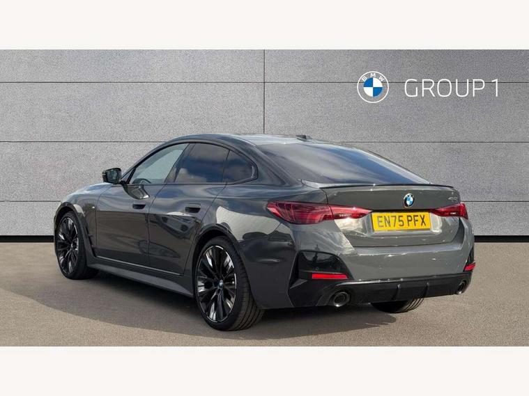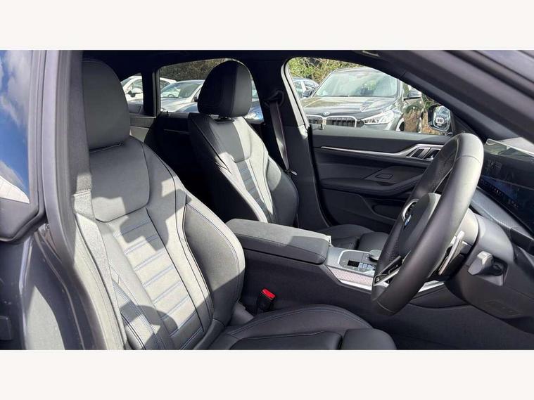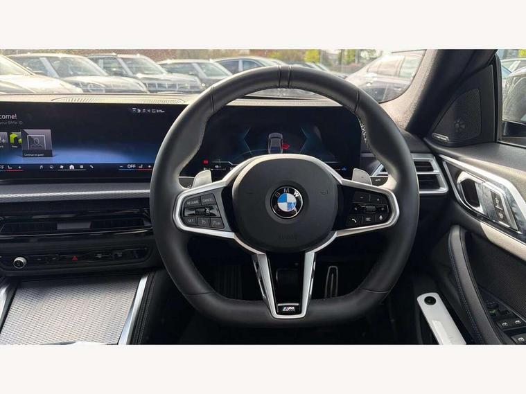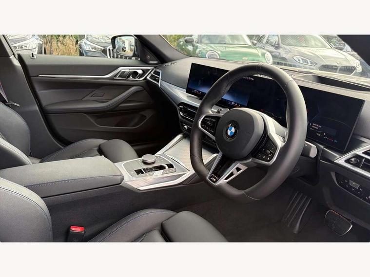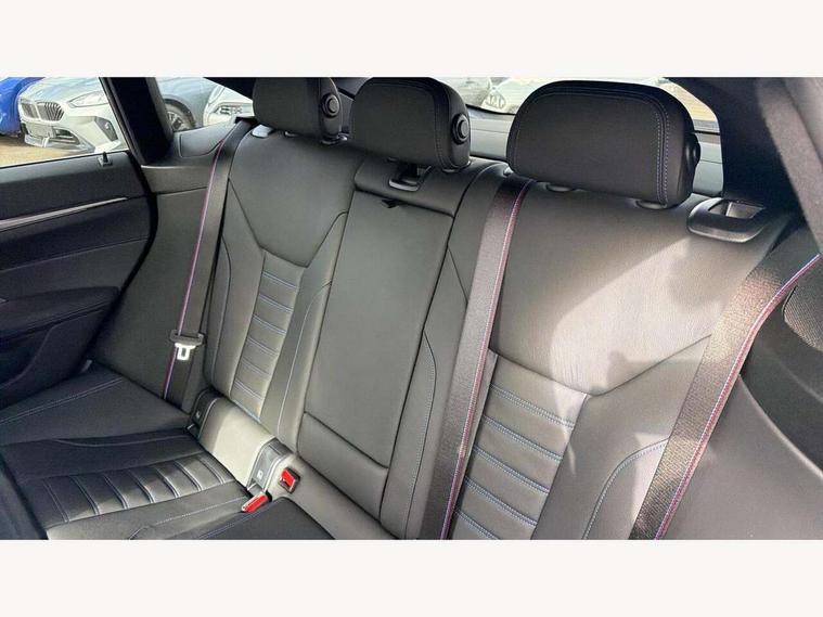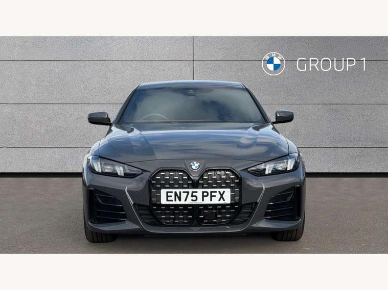 Active guard plus, Attentiveness assist, Automatic start/stop function, BMW ConnectedDrive online services, BMW iDrive controller on centre console, BMW service history, BMW Teleservices, Brake pad wear indicator in front and rear, Check Control warning system for monitoring of lights and door/luggage compartment open warning, Condition based service, Electric bootlid, Electric power steering with Servotronic steering optimised at all speed ranges, Instrument cluster with speedometer with mph readout, tachometer, fuel gauge and oil temperature gauge, Integrated owners handbook, Language version English, Oil sensor for level and grade, On board computer - average speed, fuel consumption, outside temp display with acoustic warning, clock/date, service interval, odometer/trip meter, Run flat indicator, Shifting point display, Start/stop button in black, Variable sport steering, 8 speed automatic steptronic transmission with gearshift paddles, Balanced 50/50 weight distribution, Double joint spring strut front axle, Drive experience mode switch - Comfort mode, ECO PRO mode and SPORT mode, Electronic differential lock control (EDLC), Low centre of gravity, Petrol Particulate Filter, Stroke dependent dampers, DAB tuner, Personal eSim, Acoustic glazing, Automatic headlight beam throw control with load dependent regulating reaction, dynamic compensation of braking dive and acceleration squat, Automatic windscreen wipers and automatic headlight, BMW radiator grille with mesh grille, end face of the nuggets in aluminium matt and frame in chrome matt, Body colour fuel filler flap, Body colour roof fin, Bonnet and tailgate badge, Electric folding wing mirrors - Driver side electrochromic, auto anti dazzle function & front passenger side auto parking function without anti dazzle, Electric windows - front and rear, with open/close fingertip control, anti trap facility and comfort closing function all round, Follow me home headlights, Front and rear bumper system, Front apron plastic in body colour, Green tinted heat protection glazing, Illuminated bow type door handles in body colour drivers side with door lock, Interior rear view electrochromatic mirror with automatic anti dazzle function, LED 3rd brake light, LED daytime running lights, LED front fog lights, LED front indicators, Licence plate panel integrated into front bumper and tailgate, Low and high beam headlights in Bi-LED, M designation on front side panels, left and right, M Sport entry door sill strips, One piece front bumper cover including towing eye cover in body colour, Preparation for high beam assistant, Rear side wing doors, Rear wiper, Reversing light, Side frame trim strip black matt, Two part LED tailights in L-shape with components in smoked glass, brake light, LED turn indicator and rear fog light, Visible exhaust tailpipe finisher, Visible VIN plate, Welcome lights in interior and door handle area, Widened track and increased camber values for max transverse dynamics, agility and steering precision, Windscreen washer jets concealed underneath bonnet, 12V power socket in front centre console, 2 front cupholder in centre console with clamping elements and matt black inlay, 3 rear headrests, 3 seat bench in 2nd row, 3 spoke flat bottom M sport leather multifunction steering wheel, 3 zone automatic air conditioning, 4 pieces lashing eyelets in luggage compartment, 40:20:40 split folding rear seat, folding head restraint of centre seat and rear centre armrest with two cupholders, Anthracite headlining, Armrest integrated in front and rear door trim + front centre console armrest, Battery in luggage compartment, BMW ID, Extended storage - 2x Dual USB Type C 3A charging function in the rear centre console for the rear, Extended storage - Luggage compartment partition net on left side trim panel, Bag hook on both sides of the luggage compartment, Extended storage - Multifunction hook, Extended storage - Trailer tow hitch button in black (extendable trailer tow hitch) on the right hand side, Four grab handles integrated in roof lining, Front and rear door pockets, Front footwell lights, Heated driver and front passenger seats, Height adjustable front headrests, Illuminated armrest storage compartment, Illuminated glove compartment with separate small compartment, Interior light and front reading light, Luggage compartment light, Single front passenger seat, Steering column adjustment - Infinitely variable in height and length, Sunvisors with illuminated vanity mirrors and ticket pocket, Through load system, Toolkit located in luggage compartment, Velour front floor mats, Ambient lighting pack - 4 Series, BMW Live Cockpit Plus pack - 4 Series, Connected professional package - 4 Series, M High gloss shadowline exterior trim pack - 4 Series, M sport exterior styling pack - 4 Series, Park assist pack - 4 Series, 3 point seatbelts on all seats, BMW emergency call, Brake energy regeneration, Braking pre-tensioning, Child locks, Child seat ISOFIX attachment for the two outer rear seats, Crash sensor activating of airbags, Unlocking doors, hazard warning lights, interior light, safety battery terminal, Driver and front passenger side airbags, integrated in the door side seat backrest bolsters for all seat variants, Driver/Front Passenger airbags, Dry braking, Dynamic brake control, Dynamic stability control + (DSC+) - Anti-lock Braking System (ABS) with brake assist and cornering brake control + Automatic Stability Control (ASC), Dynamic Traction Control - DTC, Electric parking brake including automatic hold function and automatic release of the parking brake when driving off, Front and rear ventilated brake disc, Front passenger manual airbag deactivation, Head airbags for all 4 outer seats, Hill start assistant, Seat belt security check for driver and front passenger, Seat belt with belt stopper, pyrotechnic belt tensioners and belt force limiters, Seat occupancy detection for driver and passenger side, Side impact protection, Tyre pressure 