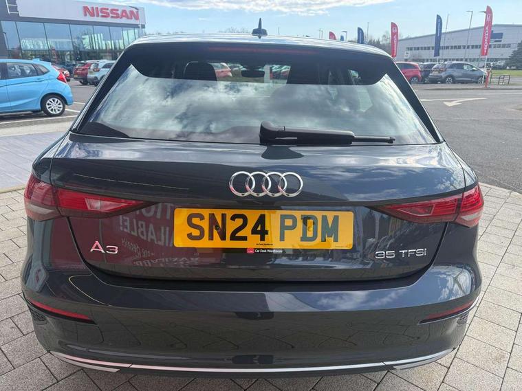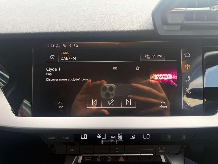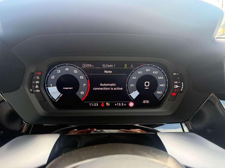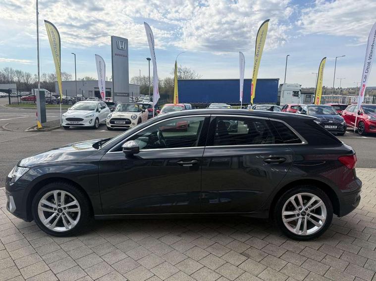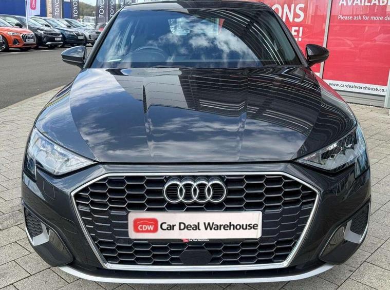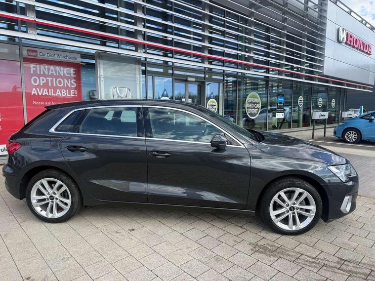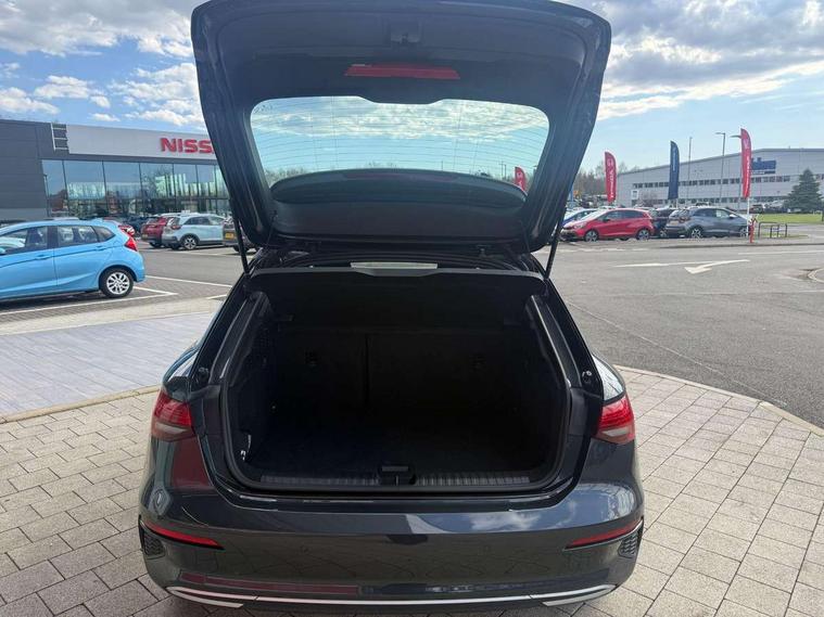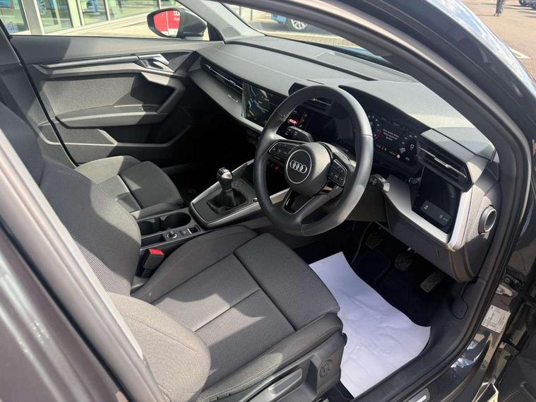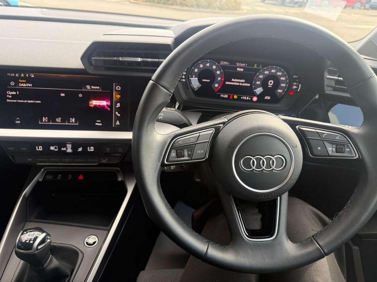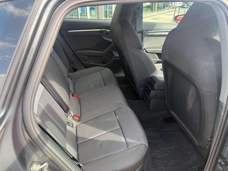 Audi drive select (Auto, Comfort, Dynamic, Efficiency and Individual), Audi smartphone interface, Audi Virtual Cockpit - 10.25" digital and colour instrument cluster, Automatic start/stop system with recuperation, Bluetooth interface, Camera based traffic sign recognition, Collision avoidance assistant, Cruise control, e-Call (emergency call), Electromechanical power speed sensitive steering, Lane departure warning system, MMI Navigation Plus with high resolution 10.1" colour touch screen display, Rear parking sensors, Service indicator, Trip computer, Voice control system with natural language interaction, Standard suspension, 2xUSB-C connection with data and charging functions, 6 passive loudspeakers, DAB Digital radio, 3rd brake light, Acoustic glass windscreen, Aluminium window trim, Auto dimming frameless rear view mirror, Body colour exterior mirrors, Body colour roof spoiler, Electrically adjustable/heated/folding/auto dimming door mirrors with integrated LED indications + kerb view function for passenger side, Front electric windows, LED daytime running lights, LED headlights and halogen rear lights, Light and rain sensors, Rear electric windows, Rear side wing doors, Rear window, rear door windows and rear side windows in clear glass, Rear wiper, 12V socket and storage compartment in front centre console, 3 seat bench in 2nd row, 3 spoke leather multifunction steering wheel, 4 way electrically adjustable lumbar support for driver and front passenger, 60/40 split folding rear seat bench, Dual zone electronic climate control, Front and rear headrests, Front centre armrest, Front door sill trims with aluminium inlay, Front/rear floor mats, Height and reach adjustable steering wheel, Interior lighting - Front and rear roof module including reading lights, glove compartment light and right hand side, Interior lighting - glove compartment light and right hand side, Luggage compartment floor covering, Manual boot compartment lid, Manually adjustable front seats, Routine cloth upholstery with front sports seats, Seat side bolsters, Single front passenger seat, Steel grey cloth headlining, Aluminium interior elements pack - A3 Sportback, LED interior lighting pack - A3 Sportback, Sport styling pack - A3 Sportback, 3x3 point rear seat belts, Driver and front passenger airbag with passenger airbag deactivation, Electronic Stabilisation Control (ESC) including ABS, ASR and EDL, First aid kit with warning triangle and 2 safety vests, Front side airbags with head airbags and interaction airbag, Pre-sense front with pedestrian and cyclist detection, Seatbelt monitoring, Tyre pressure loss indicator, Anti theft alarm, Anti-theft wheel bolts, Electronically operated child locks, Immobiliser, Remote control central locking, Inlays with silk effect paint in platinum grey,