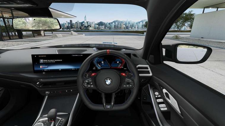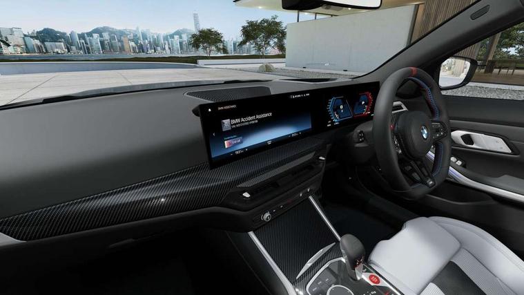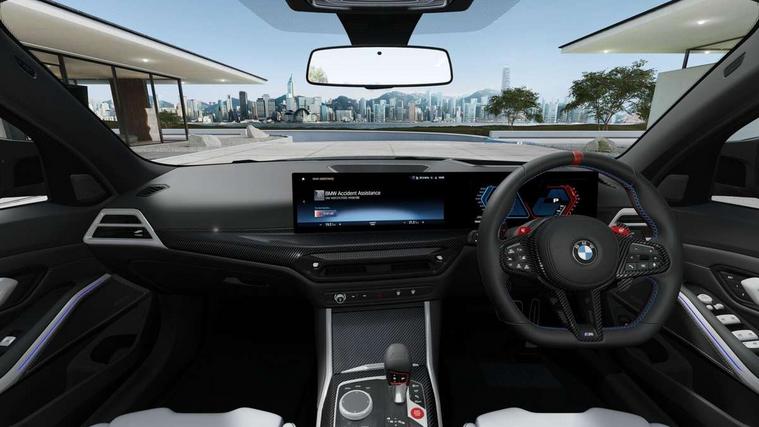 Active Guard, Automatic start/stop system, BMW ConnectedDrive online services, BMW legal emergency call, BMW Live Cockpit Pro with Head up display including 12.3" instrument display and 14.9" high resolution control display with navigation function, BMW Teleservices, Brake pad wear indicator warning light, Condition based service, Cruise control with braking function, Door/boot open warning light, Electric boot lid, Electric Power Steering (EPS) with Servotronic, Language version English, Lights on warning, M drive buttons, Oil sensor for level and grade, warning by check control system, Oil temperature gauge, On board computer, On board diagnostics, Optimum shift indicator, Outside temperature display, Park distance control, Pull away assistant, Run flat indicator, Service interval indicator, Shifting point display, Smartphone integration, Speed limiter, Start/stop button in red, Variable sport steering, Double joint spring strut front axle, Electronic differential lock control (EDLC), M Adaptive suspension, M Drive Professional including track mode, laptimer, traction control & Drift analyser, M Sport differential, Safety battery terminal clamp, Sport automatic transmission with gearshift paddles, Auxiliary point for auxiliary devices, DAB radio with bluetooth music capability, Harman kardon surround sound audio system, Personal eSim, Auto dimming driver's door mirror, Automatic headlights + automatic windscreen wipers, Automatic parking function on front passenger's exterior mirror, Black model designation badges, BMW high gloss shadow line with extended contents, BMW radiator grille, frameless, with horizontal double blind slats, black high-gloss, with model badge, Body colour bumpers, Bonnet and tailgate badge, Carbon fibre reinforced plastic (CFRP) roof, Day time running light, Door mirror integrated indicators, Door sill finishers with aluminium inserts, Dynamic brake lights, Electric adjustable heated door mirrors, Electric folding door mirrors, Electrochromic exterior driver side mirror, Electrochromic interior rear view mirror with automatic anti-dazzle function, Entry sills with aluminium inserts and model badge, Follow me home headlights, Front and rear bumper system, Front and rear plastic apron in vehicle colour, Front door sill strips in aluminium inlays with M3 inscription, Front electric windows with open and close fingertip control, anti trap facility and comfort closing, Headlight beam throw control, Heat protection, sun protection glazing, Heated washer jets, High gloss black lower bumper edges, side sills and diffuser edge binding, High gloss black M roof rails, LED 3rd brake light, LED tail lights with 3D L-shaped LED light design, M designation, Mirror glass aspheric on driver's side, convex on passenger side, Rain sensor, Rear fog lights, Rear reflectors, Rear side wing doors, Rear wiper, Reversing light, Roof fin and roof trim strips in Black high-gloss, Shark fin roof aerial, Strakes in front side panel, black matt/high-gloss black, with model badge, Visible VIN plate, Welcome lighting, 2 cupholders in front centre console, 2 cupholders in rear armrest, 2 rear head restraints, 2 x 12 V Power sockets (luggage compartment and front centre console), 2 x USB Type C ports for charging and data transmission in front centre console, 3 seat bench in 2nd row, 40:20:40 split folding rear seat with loading system, Ambient inside door handle light, Ambient lighting for storage compartment, Ambient lighting front and rear, Anthracite headlining, Battery in luggage compartment, Centre console armrest with storage compartment, Contour lighting for door trim, Driver/passenger sunvisors with ticket holders + illuminated vanity mirrors, Driving experience mode switch, Dual zone automatic air conditioning, Dynamic ambient interior lighting, Electric front seats + driver memory, English handbook, Floor mats in velour, Front and rear door exit lights, Front door storage bins with bottle holder, Front footwell ambient lighting, Front interior light, Front isofix attachment + airbag deactivation, Front reading light, Front seat backrest width adjustment, Front/rear door armrests, Heated front seats, Height adjustable front headrests, Illuminated bow-type door handles in vehicle colour, driver's side with door lock, Interior mirror lighting, Isofix on 2nd row outer seats, Lockable/illuminated glovebox, Luggage compartment lighting, M Sport seats with with illuminated model designation, Multifunction steering wheel, Rake/reach adjustable steering wheel, Single front passenger seat, Storage compartment in rear doors, Storage tray and compartment with cover in centre console, Through loading system, Toolkit located in luggage compartment, Waterfall lighting for central air vent, Wireless charging tray, Connected package professional - M3, Extended storage pack - M3/M4, High gloss shadowline exterior trim pack - M3, 3 point seatbelts on all seats, ABS/EBD, Automatic Stability Control (ASC), Brake energy regeneration, Brake fade compensation, Compound structure brake discs, Cornering brake control (CBC), Crash sensor, Curtain airbags, Driver/Front Passenger airbags, Dry braking, Dynamic brake control, Dynamic stability control + (DSC+), Dynamic Traction Control - DTC, Electromechanical parking brake, Front and rear head airbags, Front seat side impact airbags, Front seatbelt pretensioners + load limiters, Hill start assist, M Sport seat belts, Rear child proof door locks, Seat occupancy detection for driver and passenger side, Seatbelt warning, Side impact protection, Two tone horn, Tyre pressure sensor, Warning triangle and first aid kit, Centre lock switch, Closing system with central locking, Electronic immobiliser, Locking wheel bolts, Remote central locking, Thatcham cat 1 remote alarm, Vehicle Key with 4 buttons including the integrated key, Galvanic embellisher for controls, Tyre repair kit,