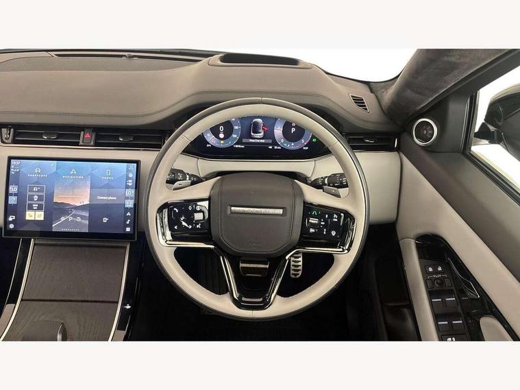 11.4" touch screen, 3D 360 degree surround camera with wade sensing, Adaptive cruise control, Android Auto, Apple car play, Blind spot assist, Bluetooth connectivity, Brake pad wear indicator warning light, Driver condition monitor, eCall emergency system, Eco mode, Electronic power assisted steering (EPAS), Front and rear parking aid, Head up Display, InControl remote, Interactive driver display, Land Rover InControl apps, Lane keep assist, Pivi pro connected includes diamond pivi variant, smart settings, connected navigation pro, nuance speech licence, Powered tailgate/boot lid, Rear collision monitor, Rear traffic monitor, Traffic sign recognition with adaptive speed limiter, Voice control system, Wireless device charging, Adaptive dynamics, All terrain progress control, Configurable dynamics, Diesel exhaust fluid (DEF) large tank, Efficient Driveline, Large fuel tank, Terrain Response 2, Digital Audio Broadcast radio-DAB, Steering wheel mounted controls, Acoustic laminated windscreen, Auto headlights, Automatic headlight levelling, ClearSight interior rear view mirror, Electric windows with one touch open/close and anti trap, Flush deployable exterior door handles, Front and rear recovery eyes, Front fog lights, Heated rear window with timer, Heated washer jets, Heated windscreen, Pixel LED headlights with signature DRL and LED tail Lights, Power fold, auto-dimming, heated door mirrors with approach lights and auto dimming driver side, Rain sensing windscreen wipers, Range rover branding illuminated metal tread plates in loadspace and row 1 with brand name script and metal in row 2, Rear animated directional indicators, Rear fog lights, Rear side wing doors, Rear wiper, Side repeater indicators in mirror, Sliding panoramic roof with powered sunblind, Tailgate spoiler, Third brake light, Winter wiper park position, 14 way driver memory electric front seats with 2 way manual headrests + 4 way lumbar support, bolsters, 40:20:40 split folding rear seats with centre headrest and armrest, Ambient interior lighting, Bright metal pedals, Cabin Air Purification plus, Configurable cabin lighting, Customer configurable single point entry, Electrically adjustable steering column with memory function and easy entry/exit, Front and rear cupholders, Heated and cooled front seats, Heated rear seats, Heated steering wheel, Isofix system on outer rear seats, Overhead lighting console, Overhead stowage for sunglasses, Passive front head restraints, Premium carpet mats, Rear air vents, Rear head restraints, Satin chrome gearshift paddles, Single passenger seat, Sunvisors with illuminated vanity mirrors, Twin sliding front centre armrest, Online pack with data plan - Evoque, Power socket pack 2 - Evoque, 3 rear 3 point seatbelts, Anti-lock braking system (ABS), Brake hold function, Customer configurable autolock, DSC - Dynamic Stability Control, Electronic brake force distribution, Electronic parking brake, Electronic traction control, Emergency braking, Front and rear seatbelt reminder, Hill descent control, Hill launch assist, Low traction launch, Occupant protection assist, Passenger seat occupant detector, Power operated child locks, Roll stability control, Six airbags - Driver and passenger airbags/driver knee airbag/front side airbag and curtain airbags, Torque vectoring brake, Tyre pressure monitoring system, Alarm, Immobiliser, Intrusion sensor, Keyless entry, Locking wheel nuts, All season tyres,