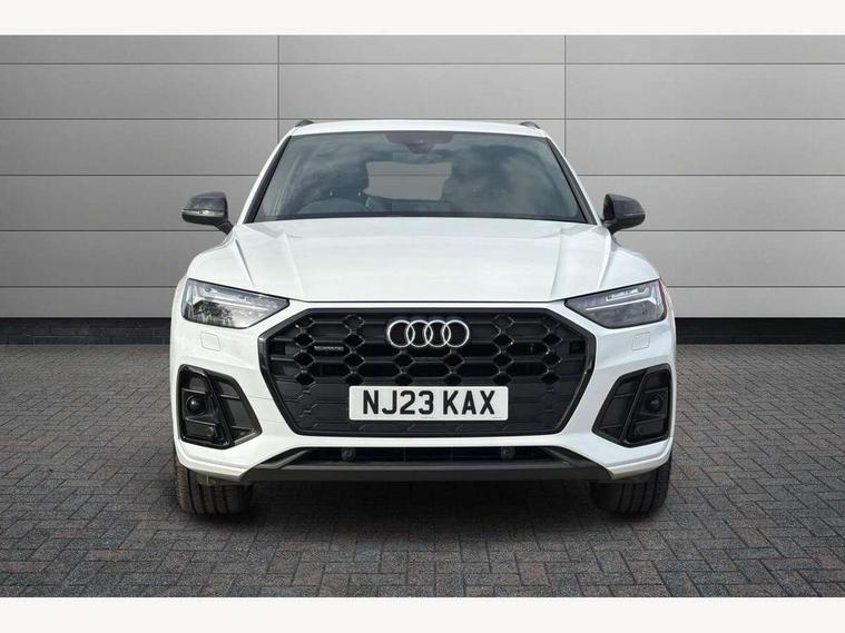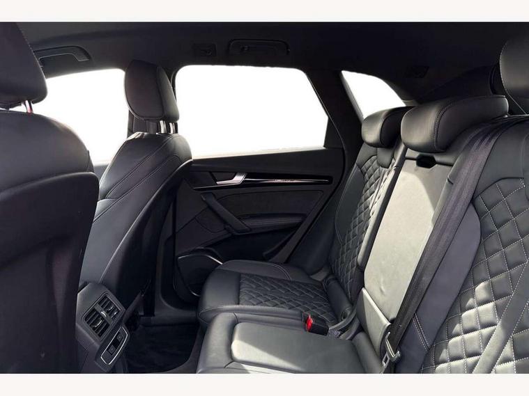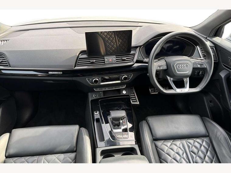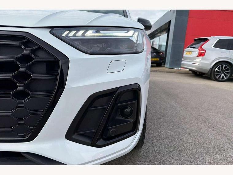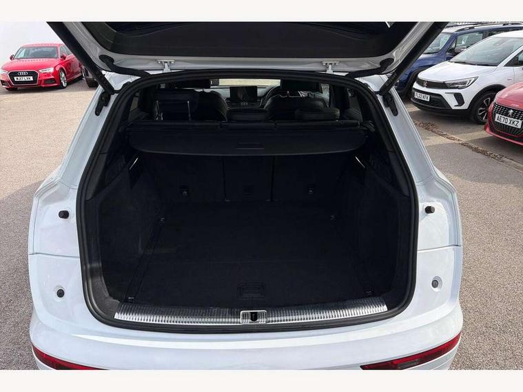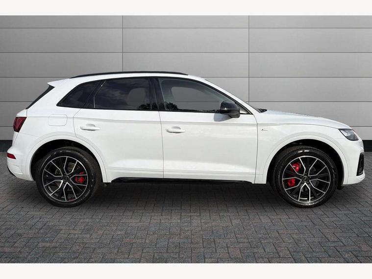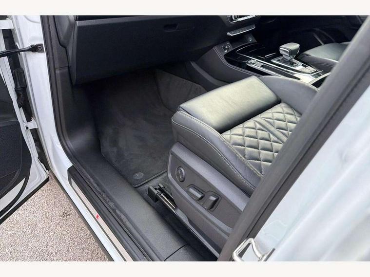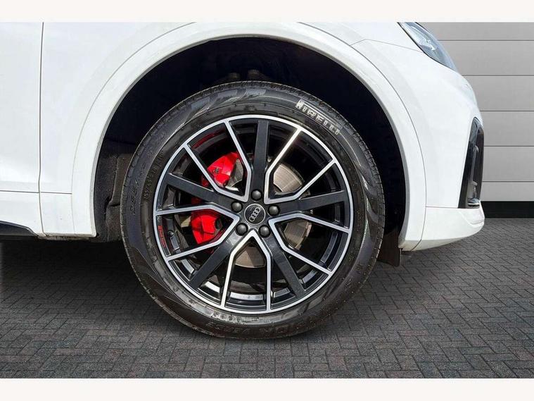 Acoustic front and rear parking sensor, Audi connect safety and service (e-call), Audi connect with Amazon Alexa Integration, Audi drive select, Audi virtual cockpit plus with 12.3" screen and three different layout designs, Audi wireless smartphone interface, Automatic start-stop system with coasting functionality and efficiency programme, Bluetooth interface, Electro - mechanical power assisted steering, MMI navigation plus with 10.1" touch screen, Power tailgate, Reversing camera, Service interval indicator, Voice control system with Audi hotword activation "Hey Audi", Diesel particulate filter, Quattro on demand, S line sports suspension, 8 loudspeakers, DAB Digital radio, Acoustic windscreen, Audi matrix LED headlights with dynamic front and rear indicators, Audi rings at front and rear in black, Audi rings decal on rear doors, Auto dimming door mirrors, Auto dimming frameless rear view mirror, Automatic headlight adjustment, Automatic headlights and windscreen wipers, Black roof rails, Body colour bumpers, Body colour underbody protection, Chrome plated exhaust trims, Daytime running lights, Door sills in Selenite silver, Electric adjustable/heated/folding door mirrors, Front air inlet surrounds in anthracite black, Front and rear electric windows, Headlight washers, High gloss black B pillar trims and triangular rear door trim, High level LED brake light, Rear chrome trim strip below lights, Rear privacy glass and rear side windows, Rear side wing doors, Rear wiper, Roof bars, S Line rear spoiler, 2 x USB charging port with aux input socket, 3 rear headrests, 4 way electric lumbar support for driver and front passenger, 40:20:40 split folding 3 rear bench seat in 2nd row with rear centre armrest, Black cloth headlining, Comfort front centre armrest, Contrast stitching on seats, steering wheel and gear lever gaiter, Deluxe 3 zone electronic climate control, Electrically adjustable front seats, Fine Nappa leather upholstery with diamond pattern contrast stitching + front sport seats with S embossed logo, Front/rear floor mats, Gear lever in black leather, Heated front seats, Height adjustable front head restraints, Height/reach adjustable steering column, Illuminated door sill trims with S logo, Luggage compartment cover, Rear seat bench plus-adjust for forwards/backwards position/backrest angle, cupholders in the armrest, load through hatch and remote backrest release, Removable luggage compartment floor, Single front passenger seat, Stainless steel pedals, Sunvisors with vanity mirrors, Black styling package - Q5 Edition 1, Extended interior upholstery pack - Q5, Extended LED Interior multi coloured Lighting Pack - Q5, 3 point seatbelts on all seats, 6 airbags - Driver, front passenger, curtain and side airbags, Electrically operated child locks on rear doors, Electromechanical parking brake, Electronic stabilisation control including ABS, ASR and EDL, First aid kit with warning triangle and vests, Front and rear brake calipers painted in red, Front passenger airbag deactivation, Hill descent control, Hill hold assist, ISOFIX child seat mounting for front passenger seat and ISOFIX child seat mounting with Top Tether for outer rear seats, Multi collision brake assist, Pop-up bonnet for pedestrian protection, Pre sense city, Seat belt force limiter, Seatbelt monitoring, Tyre pressure warning, Anti theft alarm, Anti-theft wheel bolts, Keyless Go access/ignition system, Remote central locking, Air vents inserts and centre console in gloss black, Piano black finish inlay,
