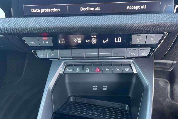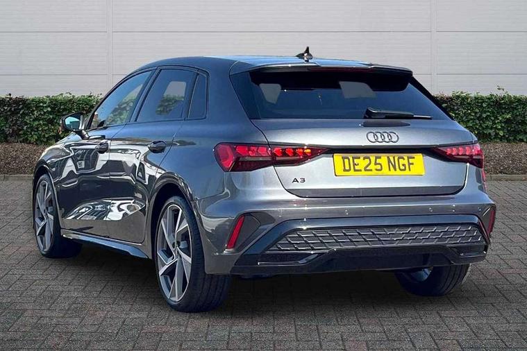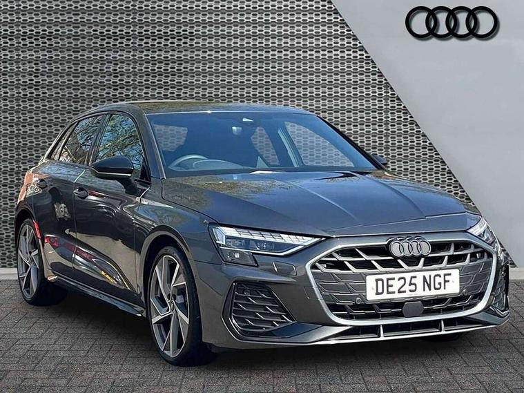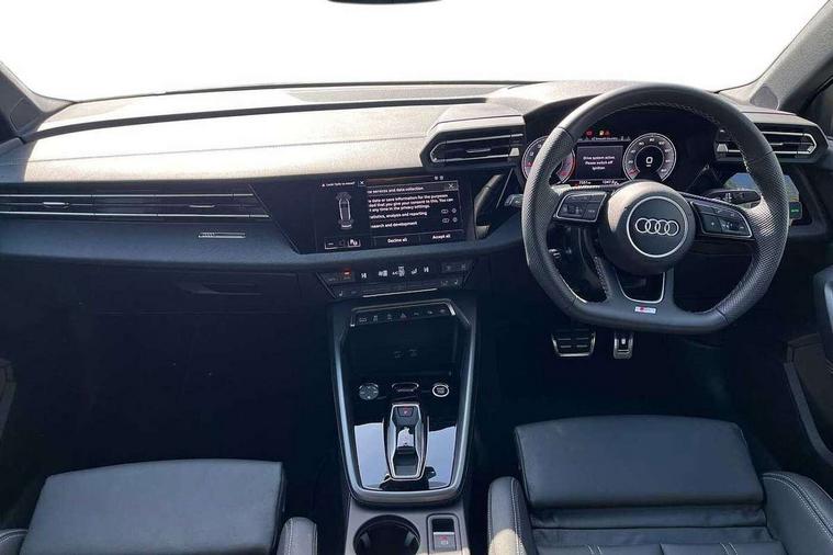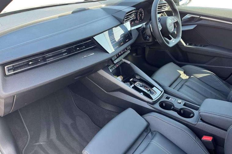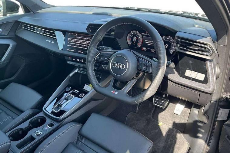 Adjustable speed limiter, Audi drive select, Audi smartphone interface with app store includes wireless Apple carplay, Android auto and Amazon alexa integration, Audi virtual cockpit plus - 12.3" full HD resolution dynamic digital instrument cluster, Automatic start/stop system with recuperation, Bluetooth interface, Camera based traffic sign recognition, Collision avoidance assistant, Cruise control, Distraction and Fatigue warning, e-Call (emergency call), Electromechanical power speed sensitive steering, Emergency assist, Lane departure warning system, MMI Navigation Plus with high resolution 10.1" colour touch screen display, Park Assist with parking system Plus, Service indicator, Tailgate, Trip computer, Voice control system with natural language interaction, Sports suspension, Audi Phonebox light with wireless charging, Audi sound system - 10 loudspeakers including centre loudspeaker and subwoofer, DAB Digital radio, USB ports with charging function in the rear, Acoustic glass windscreen, All weather light, Anthracite grey Audi rings (front and rear), Audi beam uses LEDs to project the Audi logo onto the ground as you exit your A3, Auto dimming frameless rear view mirror, Automatic dynamic range control, Black accents front and rear bumpers, Black accents in the area of the Audi single frame grille, Black accents window trims strips, Dipped beam, main beam, position light and turning light, Electrically adjustable/heated/folding/auto dimming door mirrors with integrated LED indications + kerb view function for passenger side, Exterior model badging, Front and rear side air inlets in grained matt black with dark liquid chrome frame, Front electric windows, Heat insulating glass windscreen, Illuminated door sills with aluminium inserts at the front with S logo, Intersection light, LED 3rd brake light, LED brake lights, LED daytime running x3, LED headlights with LED rear lights and dynamic rear indicators, LED rear number plate lights, LED reverse light, LED tail lights, Light and rain sensors, Manoeuvring light, Motorway light, Privacy glass - dark tinted rear window, rear door and side windows, Rear diffuser and grill in grained matt black with inlay in dark liquid chrome, Rear electric windows, Rear side wing doors, Rear wiper, S roof spoiler, Static cornering light, 12V socket and storage compartment in front centre console, 3 seat bench in 2nd row, 3 spoke flat bottomed leather multifunction sport steering wheel with gear shift paddles, 3-zone deluxe automatic air conditioning, 4 way electrically adjustable lumbar support for driver and front passenger, 40/20/40 split folding rear seat bench, Black cloth headlining, Black front and rear floor mats, Front and rear centre armrest in artificial leather with contrasting stitching on armrests and instrument panel, Front and rear headrests, Heated front seats, Height and reach adjustable steering wheel, Manual boot compartment lid, Manually adjustable front seats, Rear centre armrest with cupholder, S badging on the steering wheel, Seat side bolsters, Single front passenger seat, Stainless steel pedals and front footrest in black, Twin leather upholstery with front sports seats S embossed logo, Aluminium interior elements pack - A3, 3x3 point rear seat belts, Driver and front passenger airbag with passenger airbag deactivation, Electronic Stabilisation Control (ESC) including ABS, ASR and EDL, First aid kit with warning triangle and 2 safety vests, Front side airbags with head airbags and interaction airbag, Hill hold assist, Pre-sense front with pedestrian and cyclist detection, Seatbelt monitoring, Tyre pressure loss indicator, Anti theft alarm, Anti-theft wheel bolts, Electronically operated child locks, Immobiliser, Remote central locking with safelock, Black dashboard,