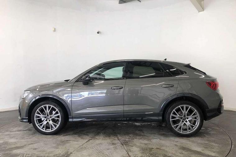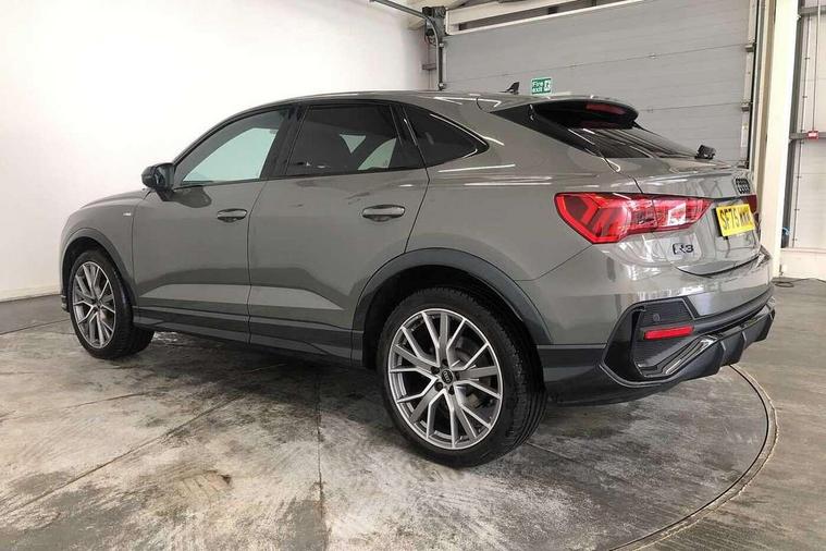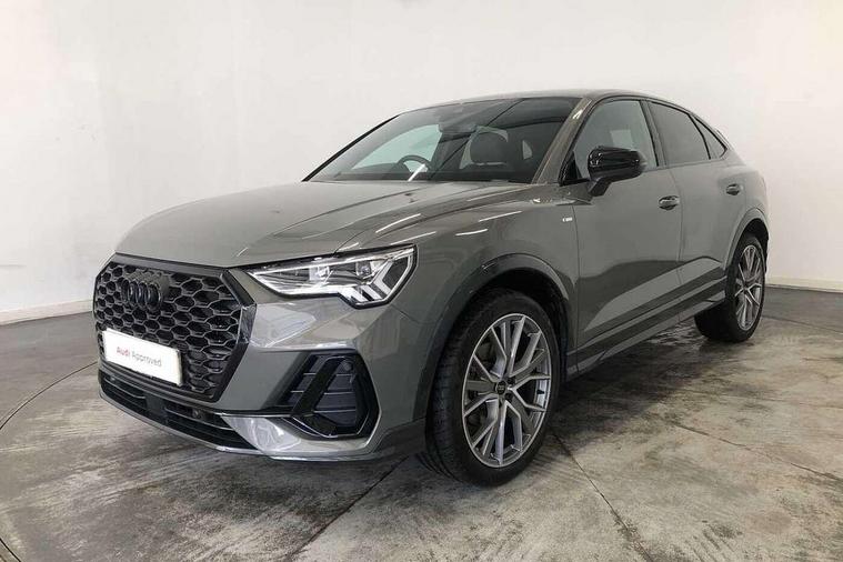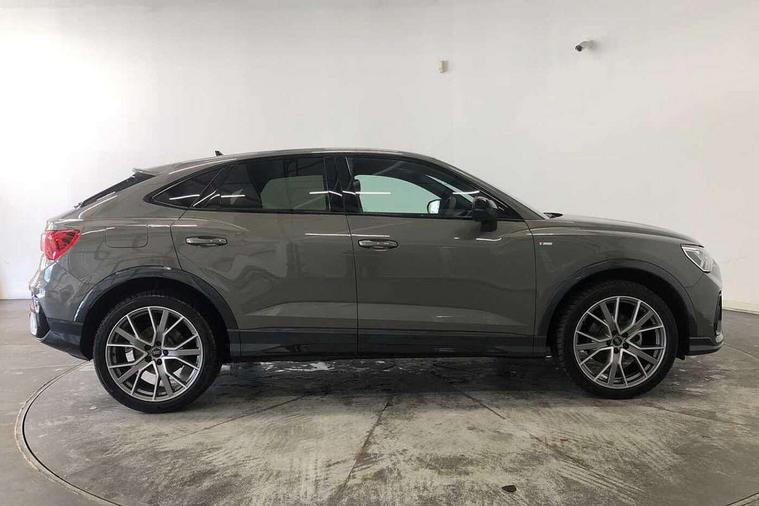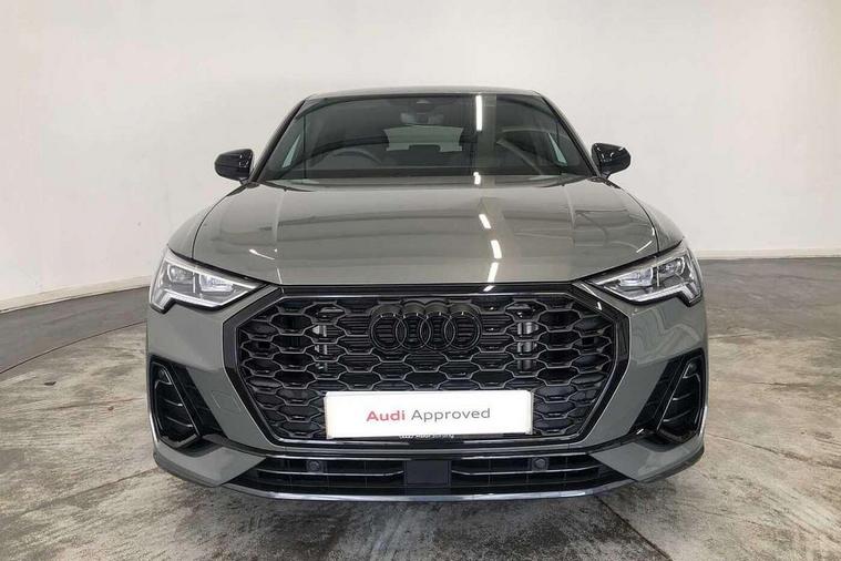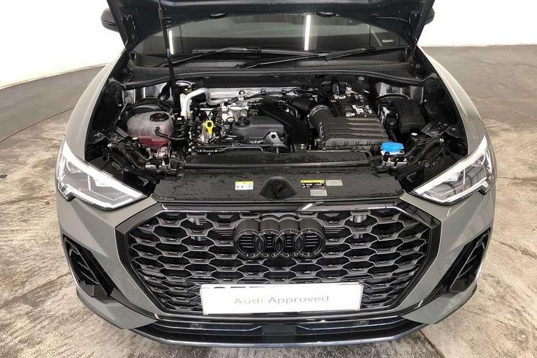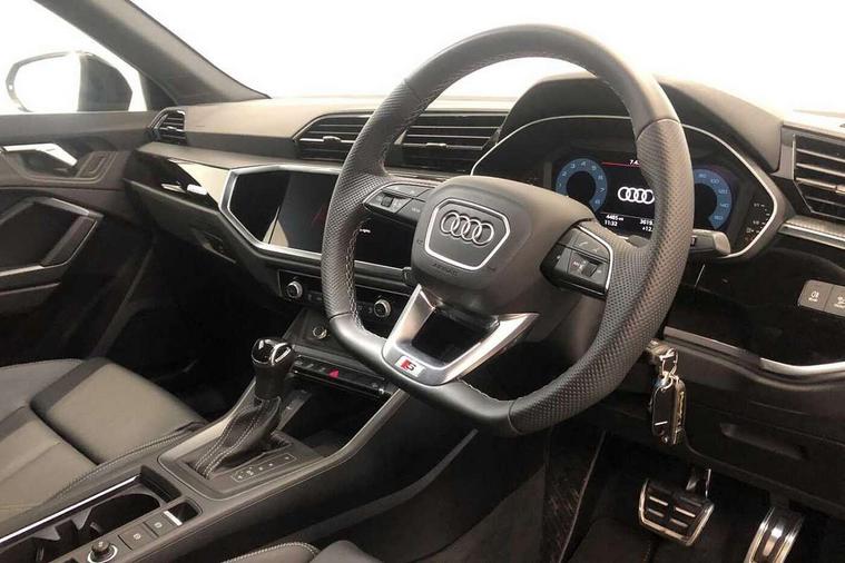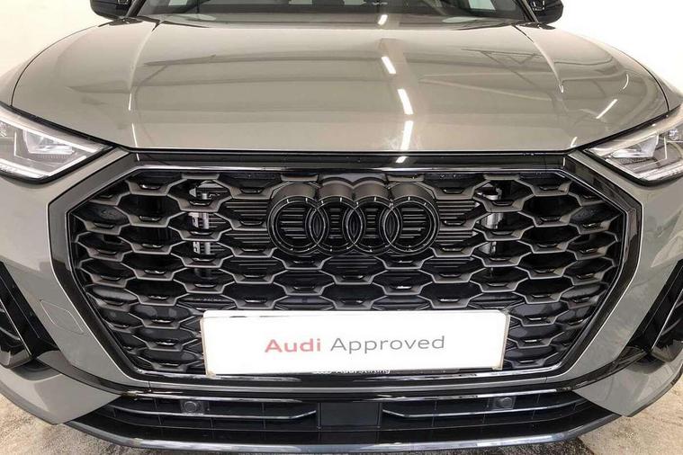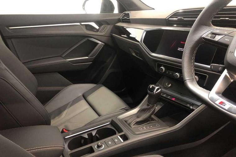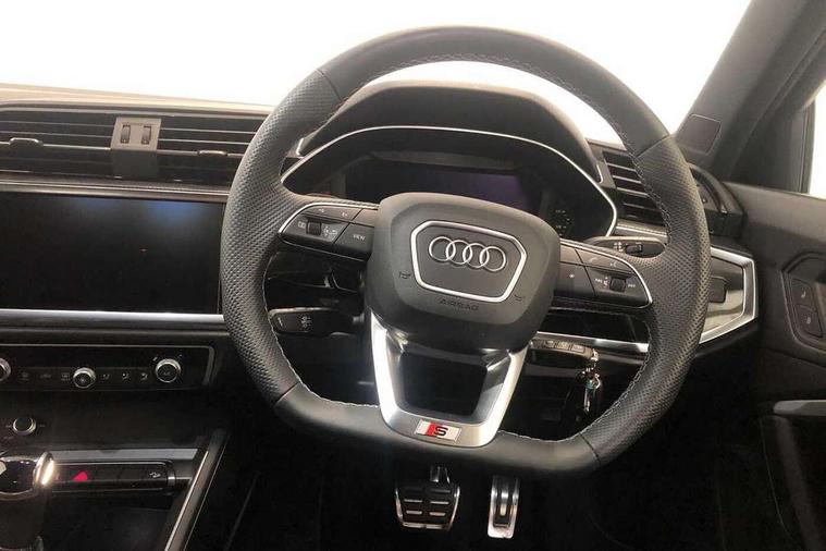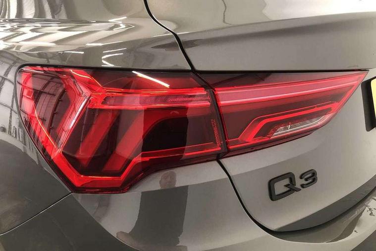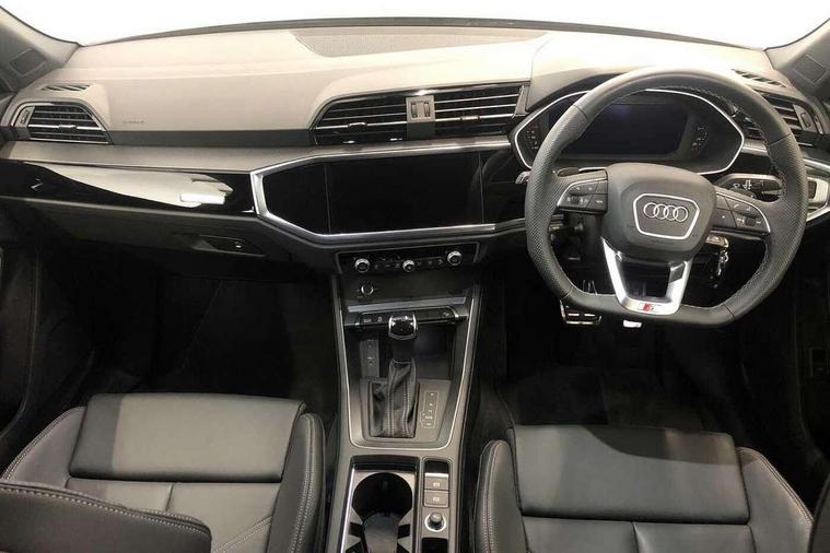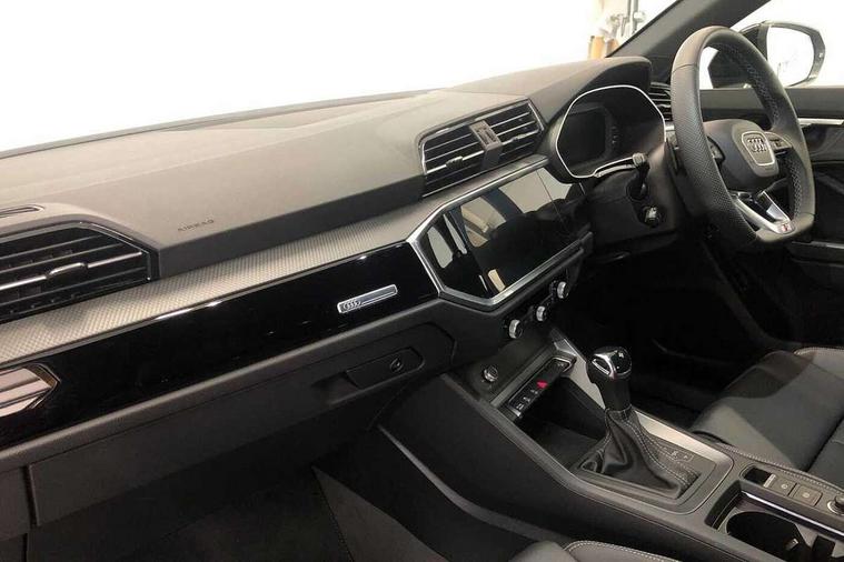 Audi connect safety and service, Audi drive select, Audi lane departure warning, Audi Virtual Cockpit - 10.25" display, Bluetooth interface, Camera based traffic sign recognition, Distraction and Fatigue warning, Legal emergency call, MMI Navigation Plus with high resolution 10.1 inch touchscreen colour display, Power operated tailgate, Progressive steering, Service interval indicator, Smartphone interface includes wireless Apple carplay/Android Auto, Start stop system with recuperation, Voice control system with natural language interaction, Sports suspension, 2 USB-C ports with charge and data functions, 6 passive loudspeakers, DAB digital radio module, Acoustic windscreen, Audi Beam uses LEDs to project the Audi logo onto the ground as you exit your Q3, Auto dimming door mirrors, Auto dimming frameless rear view mirror, Electrically folding, adjustable and heated door mirrors with integrated LED side indicators and kerb view function for passenger side, Front and rear electric windows, Front fog lights, Front underbody protection in manhattan grey paint finish, High gloss black finish B and C pillars, Honeycomb design radiator grille in matt anthracite black, LED Dynamic rear indicators, LED headlights with LED daytime running lights, LED rear lights, LED third brake light, Privacy glass dark tinted rear and rear-side windows (from B-pillar backwards), Rain and light sensors, Rear diffuser grille in grained matt black, Rear diffuser strip in matt anthracite black, Rear side wing doors, Rear underbody protection in matt black, Rear wiper, S line front and rear bumpers and side skirts in contrasting Manhattan grey paint finish, Variable front intermittent wipers, 12V socket in rear centre console, 3 seat bench in 2nd row, 40:20:40 folding with manual adjustment for 60:40 forwards/backwards position and backrest angle, Adjustable rear seat bench/backrest with centre armrest and cupholder, Black carpet mats, Black cloth headlining, Dual zone electronic climate control, Electric lumbar support, Front and rear black floor mats with contrast stitching in rock grey, Front and rear headrests, Front centre armrest, Height and reach adjustable steering wheel, Illuminated door sill trims with S logo, ISOFIX child seat mounting for front passenger with airbag deactivation and outer rear seat including top tether attachment point for outer rear seats, Luggage compartment sill protection in stainless steel, Manual front seats with height adjustment, Perforated leather gearknob, Single front passenger seat, Stainless steel pedals, Twin leather upholstery with front sport seats + S embossing, Black styling pack - Q3, Non smoking pack - Q3, 3x3 point rear seatbelts, 6 airbags - Driver, front passenger, curtain and side windows, Audi pre-sense front with pedestrain and cyclist recognition, Electrically operated child locks on rear doors, Electromechanical parking brake, Electronic stabilisation control including ABS, ASR and EDL, Front seatbelt reminder, Hill descent control, Hill hold assist, Pre sense basic, Seatbelt monitoring, Tyre pressure warning, Warning triangle and first aid kit, Anti theft wheel bolts, Immobiliser, Remote central locking, Thatcham approved category 1 anti theft alarm, Aluminium look interior elements, Detail dashboard around MMI touch colour display in glass look, black with surround in aluminium look, Leatherette door armrest, Piano black inlay,