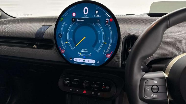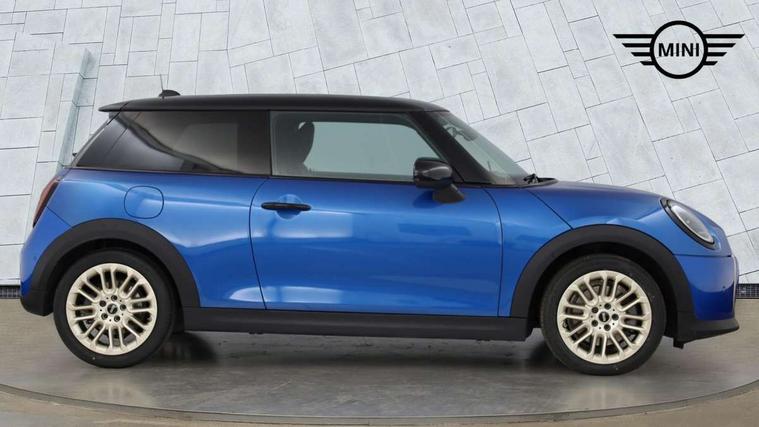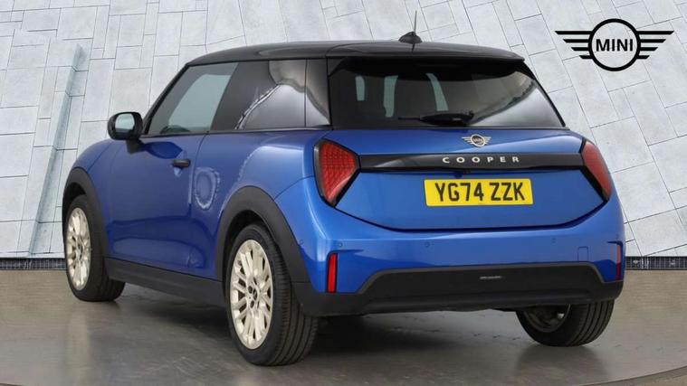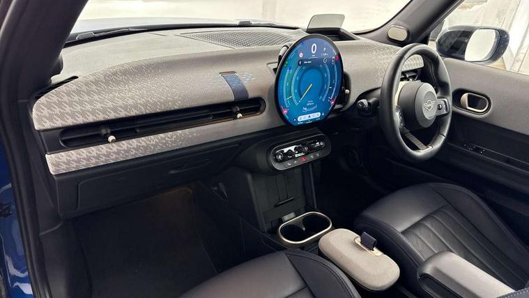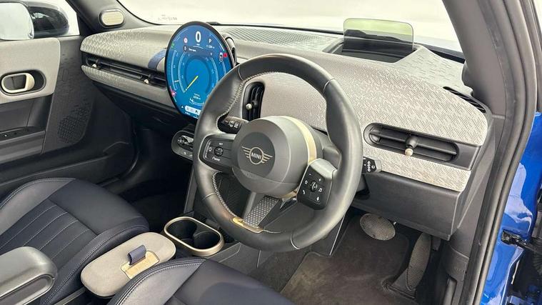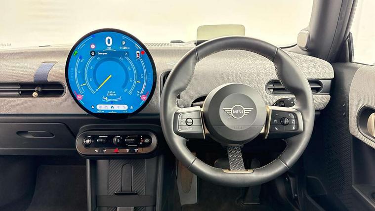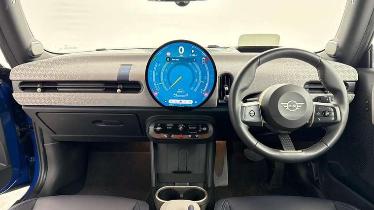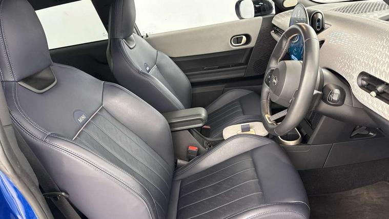 Central toggle bar, Circular OLED Screen, Compatible mobile phone bluetooth with audio streaming, Cruise control, Digital instrument cluster, Electro-mechanical speed dependant steering assistance, Emergency call service, MINI Experience Modes, Mini navigation system, On board computer, Service interval indicator, 7 speed steptronic transmission with double clutch, DAB Digital radio, Personal eSim, Auto headlights, Electric adjustable heated door mirrors, Electric front windows, Heated rear window, Heated windscreen washer jets, LED daytime running lights, LED Headlights, LED indicator lights, LED rear lights, Logos in Vibrant Silver, Rain sensor window wipers, Rear fog lights, Rear window wiper, Vibrant silver grille surround, 2 seat bench in second row, 2 zone automatic air conditioning, 60/40 rear seat bench, Ambient lighting, Cupholders, Dark headliner, Floor mats, Front and rear head restraints, Front compact armrest, Heated steering wheel, Height adjustable passenger seat, Lidded storage box in grey knit, Luggage compartment lighting, Single front passenger seat, Sport Vescin Steering Wheel black with vibrant silver accents, Sunvisors with vanity mirrors, Vescin synthetic leather upholstery, Driving assistant pack - Cooper Hatchback, Park assistant pack - Cooper Hatchback, 3 point seatbelts on all four seats, 6 Airbags - front, side, head and seat belt tensioners, Acoustic pedestrian protection, Anti-lock braking system (ABS), DSC - Dynamic Stability Control, Electronic parking brake, Front and rear disc brakes, Front ISOFIX (iSize), Front passenger airbag deactivation, Traction control, Tyre pressure monitoring system, Alarm, Immobiliser, Remote central locking, Blue decorative dash strap, Light Beige/Grey dash knit, Tyre repair kit,