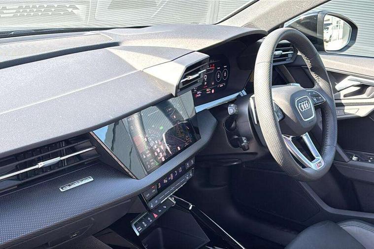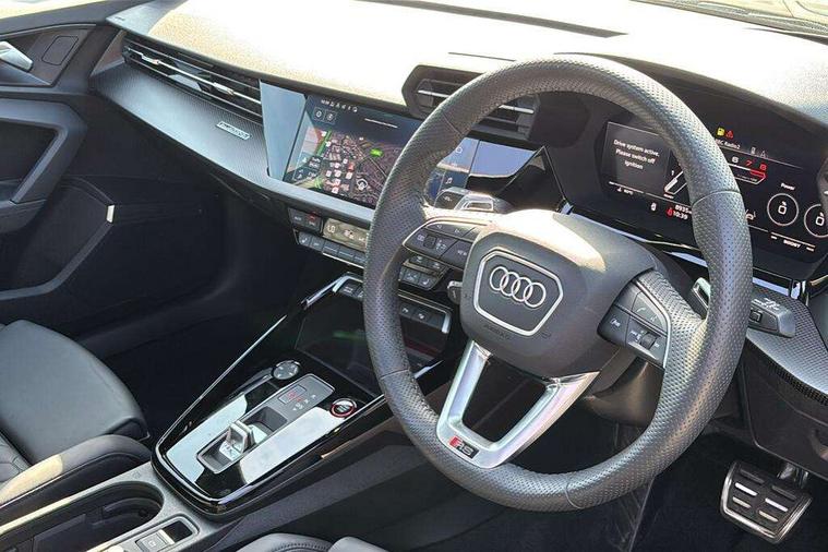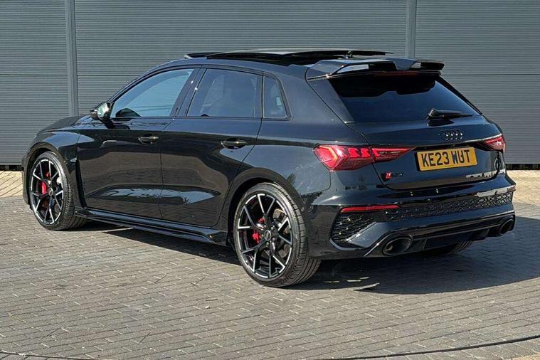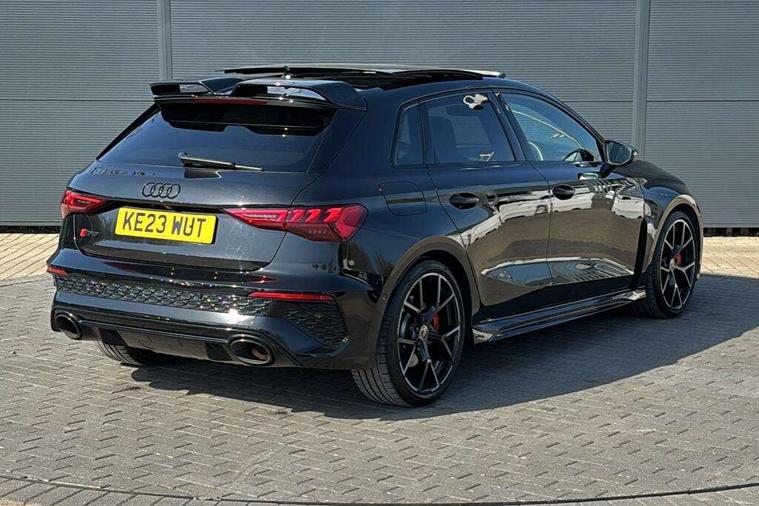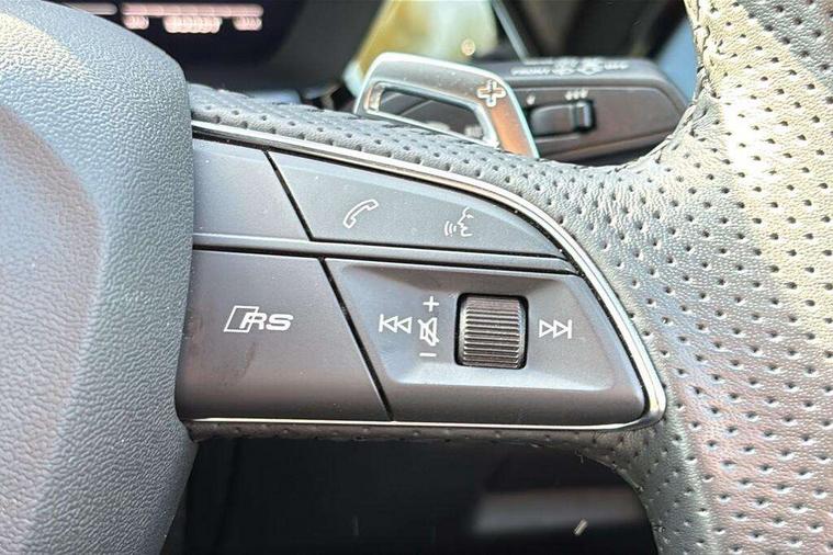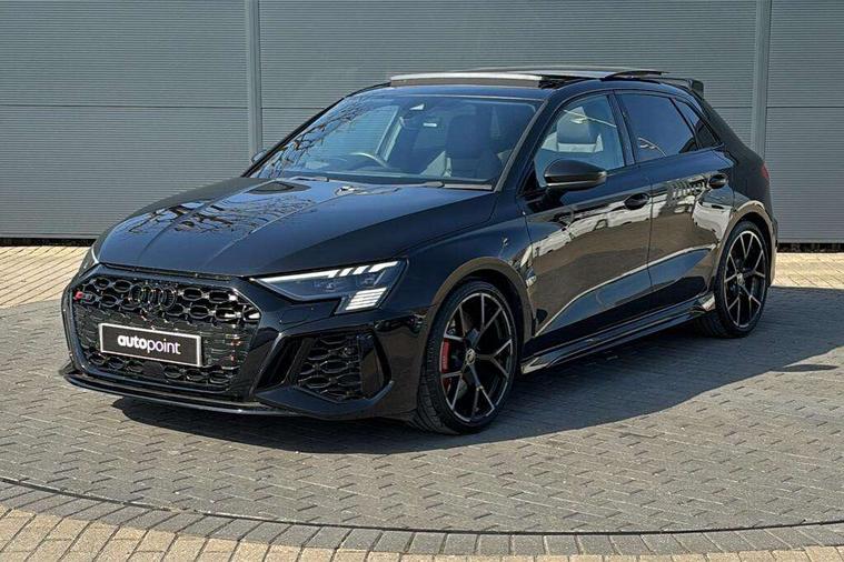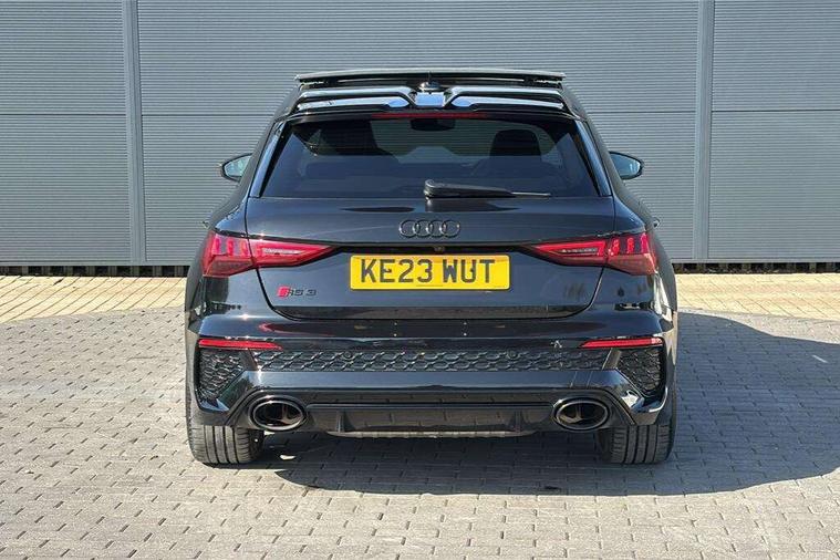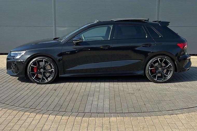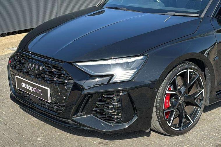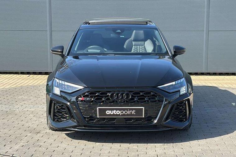 Adaptive cruise assist, Adaptive cruise control, Audi smartphone interface, Audi virtual cockpit with RS specific display 12.3" full colour digital instrument cluster, Automatic start/stop system with recuperation, Bluetooth interface, Camera based traffic sign recognition, Collision avoidance assistant, Emergency e-call, Head up Display, Lane departure warning system, Legal emergency call, Parking assist with parking system plus, Power operated tailgate - Luggage compartment lid opens electrically, Progressive power assisted steering, Reversing camera, Quattro permanent four wheel drive, Rear suspension, DAB Digital radio, 3rd brake light, Acoustic glass windscreen, Audi beam uses LEDs to project the Audi sport logo onto the ground as you exit your RS 3, Audi matrix LED headlights, LED rear lights, dynamic front and rear indicators and headlight cleaning system, Auto dimming rear view mirror, Black side skirts, Body colour roof, Carbon exterior door mirror, Carbon fibre engine cover, Daytime running lights, Electric adj heated/folding + auto dimming exterior mirrors with memory + LED indicator + auto kerb side function for passenger side exterior mirror, Front spoiler in high gloss black, Heat insulating glass windscreen, Light and rain sensors, Panoramic glass sunroof, Privacy glass - dark tinted rear and rear side windows from B-pillar backwards, Rear side wing doors, Rear window wiper and washer system, RS exterior features in gloss black, RS sports exhaust system, 3 seat bench in 2nd row, 3 spoke leather multifunction steering wheel with gear shift paddles, 4 way lumbar support for front seats, 40/20/40 split folding rear seat bench, Black cloth headlining, Dual zone electronic climate control, Electrically adjustable front seats with memory function for driver's side, Front and rear headrests, Front centre armrest, Front sports seats RS embossed logo, Front/rear floor mats, Heated front seats, Honeycomb stitching and RS embossing, Illuminated door sill trims inlays in aluminium with RS 3 logo, Illuminated vanity mirror, RS emblems, Single front passenger seat, Stainless steel pedals and front footrest in black, Aluminium interior elements pack - RS3, Ambient lighting pack - RS3, Comfort and sound pack - RS3, Driver assistance pack with 3 spoke leather multi function steering wheel - RS3, MMI navigation plus with MMI touch - RS3, RS bodystyling - RS3, Storage Pack - RS3, 3x3 point rear seat belts, ABS/EBD, ASR, Audi pre sense front, Driver/Front Passenger airbags, EDL, ESC - Electronic Stability Control + traction control, Front passenger airbag deactivation, Front side airbags with head airbags and interaction airbag, Hill hold assist, Seat belt reminder with passenger presence detection in rear, Tyre pressure loss indicator, Warning triangle and first aid kit, Anti theft alarm, Anti-theft wheel bolts, Electronically operated child lock, Remote control central locking, Full decorative carbon trim, 19" 5 Y spoke black with graphic print alloy wheels, Tool kit, Tyre repair kit,