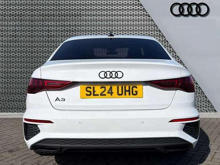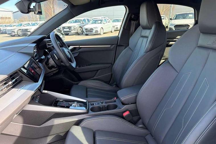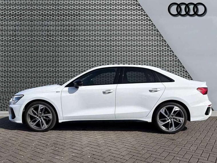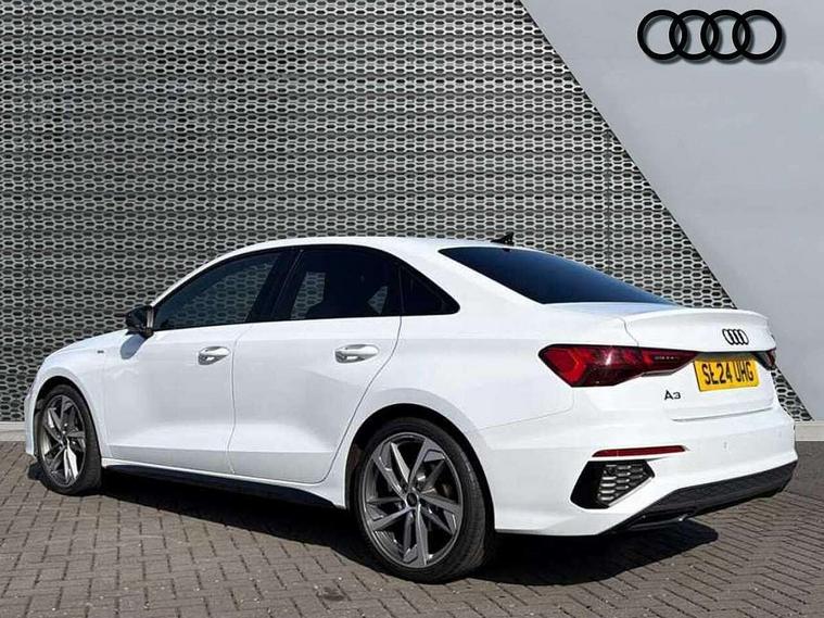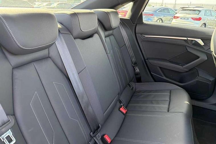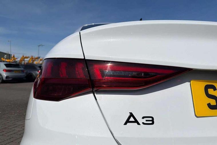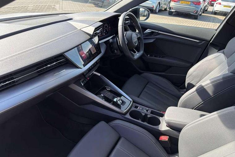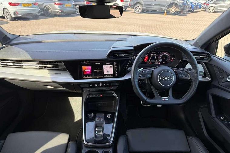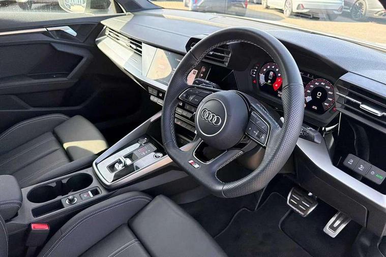 Audi drive select (Auto, Comfort, Dynamic, Efficiency and Individual), Audi smartphone interface, Audi Virtual Cockpit - 10.25" digital and colour instrument cluster, Automatic start/stop system with recuperation, Bluetooth interface, Camera based traffic sign recognition, Collision avoidance assistant, e-Call (emergency call), Electromechanical power speed sensitive steering, Lane departure warning system, MMI Navigation Plus with high resolution 10.1" colour touch screen display, Service indicator, Trip computer, Voice control system with natural language interaction, Sports suspension, 2xUSB-C connection with data and charging functions, 6 passive loudspeakers, CD player, DAB Digital radio, 3rd brake light, Acoustic glass windscreen, Audi beam uses LEDs to project the Audi logo onto the ground as you exit your A3, Auto dimming frameless rear view mirror, Electrically adjustable/heated/folding/auto dimming door mirrors with integrated LED indications + kerb view function for passenger side, Front electric windows, Illuminated door sills with aluminium inserts at the front with S logo, LED daytime running lights, LED headlights with LED rear lights and dynamic rear indicators, Light and rain sensors, Model and engine designation badges at rear, Privacy glass - dark tinted rear window, rear door and side windows, Rear boot, Rear electric windows, Rear side wing doors, S roof spoiler, 12V socket and storage compartment in front centre console, 3 seat bench in 2nd row, 3 spoke flat bottomed leather multifunction sport steering wheel with gear shift paddles, 4 way electrically adjustable lumbar support for driver and front passenger, 60/40 split folding rear seat bench, Black cloth headlining, Dual zone electronic climate control, Front and rear centre armrest in artificial leather, Front and rear headrests, Front/rear floor mats, Height and reach adjustable steering wheel, Interior lighting - glove compartment light and right hand side, Luggage compartment floor covering, Manual boot compartment lid, Single front passenger seat, Stainless steel pedals and front footrest in black, Twin leather upholstery with front sports seats S embossed logo, Aluminium interior elements pack - A3, Black styling pack - A3 Saloon/Black edition, LED interior lighting pack - A3 Saloon, 3x3 point rear seat belts, Driver and front passenger airbag with passenger airbag deactivation, Electronic Stabilisation Control (ESC) including ABS, ASR and EDL, First aid kit with warning triangle and 2 safety vests, Front side airbags with head airbags and interaction airbag, Pre-sense front with pedestrian and cyclist detection, Seatbelt monitoring, Tyre pressure loss indicator, Anti theft alarm, Anti-theft wheel bolts, Electronically operated child locks, Immobiliser, Remote control central locking, Aluminium air vent surrounds, Dark spectrum aluminium inlays, accent surfaces in the dashboard and centre console in platinum grey silk effect paint finish, 19" 5 arm trapezoid design alloy wheels in matt grey with diamond cut finish,