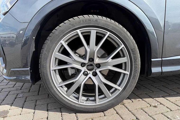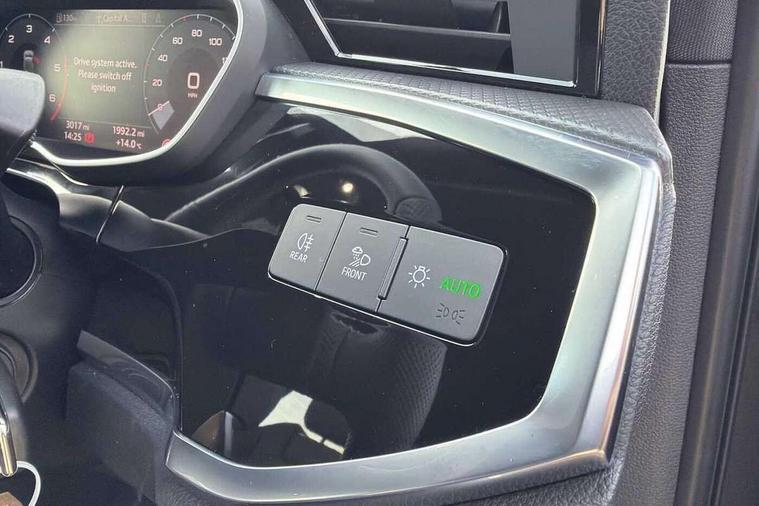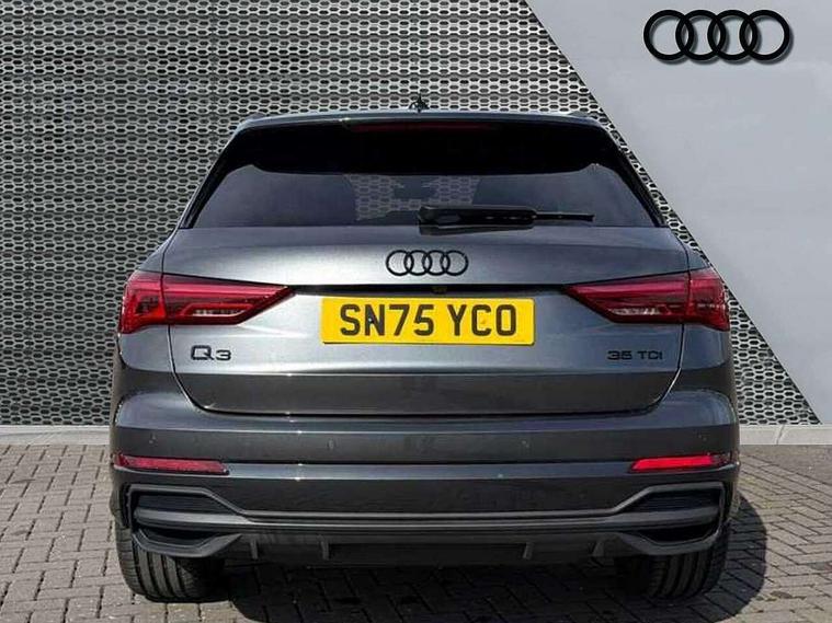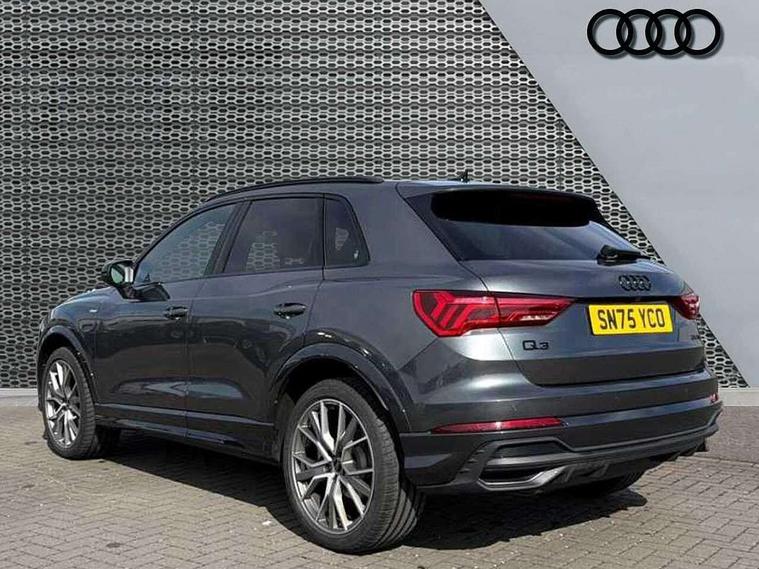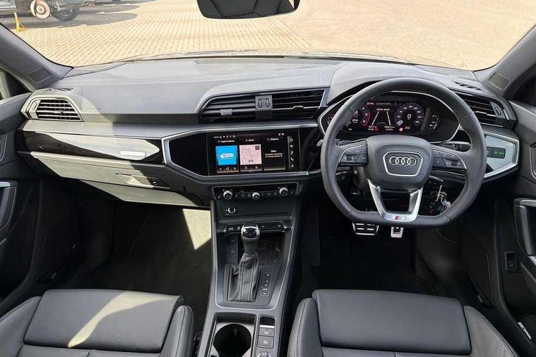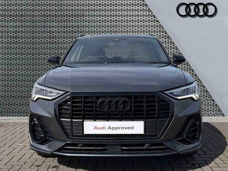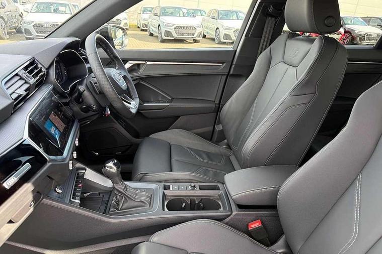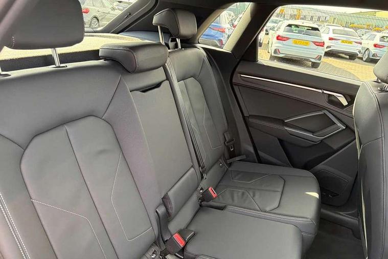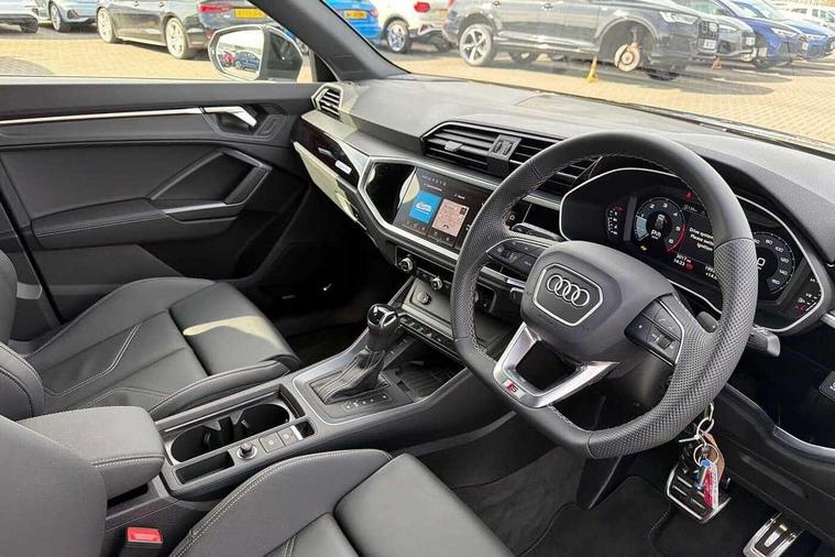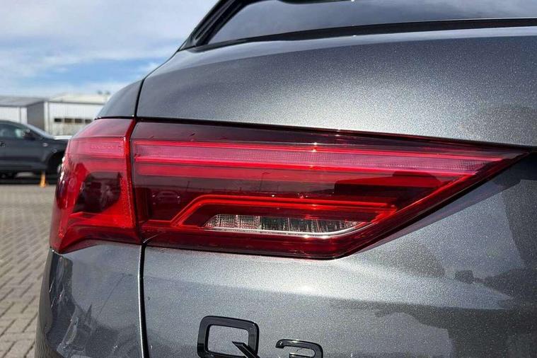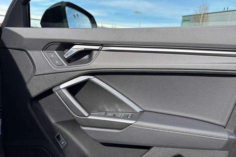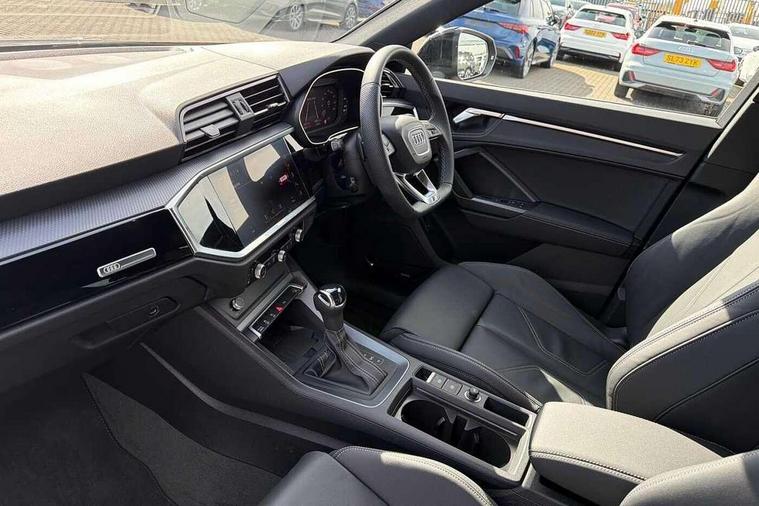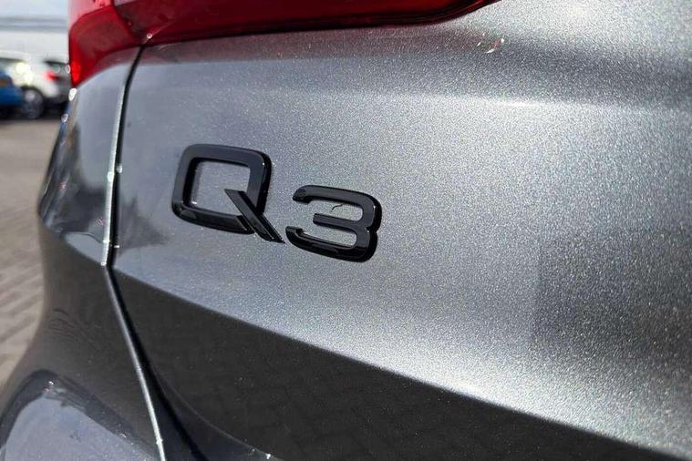 Amazon alexa Integration, Audi connect safety and service, Audi drive select, Audi lane departure warning, Audi Virtual Cockpit - 10.25" display, Bluetooth interface, Camera based traffic sign recognition, Distraction and Fatigue warning, Legal emergency call, MMI Navigation Plus with high resolution 10.1 inch touchscreen colour display, Power operated tailgate, Progressive steering, Service interval indicator, Smartphone interface includes wireless Apple carplay/Android Auto, Start stop system with recuperation, Voice control system with natural language interaction, Diesel particulate filter, Sports suspension, 2 USB-C ports with charge and data functions, 6 passive loudspeakers, DAB digital radio module, Acoustic windscreen, Anthracite black radiator grille, Audi Beam uses LEDs to project the Audi logo onto the ground as you exit your Q3, Auto dimming door mirrors, Auto dimming frameless rear view mirror, Black roof rails, Electrically folding, adjustable and heated door mirrors with integrated LED side indicators and kerb view function for passenger side, Front and rear electric windows, Front fog lights, Grille vertical bars in aluminium silver/Matt, High gloss black finish B and C pillars, LED Dynamic rear indicators, LED headlights with LED daytime running lights, LED rear lights, LED third brake light, Privacy glass dark tinted rear and rear-side windows (from B-pillar backwards), Rain and light sensors, Rear diffuser grille in grained matt black, Rear diffuser strip in matt anthracite black, Rear side wing doors, Rear wiper, S line bumpers in contrasting Manhattan grey, Variable front intermittent wipers, 12V socket in rear centre console, 3 seat bench in 2nd row, 40:20:40 folding with manual adjustment for 60:40 forwards/backwards position and backrest angle, Adjustable rear seat bench/backrest with centre armrest and cupholder, Black carpet mats, Black cloth headlining, Dual zone electronic climate control, Electric lumbar support, Front and rear black floor mats with contrast stitching in rock grey, Front and rear headrests, Front centre armrest, Height and reach adjustable steering wheel, Illuminated door sill trims with S logo, ISOFIX child seat mounting for front passenger with airbag deactivation and outer rear seat including top tether attachment point for outer rear seats, Luggage compartment sill protection in stainless steel, Manual front seats with height adjustment, Perforated leather gearknob, Single front passenger seat, Stainless steel pedals, Twin leather upholstery with front sport seats + S embossing, Black styling pack - Q3, Non smoking pack - Q3, 3x3 point rear seatbelts, 6 airbags - Driver, front passenger, curtain and side windows, Audi pre-sense front with pedestrain and cyclist recognition, Electrically operated child locks on rear doors, Electromechanical parking brake, Electronic stabilisation control including ABS, ASR and EDL, Front seatbelt reminder, Hill descent control, Hill hold assist, Pre sense basic, Seatbelt monitoring, Tyre pressure warning, Warning triangle and first aid kit, Anti theft wheel bolts, Immobiliser, Remote central locking, Thatcham approved category 1 anti theft alarm, Aluminium look interior elements, Detail dashboard around MMI touch colour display in glass look, black with surround in aluminium look, Leatherette door armrest, Piano black inlay,