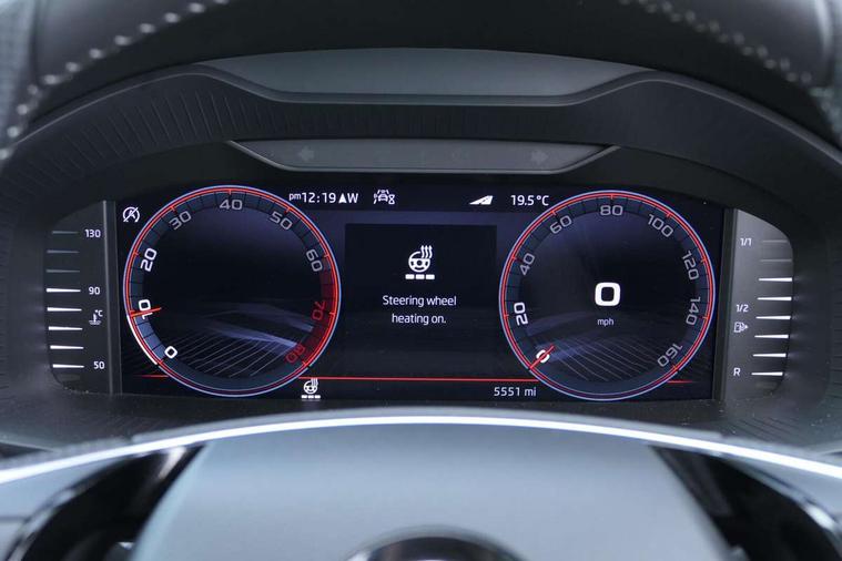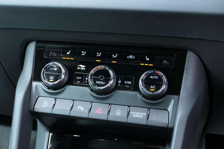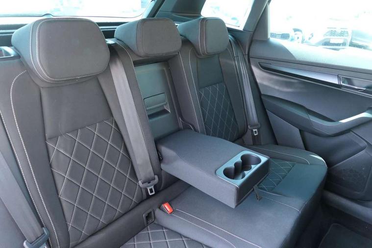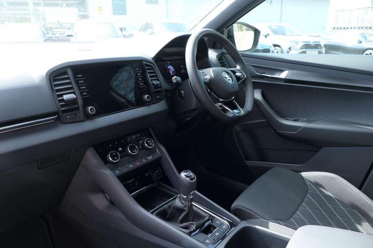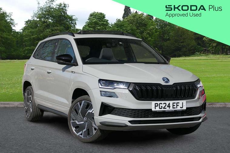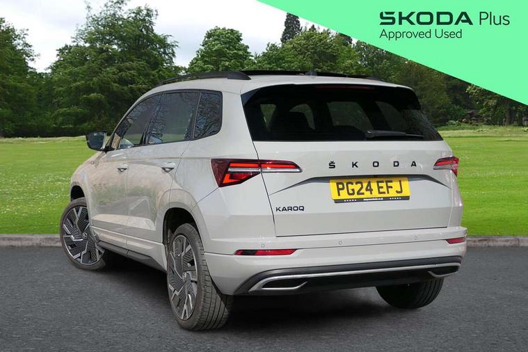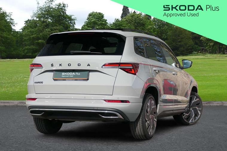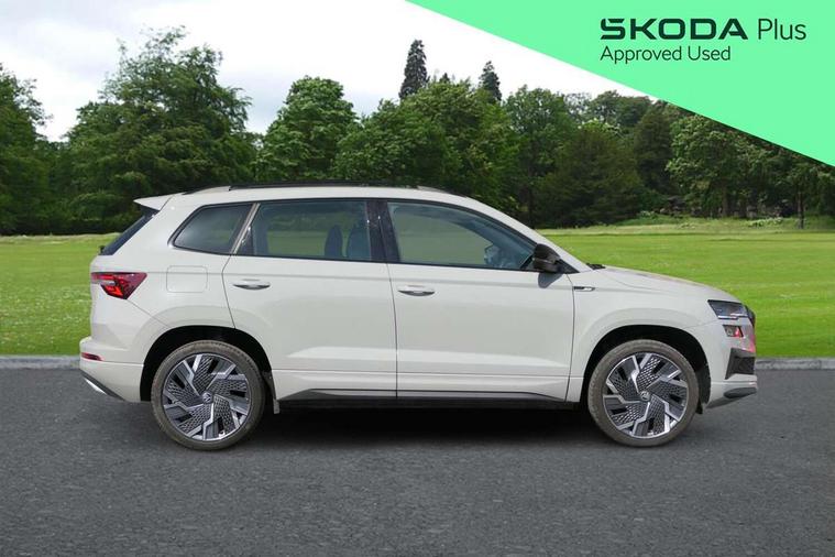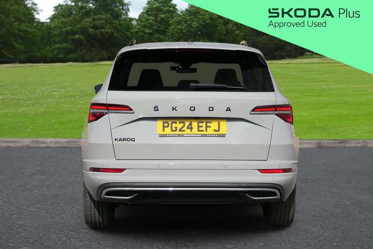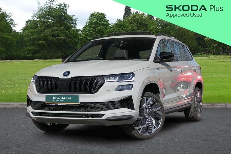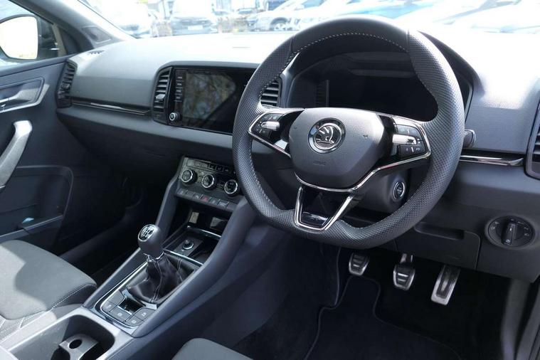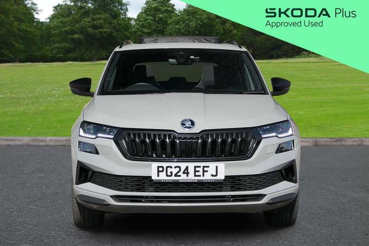 8" Digital display, Advanced driver attention and drowsiness monitor, Emergency services call system, Outside temperature gauge, Sensor for driver assistance systems, Service interval indicator, SmartLink wireless for Apple and wired for Android, Start/stop system with regenerative braking, USB C Port x 2 in front centre console, Virtual Cockpit - 10.25" digital display, Virtual pedal with electrically operated boot door, Wireless smartphone charging, Canton sound system, DAB radio with Bluetooth, USB connection, Acoustic glass, Aero front windscreen wipers with intermittent function, Auto dimming rear view mirror with light and rain sensors, Black door mirrors, Black electric window control buttons, Black radiator grille, Black roof rails, Body colour door handles, Electric front and rear windows with child proof lock, Front door steps with SportLine logo, Heated rear windscreen, LED 3rd brake light, LED daytime running lights, LED rear lights with high functionality welcome effect and dynamic indicators, Light assistant (coming/leaving home/tunnel light), Panoramic sliding sunroof, Plastic scuff plates in door apertures, Privacy glass, Protective door side sills in body colour, Rear diffuser, Rear side wing doors, Rear spoiler, Rear window wiper with washer system and intermittent control, Safety reflectors on front doors, Skoda lettering on tailgate in black, Sportline badge on front fender, Sportline decorative inserts with badging, Sports front and rear bumpers, 1.5 litre bottle holders in driver and front passenger door panels, 12V socket in boot, 12v socket in front centre armrest with storage compartment and rear air vents, 2 x Tablet holder, 3 rear height adjustable headrests, 3 seat bench in 2nd row, 3 spoke leather sports multifunction steering wheel and silver stitching, 4 foldable roof handles with rear coat hooks, Black floor carpet, Chrome inner door handles, Double sided boot floor, Foldable hooks in the boot, Front head restraints, Height adjustable front three point seats belts with tensioners, Height/reach adjust steering wheel, Ice scraper, Illuminated glovebox, Illuminated luggage compartment, Isofix child seat preparation for front passenger seat, Isofix child seat preparation outer rear, Manual lumbar support for front seats, Pen holder, Pollen filter, Rear boot cover, Rear reading lights, Rear seats fixed folding and divided 60:40, Rubbish bin door, Safety vest holder, Single front passenger seat, Storage box in upper central dashboard closed, Sunvisors with illuminated vanity mirrors, Textile floor mats, Ticket holder, Titan black interior ceiling, Umbrella under passenger seat, Under passenger seat storage compartment, Welcome animation with sportline logo, Light Pack - Karoq, Non Smokers pack, Automatic door unlocking in case of crash, Automatic fuel cut off in case of crash, Driver airbag, Electronic parking brake with auto hold function, Emergency rear braking signal, ESC including ABS, MSR, ASR, EDS, HBA, DSR, RBS, MKB and traction control, Front side airbags, Head airbags, Hill hold control, Knee airbags, Passenger airbag with switch-off function, Pedestrian monitor, Seatbelt reminder signalisation and pretensioner for all seats, Three point seatbelts rear, Two tone horn, Tyre pressure monitor, Alarm with interior monitoring, back up horn and tilt sensor with safe function, Electronic engine immobiliser, Keyless entry and start/stop, Remote central locking with 2 remote folding keys, Black air vent surround, Black centre console, carbon door decor, Satin black dashboard, Satin black door trim, 19" Sagittarius anthracite alloy wheels, Anti-theft wheel bolts protection, Breakdown and tool kit,
