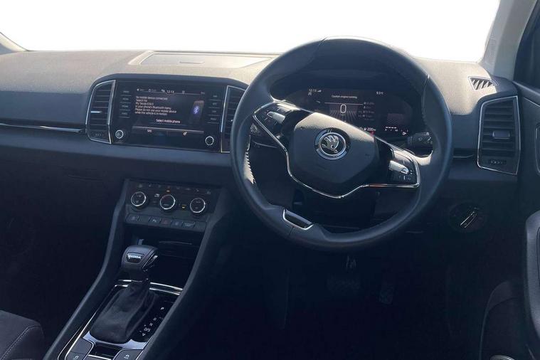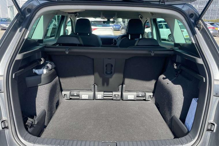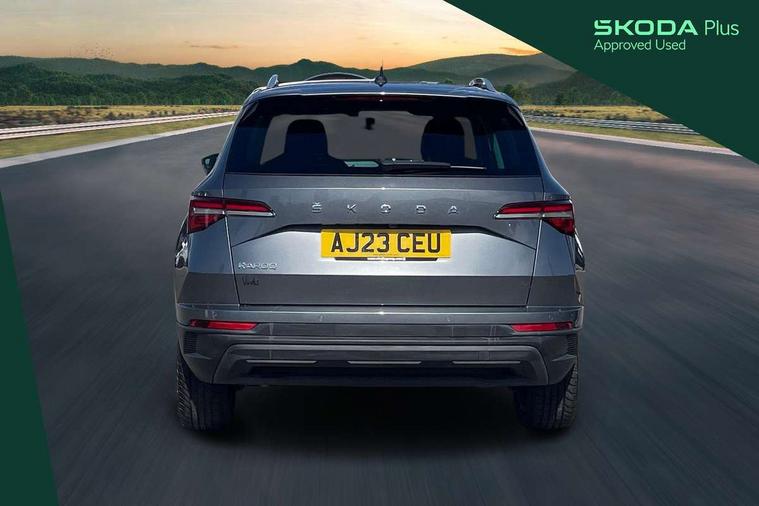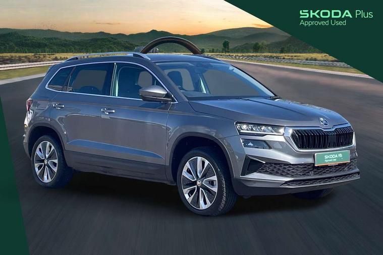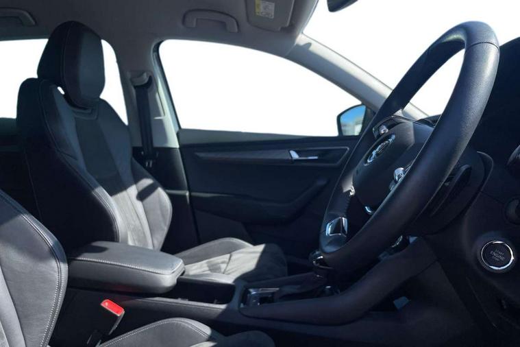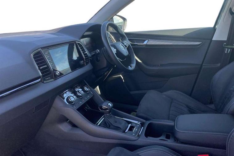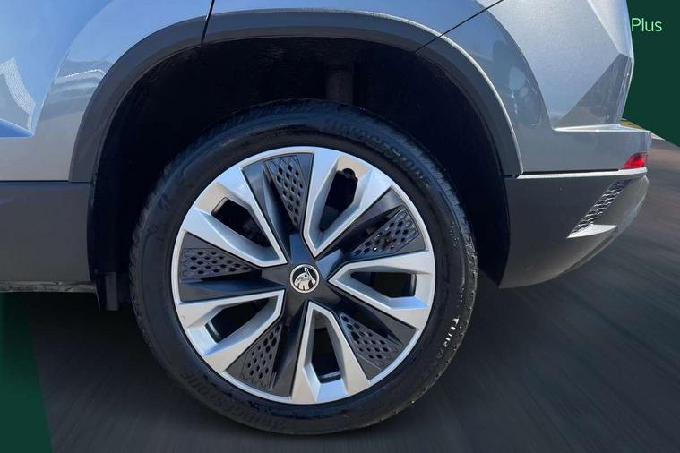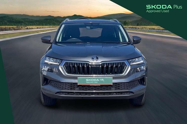 8" Digital display, Care connect, Driver fatigue sensor, Emergency services call system, Outside temperature gauge, Service interval indicator, SmartLink wireless for Apple and wired for Android, Start/stop system with regenerative braking, USB C Port x 2 in front centre console, 8 Speakers, DAB radio with Bluetooth, USB connection, Acoustic glass, Aero front windscreen wipers with intermittent function, Auto dimming rear view mirror with light and rain sensors, Black electric window control buttons, Body colour door mirrors and handles, Dynamic headlight range control with cornering light function, Electric front and rear windows with child proof lock, Heated rear windscreen, LED daytime running lights, LED rear lights with high functionality welcome effect and dynamic indicators, Light assistant (coming/leaving home/tunnel light), Plastic scuff plates, Privacy glass, Rear side wing doors, Rear spoiler, Rear window wiper with washer system and intermittent control, Safety reflectors on front doors, 1.5 litre bottle holders in driver and front passenger door panels, 12V socket in boot, 12v socket in front centre armrest with storage compartment and rear air vents, 2 spoke leather heated multifunction steering wheel with DSG paddles, 2 x Tablet holder, 3 rear height adjustable headrests, 3 seat bench in 2nd row, 4 foldable roof handles with rear coat hooks, Black floor carpet, Chrome inner door handles, Decorative door sills with KAROQ badging, Double sided boot floor, Foldable hooks in the boot, Front head restraints, Height adjustable front three point seats belts with tensioners, Height/reach adjust steering wheel, Ice scraper, Illuminated glovebox, Illuminated luggage compartment, Isofix child seat preparation for front passenger seat, Isofix child seat preparation outer rear, Manual lumbar support for front seats, Pen holder, Pollen filter, Rear boot cover, Rear reading lights, Rubbish bin door, Safety vest holder, Single front passenger seat, Storage box in upper central dashboard closed, Sunvisors with illuminated vanity mirrors, Textile floor mats, Ticket holder, VarioFlex seats with standard rear seat release, Boot pack - Karoq, Chrome roof rails + chrome pack - Karoq, Parking pack - Karoq, Automatic door unlocking in case of crash, Automatic fuel cut off in case of crash, Child locks on rear doors, Driver airbag, Electronic parking brake with auto hold function, Emergency rear braking signal, ESC including ABS, MSR, ASR, EDS, HBA, DSR, RBS, MKB and traction control, Front side airbags, Hill hold control, Knee airbags, Passenger airbag with switch-off function, Pedestrian monitor, Seatbelt reminder signalisation and pretensioner for all seats, Three point seatbelts rear, Two tone horn, Tyre pressure display, Tyre pressure monitor, Alarm with interior monitoring, back up horn and tilt sensor with safe function, Electronic engine immobiliser, Keyless entry and start/stop, Remote central locking with 2 remote folding keys, Chrome framed air vents, 18" Procyon silver alloy wheels with anthracite aero inserts, Anti-theft wheel bolts protection, Storage on wheel cover, Tool kit,