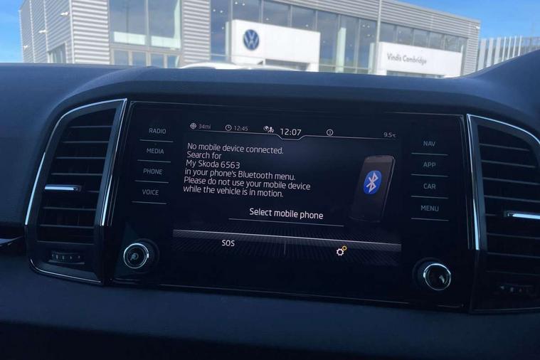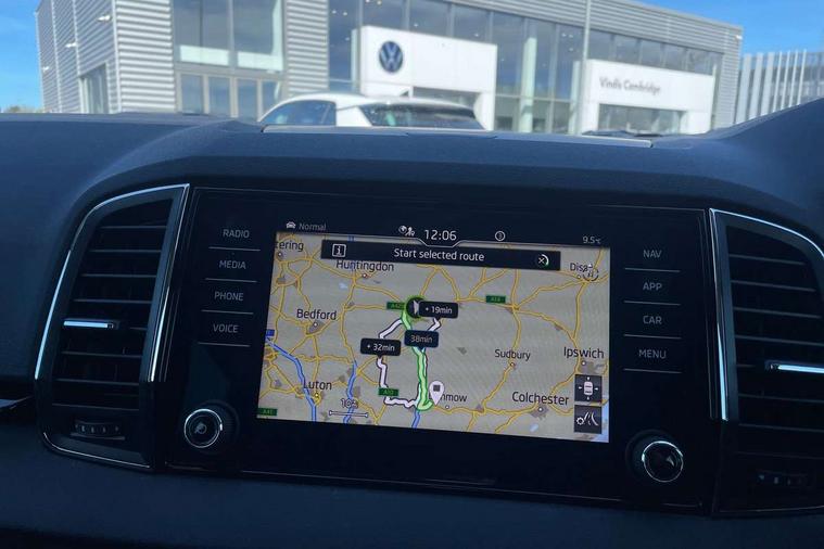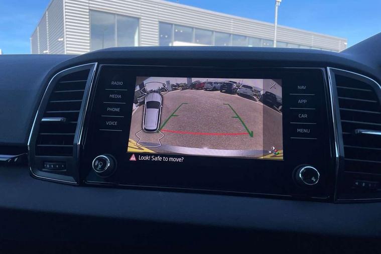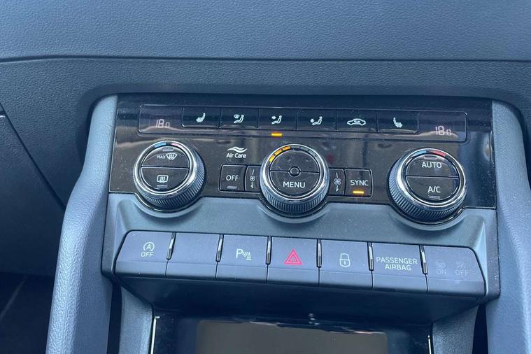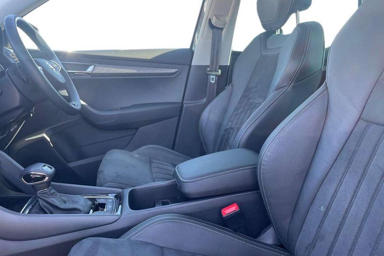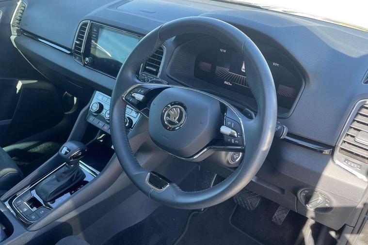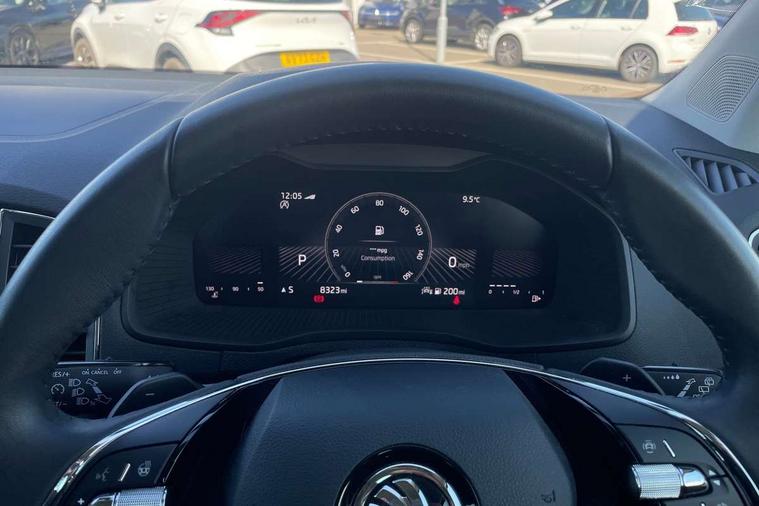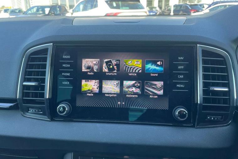 8" Digital display, Care connect, Driver fatigue sensor, Emergency services call system, Outside temperature gauge, Service interval indicator, SmartLink wireless for Apple and wired for Android, Start/stop system with regenerative braking, USB C Port x 2 in front centre console, 8 Speakers, DAB radio with Bluetooth, USB connection, Acoustic glass, Aero front windscreen wipers with intermittent function, Auto dimming rear view mirror with light and rain sensors, Black electric window control buttons, Body colour door mirrors and handles, Dynamic headlight range control with cornering light function, Electric front and rear windows with child proof lock, Heated rear windscreen, LED daytime running lights, LED rear lights with high functionality welcome effect and dynamic indicators, Light assistant (coming/leaving home/tunnel light), Plastic scuff plates, Privacy glass, Rear side wing doors, Rear spoiler, Rear window wiper with washer system and intermittent control, Safety reflectors on front doors, 1.5 litre bottle holders in driver and front passenger door panels, 12V socket in boot, 12v socket in front centre armrest with storage compartment and rear air vents, 2 spoke leather heated multifunction steering wheel with DSG paddles, 2 x Tablet holder, 3 rear height adjustable headrests, 3 seat bench in 2nd row, 4 foldable roof handles with rear coat hooks, Black floor carpet, Chrome inner door handles, Decorative door sills with KAROQ badging, Double sided boot floor, Foldable hooks in the boot, Front head restraints, Height adjustable front three point seats belts with tensioners, Height/reach adjust steering wheel, Ice scraper, Illuminated glovebox, Illuminated luggage compartment, Isofix child seat preparation for front passenger seat, Isofix child seat preparation outer rear, Manual lumbar support for front seats, Pen holder, Pollen filter, Rear boot cover, Rear reading lights, Rubbish bin door, Safety vest holder, Single front passenger seat, Storage box in upper central dashboard closed, Sunvisors with illuminated vanity mirrors, Textile floor mats, Ticket holder, VarioFlex seats with standard rear seat release, Boot pack - Karoq, Chrome roof rails + chrome pack - Karoq, Parking pack - Karoq, Automatic door unlocking in case of crash, Automatic fuel cut off in case of crash, Child locks on rear doors, Driver airbag, Electronic parking brake with auto hold function, Emergency rear braking signal, ESC including ABS, MSR, ASR, EDS, HBA, DSR, RBS, MKB and traction control, Front side airbags, Hill hold control, Knee airbags, Passenger airbag with switch-off function, Pedestrian monitor, Seatbelt reminder signalisation and pretensioner for all seats, Three point seatbelts rear, Two tone horn, Tyre pressure display, Tyre pressure monitor, Alarm with interior monitoring, back up horn and tilt sensor with safe function, Electronic engine immobiliser, Keyless entry and start/stop, Remote central locking with 2 remote folding keys, Chrome framed air vents, 18" Procyon silver alloy wheels with anthracite aero inserts, Anti-theft wheel bolts protection, Storage on wheel cover, Tool kit,