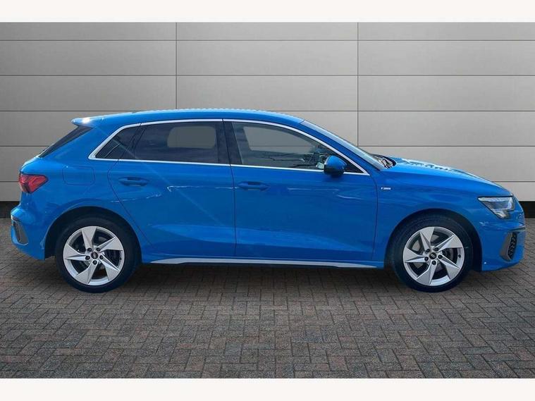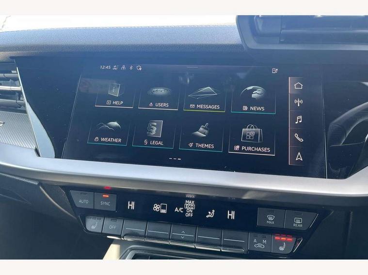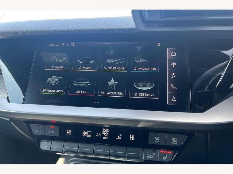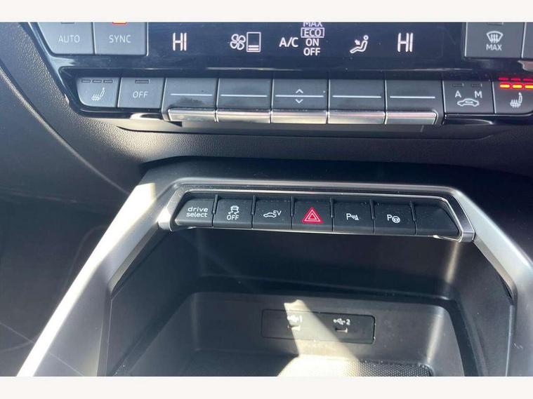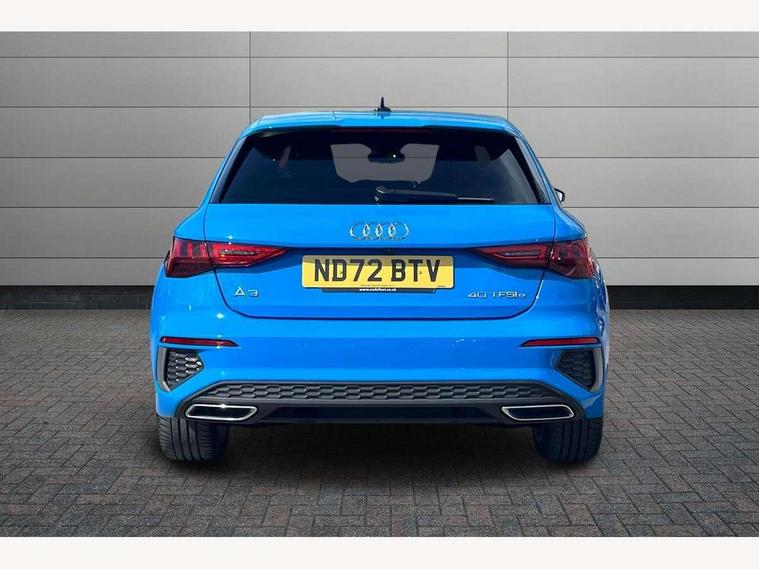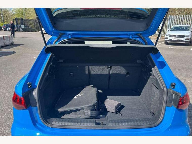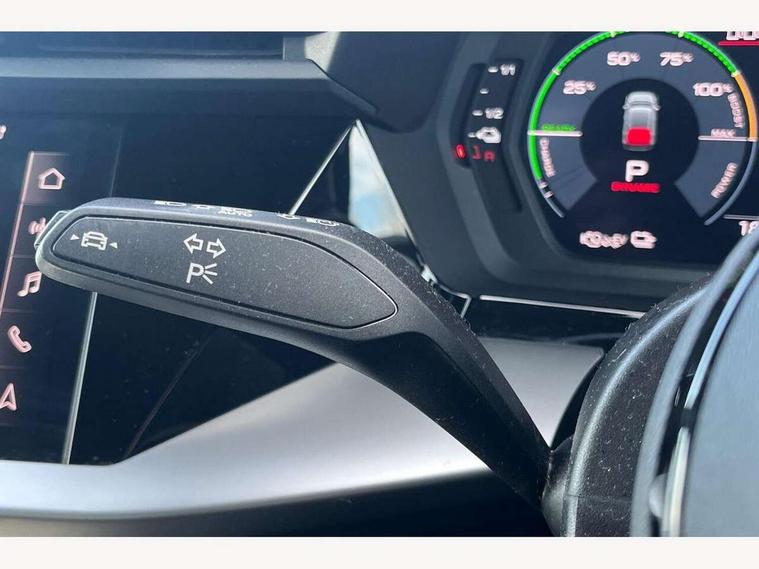 Audi drive select (Auto, Comfort, Dynamic, Efficiency and Individual), Audi smartphone interface, Audi Virtual Cockpit - 10.25" digital and colour instrument cluster, Automatic start/stop system with recuperation, Bluetooth interface, Collision avoidance assistant, e-Call (emergency call), Electromechanical power speed sensitive steering, Lane departure warning system, MMI Navigation Plus with high resolution 10.1" colour touch screen display, Service indicator, Trip computer, Voice control system with natural language interaction, 3 pin 10 amp domestic charging cable, 3.6 kw On-board charger, Standard suspension, Type 2 mode 3 32 amp charging cable, Type 2 socket for AC charging, 2xUSB-C connection with data and charging functions, 6 passive loudspeakers, DAB Digital radio, 3rd brake light, Acoustic glass windscreen, Aluminium window trim, Auto dimming frameless rear view mirror, Electrically adjustable/heated/folding/auto dimming door mirrors with integrated LED indications + kerb view function for passenger side, Front electric windows, Illuminated aluminium inserts front door sills with S logo, LED daytime running lights, LED headlights with LED rear lights and dynamic rear indicators, Light and rain sensors, Privacy glass - dark tinted rear window, rear door and side windows, Rear electric windows, Rear side air outlets in grained matt black, Rear side wing doors, Rear wiper, S line bumpers, S roof spoiler, 12V socket and storage compartment in front centre console, 3 seat bench in 2nd row, 40/20/40 split folding rear seat bench with cupholder, Black cloth headlining, Dual zone electronic climate control, Front and rear centre armrest in leather, Front and rear headrests, Front/rear floor mats, Height and reach adjustable steering wheel, Illuminated vanity mirror, Interior lighting - glove compartment light and right hand side, Luggage compartment floor covering, Manual boot compartment lid, Manually adjustable front seats, Seat side bolsters, Single front passenger seat, Stainless steel pedals and front footrest in black, Twin leather upholstery with front sports seats S embossed logo, Aluminium interior elements pack - A3 Sportback, LED interior lighting pack - A3 Sportback, S line styling pack - A3 Sportback, 3x3 point rear seat belts, Audi pre sense front, Driver and front passenger airbag with passenger airbag deactivation, Electronic Stabilisation Control (ESC) including ABS, ASR and EDL, First aid kit with warning triangle and 2 safety vests, Front side airbags with head airbags and interaction airbag, Pre-sense front with pedestrian and cyclist detection, Seatbelt monitoring, Tyre pressure loss indicator, Anti theft alarm, Anti-theft wheel bolts, Electronically operated child lock, Immobiliser, Remote control central locking, Accent surfaces in the dashboard and centre console in platinum grey silk effect paint finish, Dark spectrum aluminium inlays, Tool kit, Tyre repair kit,