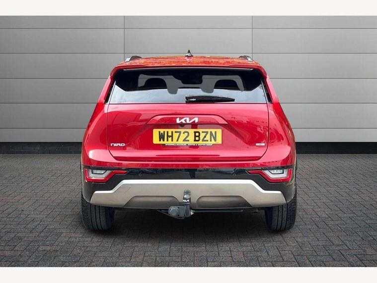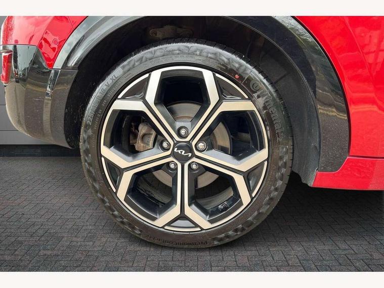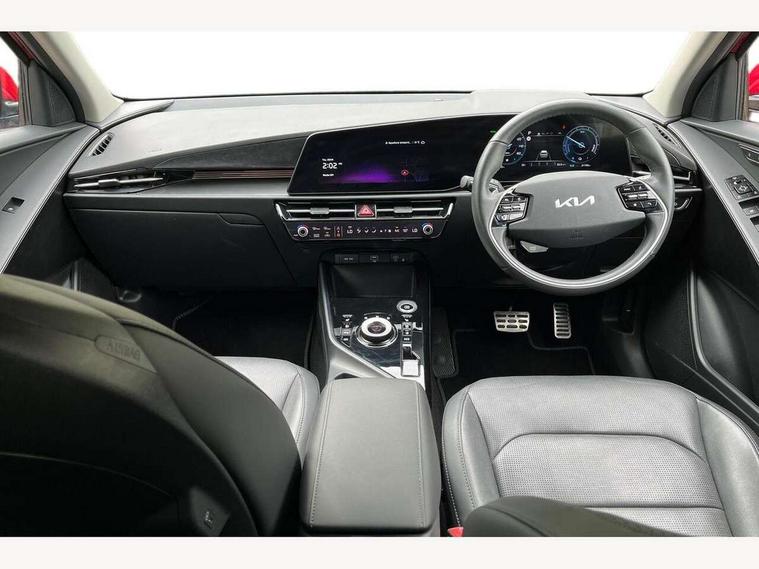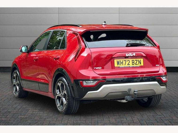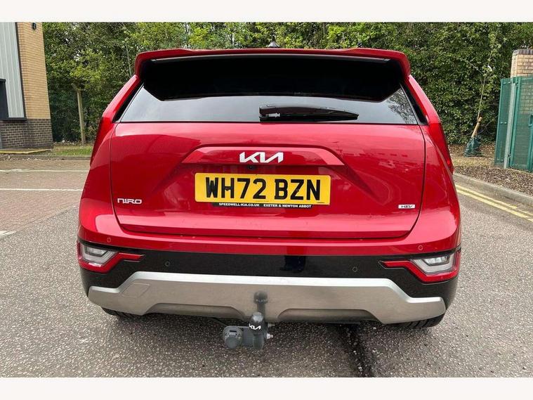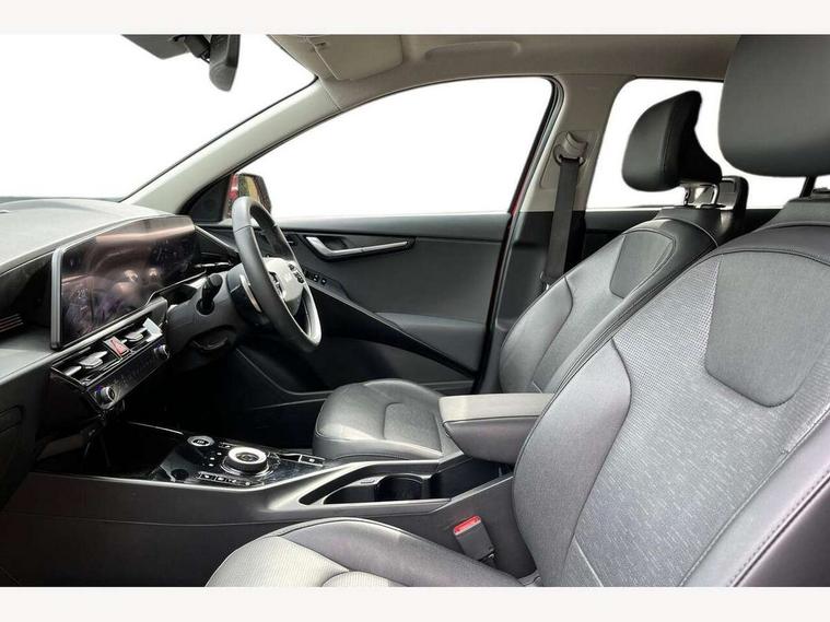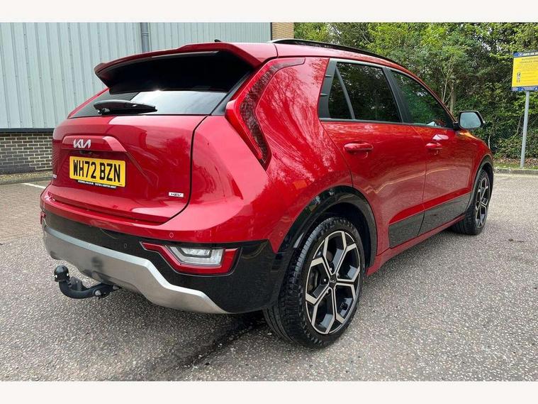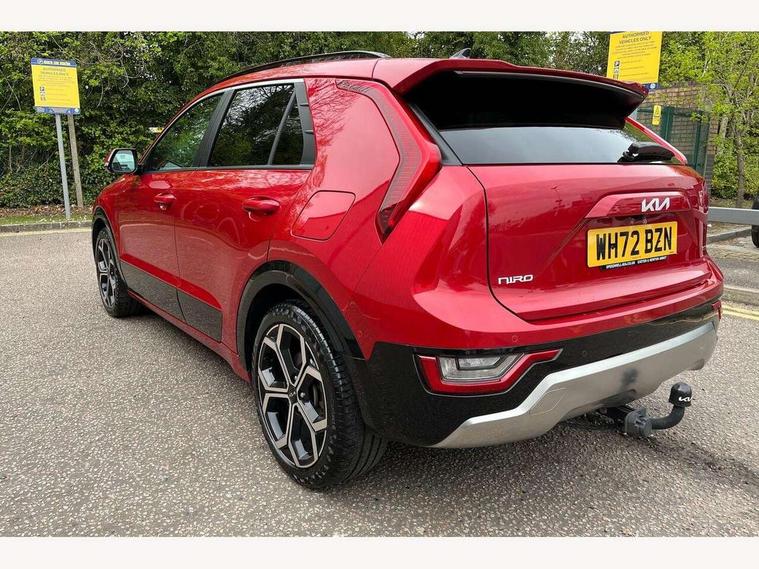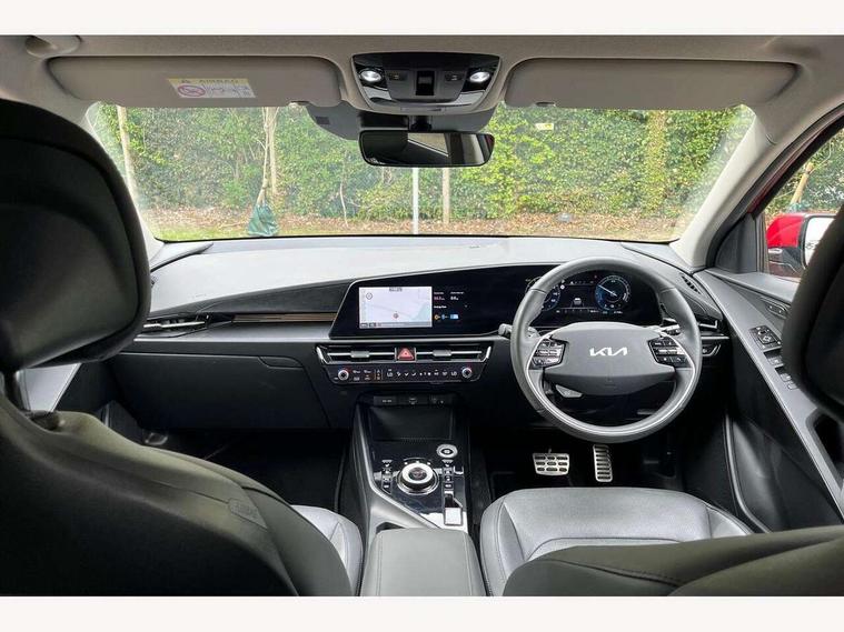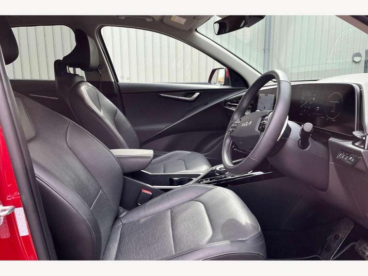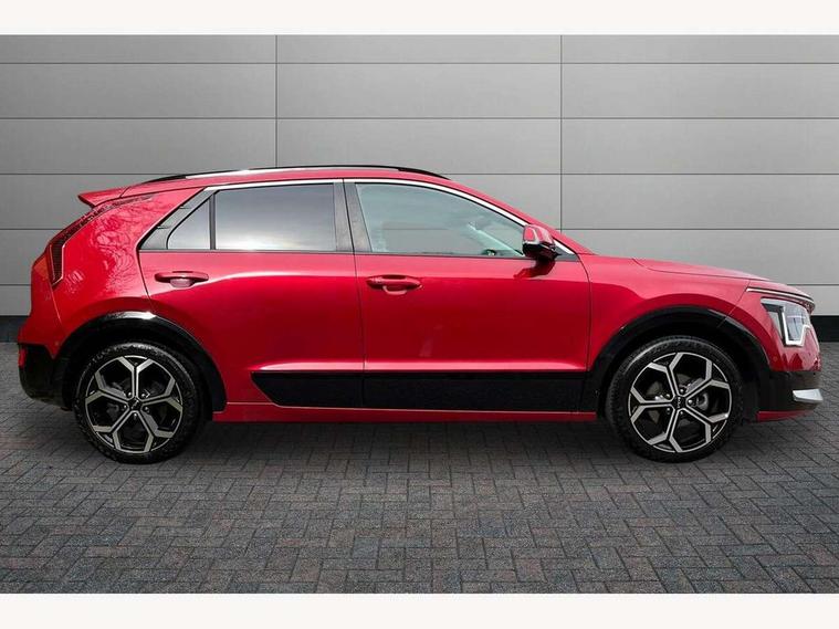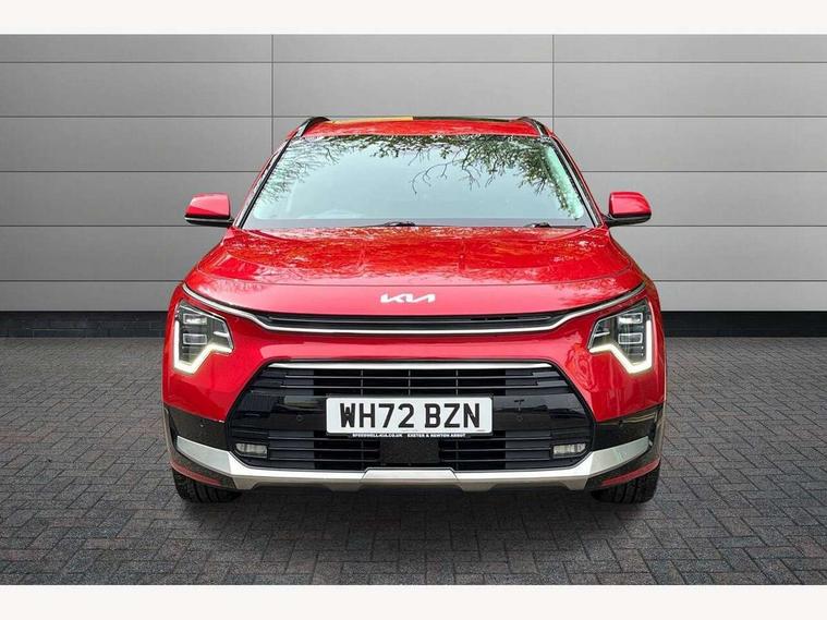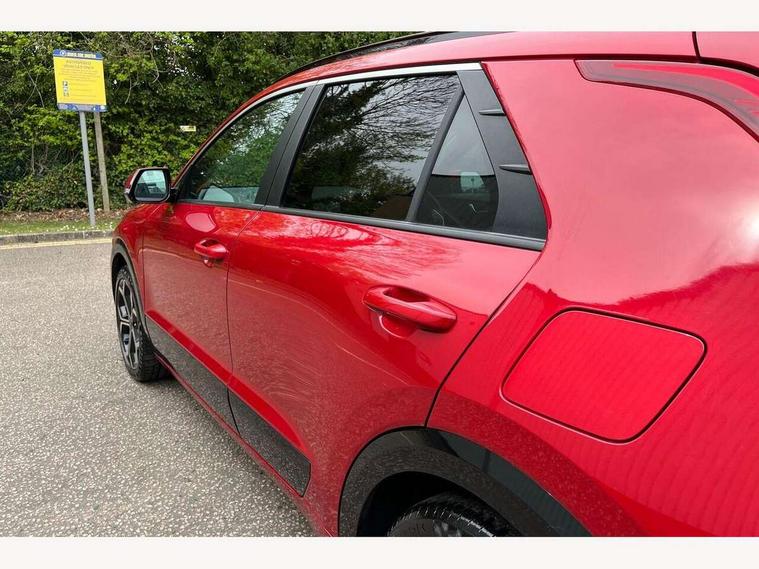 10.25" Supervision colour cluster display, 10.25" touchscreen satellite navigation, Adaptive smart cruise control function (SCC) with stop and go, Apple car play/Android Auto with voice control, Blind spot collision avoidance assist, Drive mode select (Eco, sport), E-call, Emergency stop signalling system, Forward Collision-Avoidance Assist (FCA) 1.5 - City/Pedestrian/Cyclist/Junction turning, Front parking sensors, Head up Display, Highway Driving Assist (HDA), Kia Connect (UVO), Lane Following Assist (LFA), Lane keep assist, Motor driven power steering, Parking collision avoidance assist (PCA), Power opening/closing tailgate, Rear cross traffic alert, Rear parking sensors, Remote smart parking assist, Reversing camera with dynamic guide lines, Safe exit warning (SEW), Speed limit assist, Trip computer with distance/fuel consumption/average speed, Wireless Smartphone charger, 220v AC Inverter, 'Shark fin' mobile antenna, 2 type C USB ports on front seats, 2 USB ports in centre console including 1 type C, 6 speakers, Bluetooth with music streaming, DAB Digital radio, Steering wheel mounted controls, Acoustic windshield, All round electric windows with drivers and front passenger auto up/down and safety function, Auto dimming rear view mirror, Automatic defog system, Automatic headlight control system, Black beltline mouldings, Black grille with chrome surround, Body colour bumpers, Body colour exterior door handles, Deluxe door scuff plates, Dual LED headlights (low and high projection), Electric heated door mirrors, Electrically folding door mirrors, Front and rear chrome skid plates, Front fog lights, Heated rear window with timer, High gloss black cladding, High gloss black door mirrors, LED daytime running lights, LED rear combination lights, LED third brake light, One touch single tilting/sliding power sunroof, Privacy glass - Rear windows and tailgate, Rain sensing front wipers, Rear fog lights, Rear side wing doors, Rear spoiler, Rear wiper, Roof rails, Solar glass windscreen, Welcome and follow-me home light functionality, Windscreen Washer Level Warning, 12V socket in front, 12V socket in luggage compartment, 3 seat bench in 2nd row, 60:40 split remote folding rear seats, All-round height adjustable headrests, Aluminium pedals, Artificial leather centre console storage box, Artificial leather steering wheel, Centre console cupholder, Chrome coating interior door handles, Driver and front passenger power adjusted seat, Driver power adjusted memory seat, Driver/passenger sunvisors with illuminated vanity mirrors, Drivers seat power lumbar support, Dual zone automatic air conditioning, Front and rear door storage, Heated front seats, Heated outer rear seats, Heated steering wheel, Illuminated glovebox, Interior door lock/unlock function, ISOFIX Child seat top tethers and anchor fixings, LED overhead console, 2nd row and luggage lamp, Luggage area load cover, Luggage board, Paddle shifts, Passenger premium relaxation seat, Power adjustable lumbar support on front passenger seat, Rear armrest, Seatback pocket - driver, Seatback pocket - front passenger, Shift by wire SBW, Single front passenger seat, Tilt/telescopic adjustable steering wheel, Vegan leather upholstery, Ventilated front seats, Ventiliation ducts to rear compartment, Towing pack - Niro, 3 point seatbelts on all seats, ABS, Automatic unlocking of doors in case of impact, Centre side front airbags, Curtain and side airbags, Drivers knee airbag, Dual shell horn, Electric parking brake with auto hold function, Electronic stability control, Front passenger airbag deactivation, Height adjustable front seatbelts, Hill start assist control (HAC), Manual rear child locks, Rear seat alert system, Traction control, Tyre pressure monitoring system, Alarm system and engine immobiliser, Deadlocks, Engine Start/Stop Button with Smart Entry System, Locking wheel nuts, Visible vehicle identification number, Warranty - 7 Years/ 100, 000 miles, Centre fascia chopped carbon, 18" Alloy wheels, Tyre mobility kit,