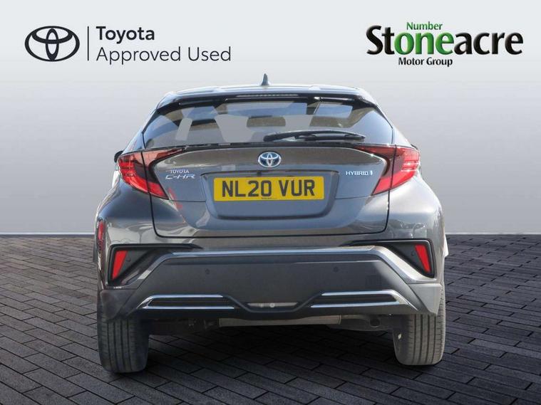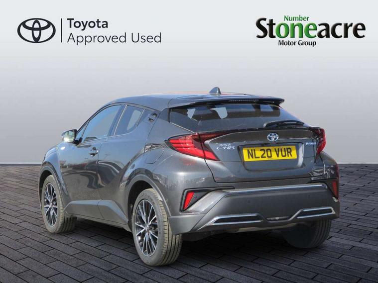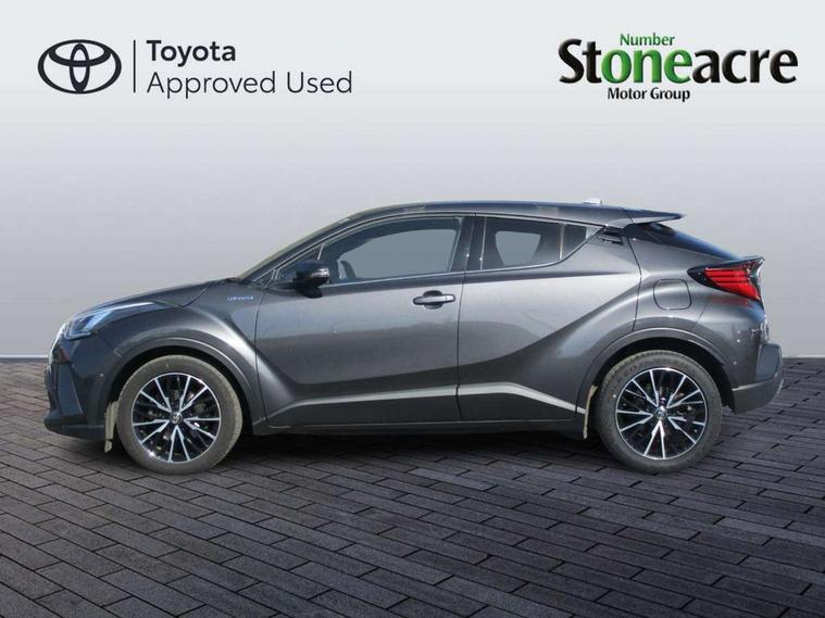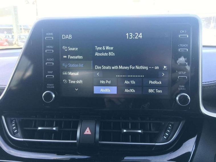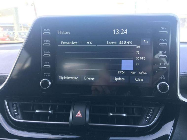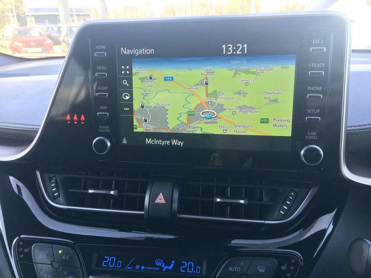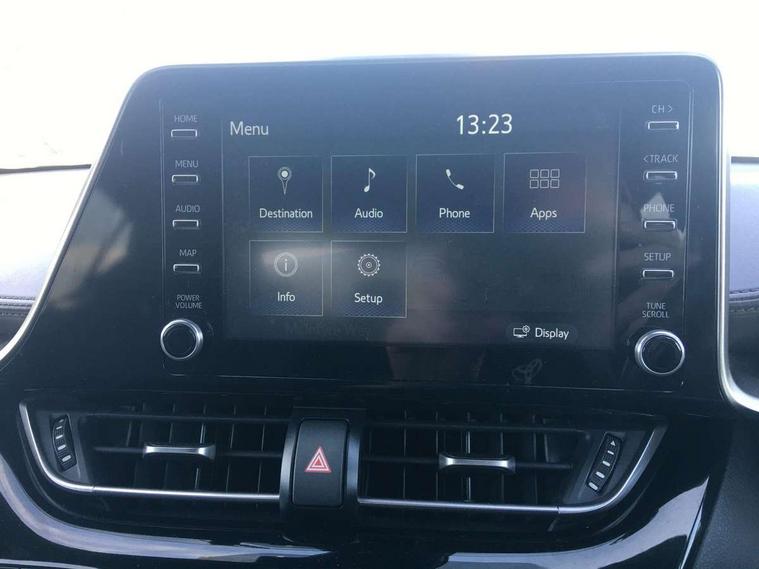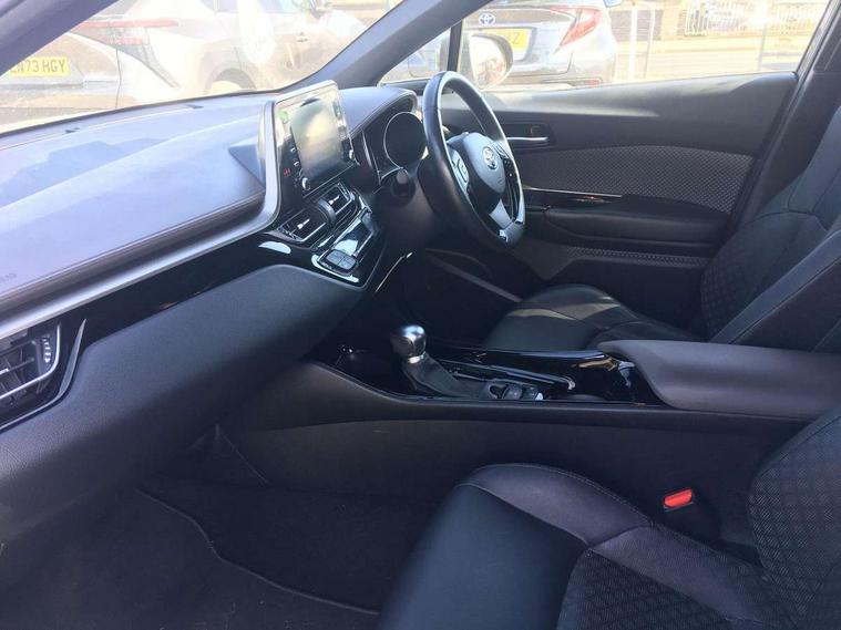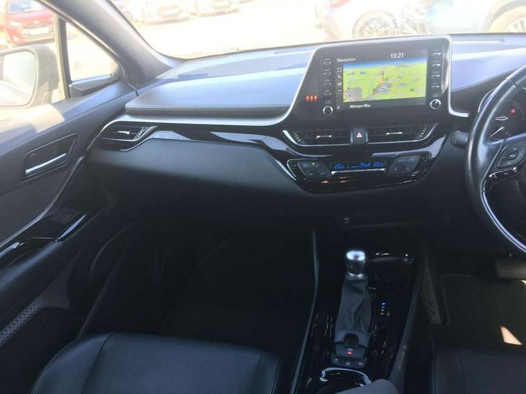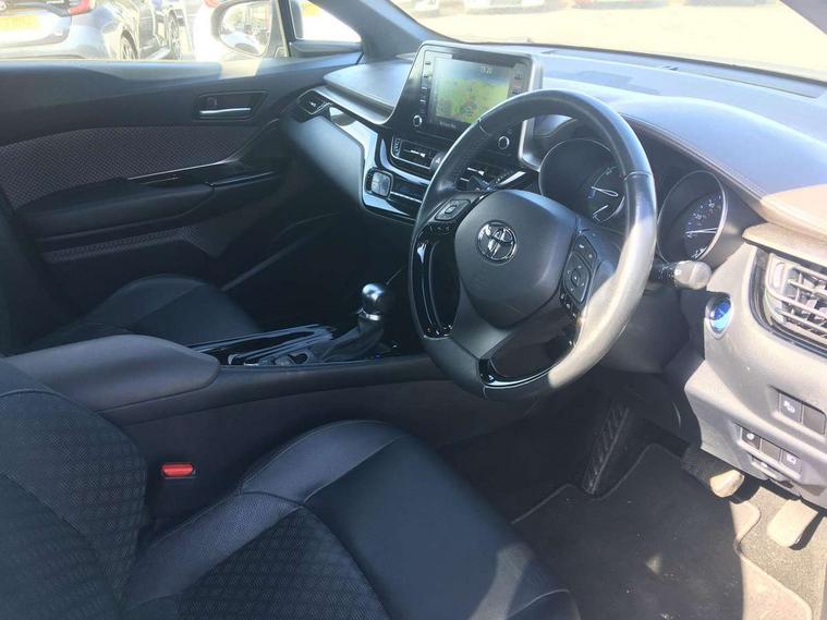 4.2" coloured TFT screen for multi-information display, Adaptive cruise control, Bluetooth connectivity, Electric power steering, Hybrid system indicator, Lane departure alert with steering control, Remote boot door release in cabin, Remote boot door release in key, Reversing camera, Road sign assist - RSA, Simple Intelligent parking assist, Touch 2 Go navigation system, Trip computer, Voice recognition, Vehicle Stability Control (VSC), 6 speakers, Aux connectors + 12V front outlet, DAB Radio (Digital Audio Broadcasting), Toyota touch 2 multimedia system with 8" display, USB connector integrated with radio and CD player, Wi-fi connectivity, Adaptive front light system, Adaptive LED Headlights, Anti-jam protection on power windows, Auto high beam, Auto up and down function on all power windows, Automatic headlight levelling, Automatic headlights, Automatic headlights cut-off, Black and body coloured rear bumper, Black front bumper, Black upper front grille, Body colour door handles, Body colour door mirrors, Boot door release with push button, Electric heated door mirrors, Follow me home headlights, Front and rear power windows, Front spoiler, Hard tonneau cover, Honeycomb lower front grille, LED daytime running lights, LED fog lights, LED front light guide, LED High mounted stop light, LED rear brake lights, LED rear combination lights, Noise reduction layer on front windows and windscreen, Power adjustable door mirrors, Privacy glass, Rear spoiler, Rear tailgate, Rear window defogger, Rear window wiper, Shark fin antenna, UV-filter on driver and passenger windows, UV-filter on rear windows, 12v power outlet - front, 3 rear headrests, 3 spoke leather steering wheel, 60/40 split folding rear seat, Adjustable rear headrests, Adjustable speed limiter switch on steering wheel, Assist grips front and centre pillar, Audio and telephone switches on steering wheel, Black front door assist grips, Blue ambient lighting on front cup holders, Blue ambient lighting on front doors, Boot light, Chrome interior door handles, Driver and front passenger personal light, Driver and front passenger Whiplash Injury Lessening seats, Driver and passenger seatback pockets, Dual zone automatic air conditioning, Front cupholders, Front head restraints, Front sports seats, Glovebox with internal light, Heated driver and front passenger seats, Heated steering wheel, Hooks for luggage holding net, Humidifying Nanoe air purifier, Illuminated entry system, Isofix attachments on rear seats, Leather gearshift, Light on driver sun visor, Light on passenger sun visor, Manual telescopic steering wheel, Manual tilt steering wheel, Microphone on front personal light, Mirror on driver sun visor, Mirror on passenger sun visor, Multimedia switches on steering wheel, Pollen filter, Power adjustable lumbar support on driver seat, Power tilting cushion on driver seat, Shopping bag hooks, Slow opening on lower glovebox, Voice recognition switch on steering wheel, Leather pack - C-HR, Tech with parking sensor pack - C-HR, 16 Disk front wheel brake, 3x3 point rear seatbelts, ABS+EBD+Brake assist, Electronic parking brake, ESP + traction control, Front and rear seatbelt reminder, Front passenger airbag on/off switch, Hill start assist control (HAC), Pre collision system with pedestrian detection, Pre-tensioners and force limiters, Rear door child safety locks, SRS Airbags - Driver + Front passenger, front side, front and rear curtain and driver's knee airbags, Toyota safety sense, Tyre pressure monitoring system, Glass-breaking alarm sensors, Immobiliser, Intrusion alarm, Intrusion sensor, Motion sensor alarm, Power door locks, Power passenger window lock, Remote central locking, Remote door lock, Black lower dashboard, Black lower driver dashboard, Dark brown upper dashboard, Piano black console, Silver deco line on upper dashboard, Tyre repair kit,