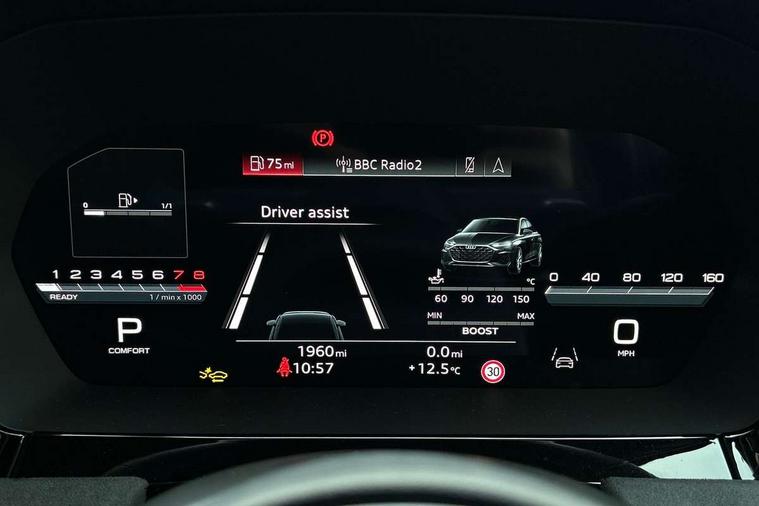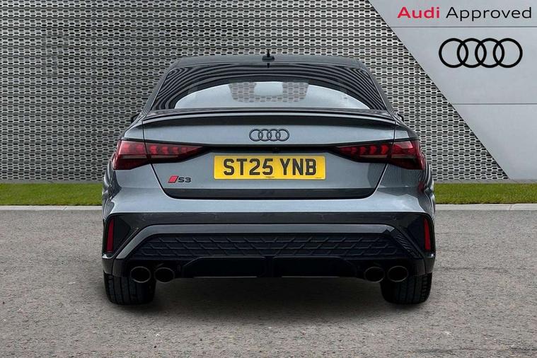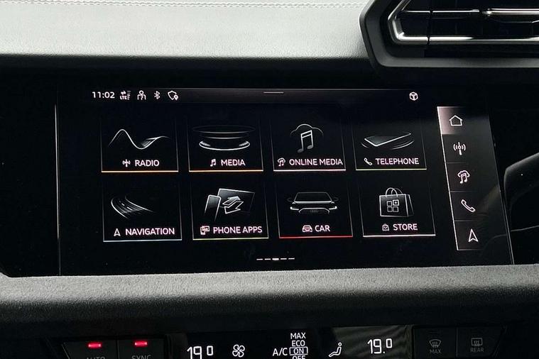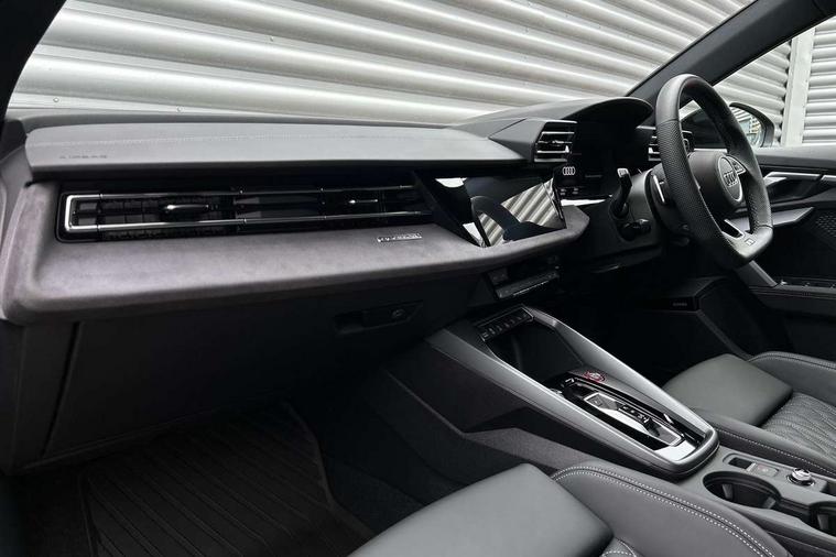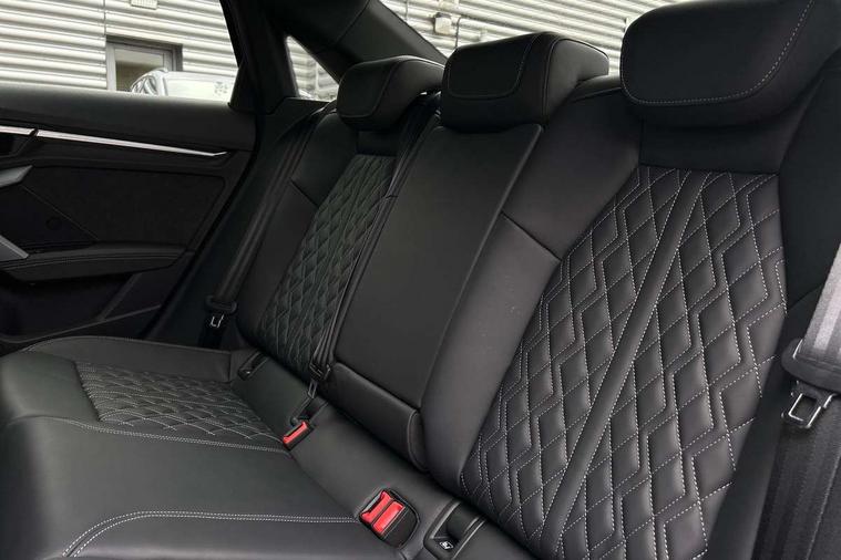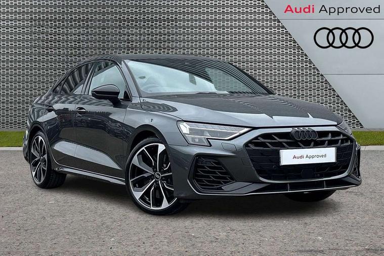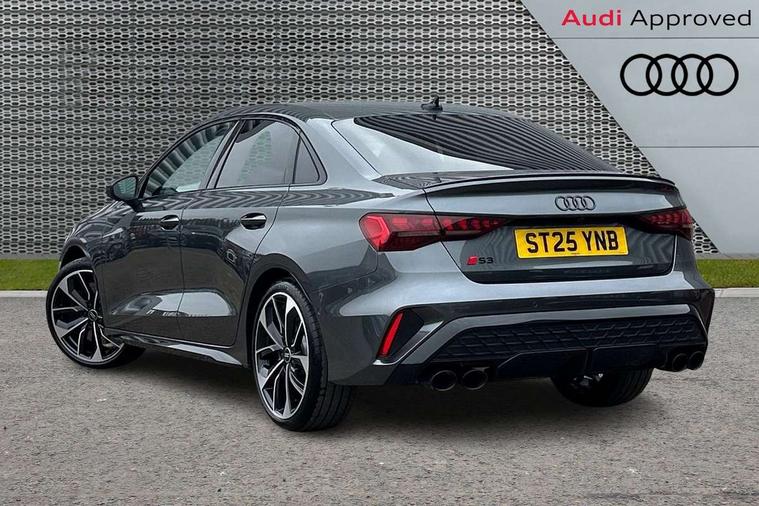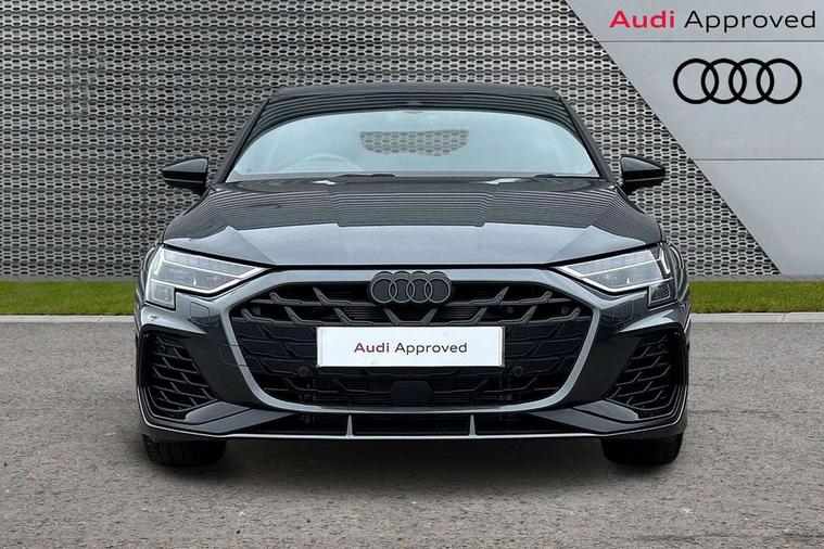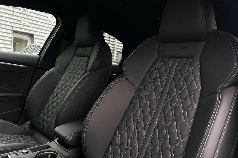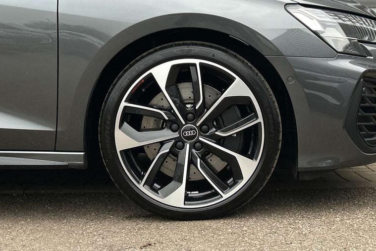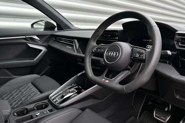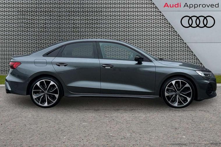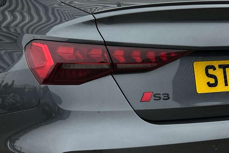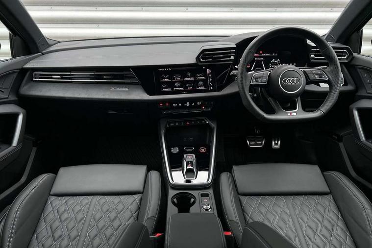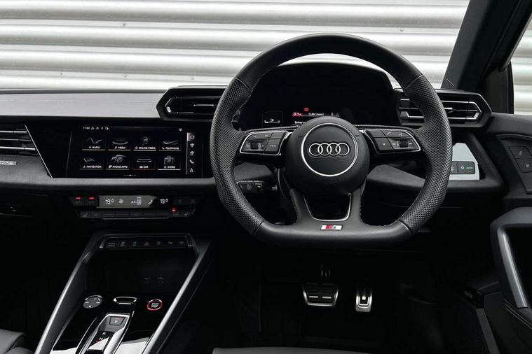 Adjustable speed limiter, Audi drive select, Audi smartphone interface with app store includes wireless Apple carplay, Android auto and Amazon alexa integration, Audi virtual cockpit plus - 12.3" full HD resolution dynamic digital instrument cluster, Automatic start/stop system with recuperation, Bluetooth interface, Camera based traffic sign recognition, Collision avoidance assistant, Distraction and Fatigue warning, e-Call (emergency call), Emergency assist, Lane departure warning system, MMI Navigation Plus with high resolution 10.1" colour touch screen display, Park Assist with parking system Plus, Progressive steering, Service indicator, Trip computer, Voice control system with natural language interaction, quattro permanent all-wheel drive with torque splitter, S sport suspension with spring damper adjustment and lowering by 15mm, Audi Phonebox light with wireless charging, DAB Digital radio, USB ports with charging function in the rear, All weather light, Anthracite grey Audi rings (front and rear), Audi Beam uses LEDs to project the rhombus S logo onto the ground as you exit your S3, Auto dimming frameless rear view mirror, Automatic dynamic range control, Black accents front and rear bumpers including air inlets, Black accents in front grille and frame, Black accents in window trims, Dipped beam, main beam, position light and turning light, Electrically adjustable/heated/folding/auto dimming door mirrors with integrated LED indications + kerb view function for passenger side, Exterior model badging, Front electric windows, Headlight washers, Heat insulating glass windscreen, Illuminated door sills with aluminium inserts at the front with S logo, Intersection light, LED 3rd brake light, LED brake lights, LED daytime running x3, LED headlights with LED rear lights and dynamic rear indicators, LED rear number plate lights, LED reverse light, LED tail lights, Light and rain sensors, Manoeuvring light, Motorway light, Privacy glass - dark tinted rear window, rear door and side windows, Rear boot, Rear diffuser and grill in grained matt black with inlay in dark liquid chrome, Rear electric windows, Rear side wing doors, S grille, S3 front bumper with S specific air intake grilles, Static cornering light, 12V socket and storage compartment in front centre console, 3 seat bench in 2nd row, 3 spoke flat bottomed leather multifunction sport steering wheel with gear shift paddles, 3-zone deluxe automatic air conditioning, 4 way electrically adjustable lumbar support for driver and front passenger, 40/20/40 split folding rear seat bench, Black cloth headlining, Black front and rear floor mats, Fine Nappa leather upholstery with front sports seats S embossed logo, Front and rear centre armrest in artificial leather with contrasting stitching on armrests and instrument panel, Front and rear headrests, Heated front seats, Height and reach adjustable steering wheel, Manual boot compartment lid, Manually adjustable front seats, Rear centre armrest with cupholder, S badging on the steering wheel, Seat side bolsters, Single front passenger seat, Stainless steel pedals and front footrest in black, Aluminium interior elements pack - A3, Storage package - A3 Saloon, Technology package - A3, 3x3 point rear seat belts, Driver and front passenger airbag with passenger airbag deactivation, Electronic Stabilisation Control (ESC) including ABS, ASR and EDL, First aid kit with warning triangle and 2 safety vests, Front side airbags with head airbags and interaction airbag, Hill hold assist, Pre-sense front with pedestrian and cyclist detection, Seatbelt monitoring, Tyre pressure loss indicator, Anti theft alarm, Anti-theft wheel bolts, Electronically operated child locks, Immobiliser, Remote central locking with safelock, Black dashboard, Tyre repair kit,