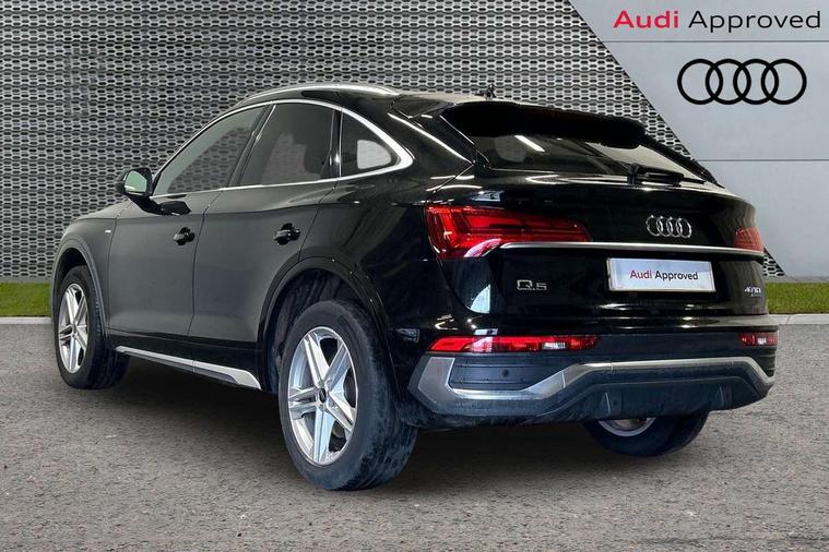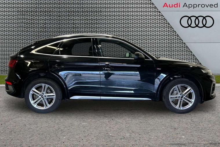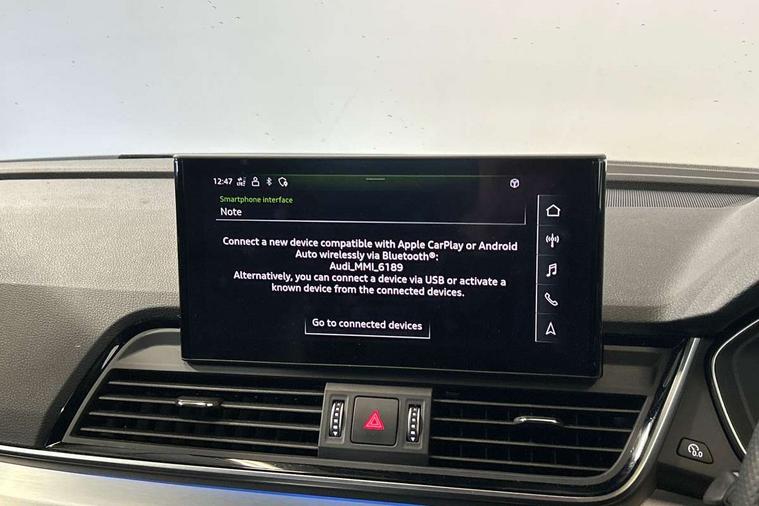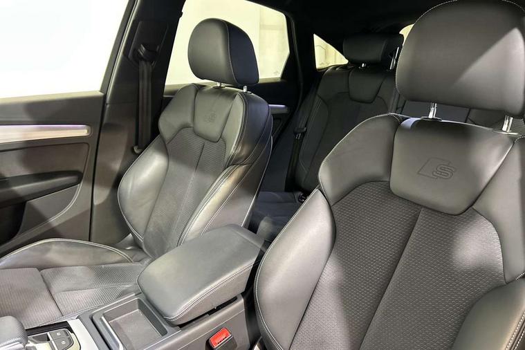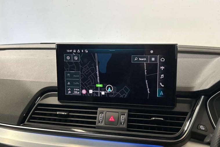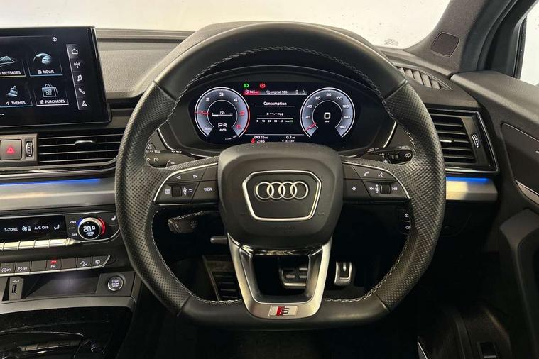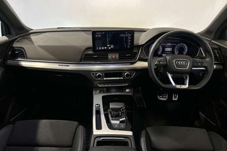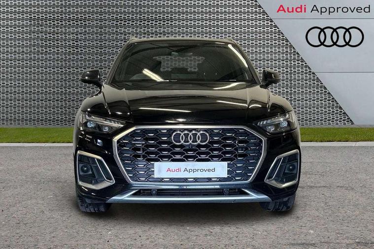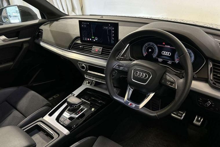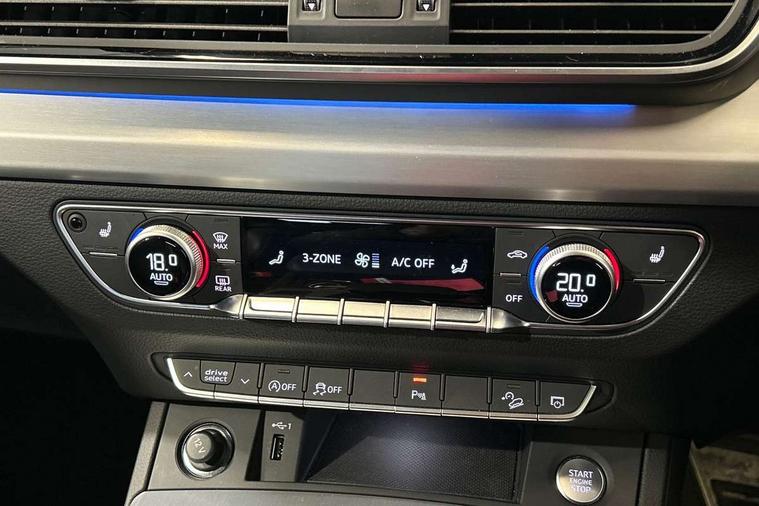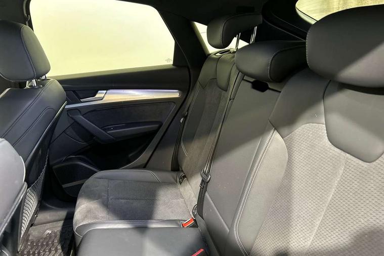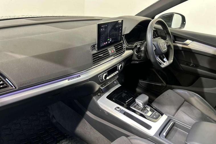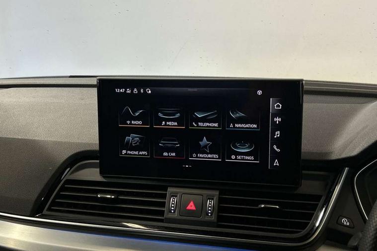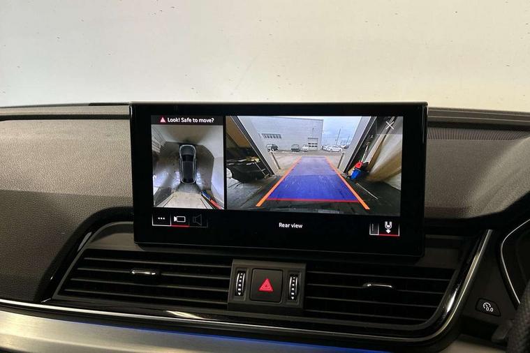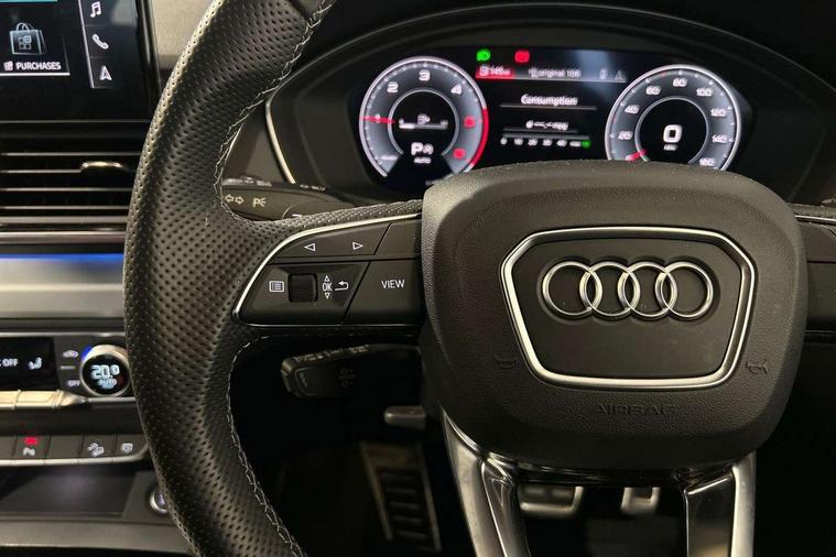 Acoustic front and rear parking sensor, Audi connect safety and service (e-call), Audi connect with Amazon Alexa Integration, Audi drive select, Audi virtual cockpit plus with 12.3" screen and three different layout designs, Audi wireless smartphone interface, Automatic start-stop system with coasting functionality and efficiency programme, Bluetooth interface, Electro - mechanical power assisted steering, MMI navigation plus with 10.1" touch screen, Power tailgate, Reversing camera, Service interval indicator, Voice control system with Audi hotword activation "Hey Audi", Diesel particulate filter, Quattro on demand, S line sports suspension, 2 x USB charging port with aux input socket, 8 loudspeakers, DAB Digital radio, Acoustic windscreen, Aluminium roof rails, Audi matrix LED headlights with dynamic front and rear indicators, Auto dimming door mirrors, Auto dimming frameless rear view mirror, Automatic headlight adjustment, Automatic headlights and windscreen wipers, Body colour door mirrors, Body colour rear diffuser with matt aluminium silver surrounds, Body colour underbody protection, Chrome plated exhaust trims, Daytime running lights, Door sills in Selenite silver, Electric adjustable/heated/folding door mirrors, Front air inlet surrounds in aluminium, Front and rear electric windows, Front radiator grille in honeycomb design, Headlight washers, High level LED brake light, Lower bumpers painted in contrast Manhattan grey, Rear chrome trim strip below lights, Rear privacy glass and rear side windows, Rear side wing doors, Rear wiper, Roof bars, S Line badges on the front wings, S Line front and rear bumpers, S Line rear spoiler, S Line side skirts, 3 rear headrests, 3 spoke leather multifunction steering wheel with S badging perforated leather grips, 40:20:40 split folding 3 rear bench seat in 2nd row with rear centre armrest, Black cloth headlining, Comfort front centre armrest, Contrast stitching on seats, steering wheel and gear lever gaiter, Deluxe 3 zone electronic climate control, Front head restraints, Front/rear floor mats, Gear lever in black leather, Heated front seats, Height/reach adjustable steering column, Illuminated door sill trims with S logo, Manual seat adjustment with 4-way electric lumbar support, Removable luggage compartment floor, Single front passenger seat, Stainless steel pedals, Sunvisors with vanity mirrors, Trunk roller cover, High gloss pack - Q5, LED interior light pack - Q5, 3 point seatbelts on all seats, 6 airbags - Driver, front passenger, curtain and side airbags, Electrically operated child locks on rear doors, Electromechanical parking brake, Electronic stabilisation control including ABS, ASR and EDL, First aid kit with warning triangle and vests, Front passenger airbag deactivation, Hill descent control, Hill hold assist, ISOFIX child seat mounting for front passenger seat and ISOFIX child seat mounting with Top Tether for outer rear seats, Multi collision brake assist, Pop-up bonnet for pedestrian protection, Pre sense city, Seat belt force limiter, Seatbelt monitoring, Tyre pressure warning, Anti theft alarm, Anti-theft wheel bolts, Keyless Go access/ignition system, Remote central locking, Air vents inserts and centre console in gloss black, Matt brushed aluminium inlays,
