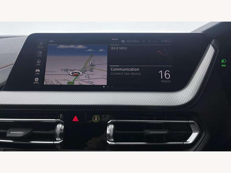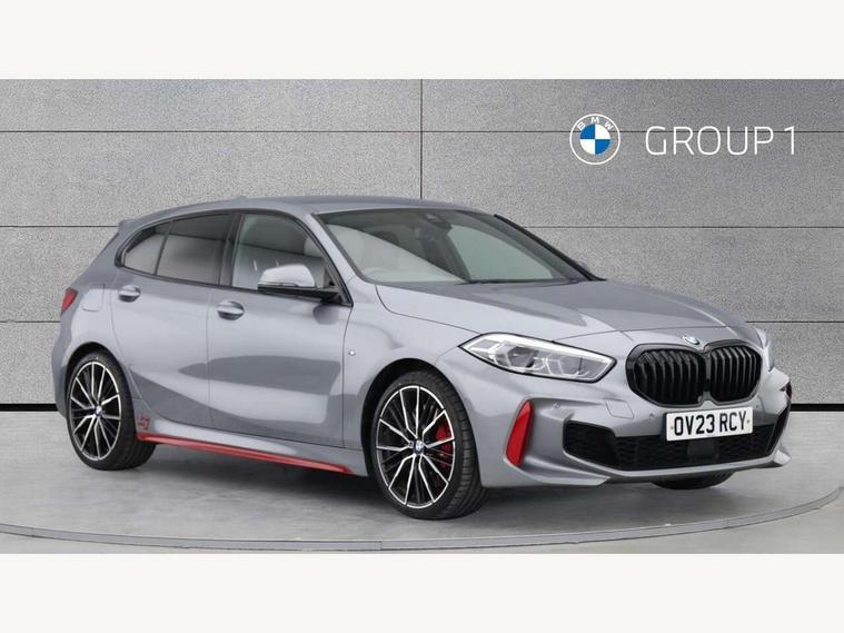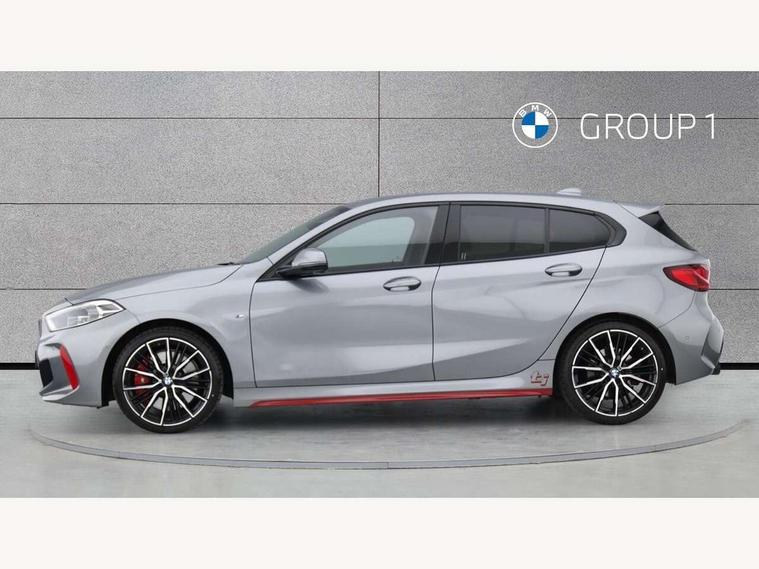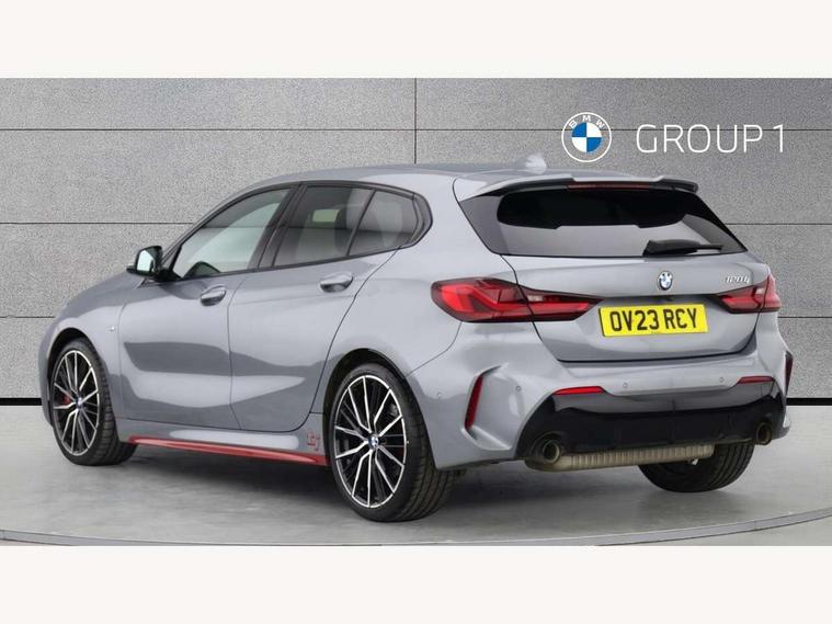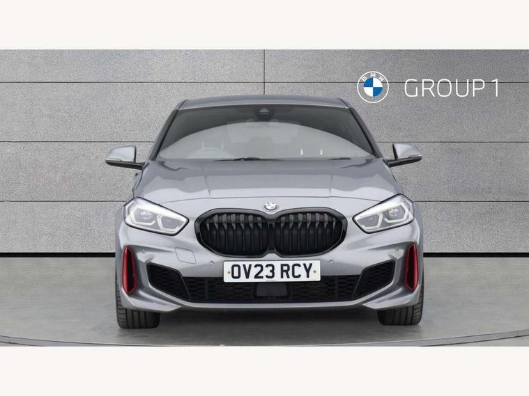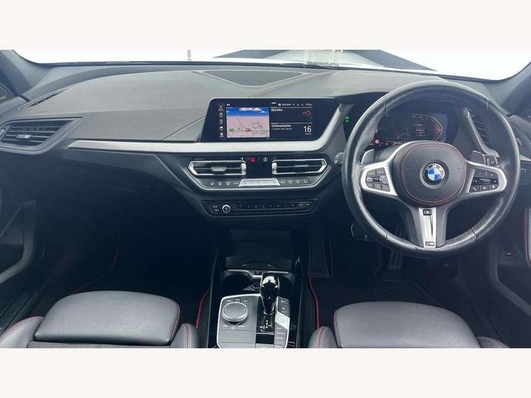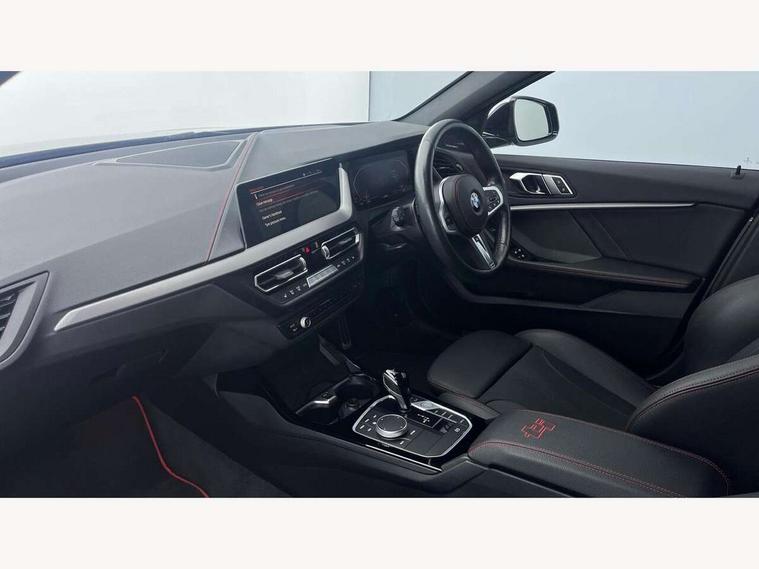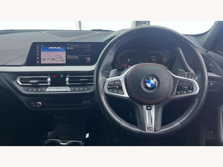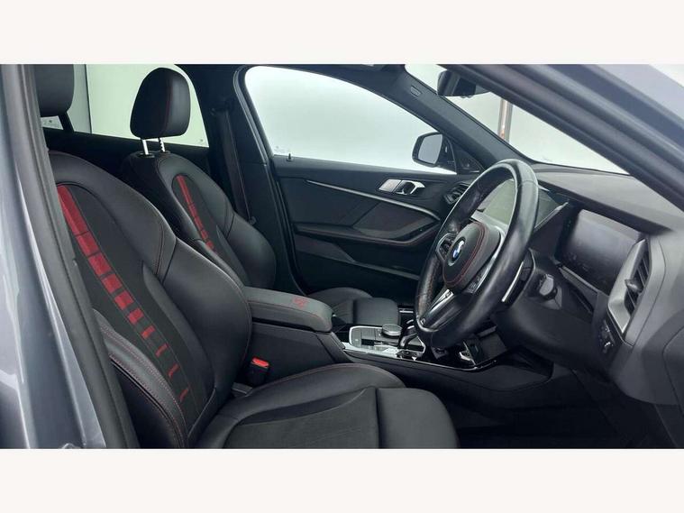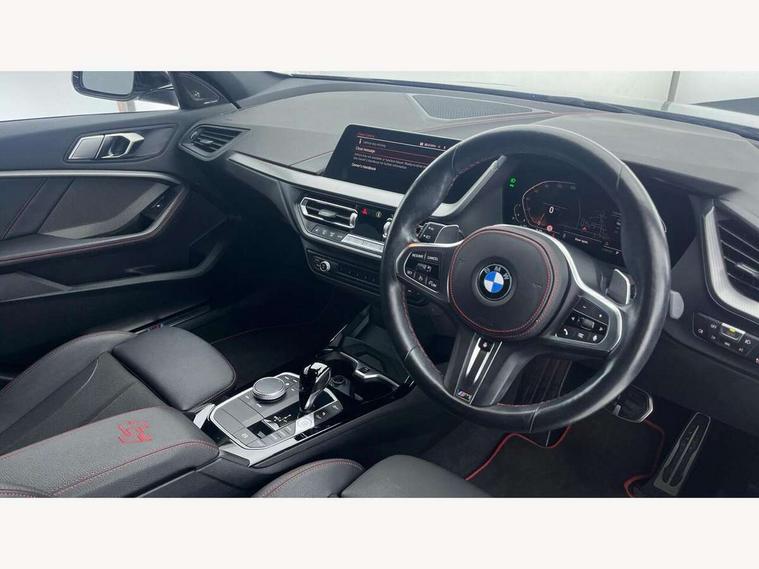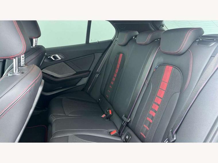 Active guard plus, Attentiveness assist, BMW ConnectedDrive online services, BMW Teleservices, Check Control warning system for monitoring of lights and door/luggage compartment open warning, Cruise control with speed limiter, Eco pro mode, Electric power steering with Servotronic steering optimised at all speed ranges, Front axle single joint with specific axle kinematics to minimise drive influences on steering + provide increased rigidity agile driving behaviour, Integrated owners handbook, Lane departure warning system, Oil sensor for level and grade, On board computer, Optimum shift indicator, Personal Profile, Pull away assistant, Rigidly mounted rear subframe - Multi link construction with separate spring / damper configuration and excellent driving characteristics, Speed limit Info including no-overtaking indicator, Aluminium lightweight construction, Anti roll bar front and rear, Balancer shaft, Double VANOS twin scroll turbocharging system, Drive Performance Control, Eight speed sport automatic transmission with gearshift paddle switches, Electronic differential lock, High precision injection, Larger fuel tank capacity (50 litres), M sport suspension with M128i xDrive specific settings, Petrol Particulate Filter, Twin tube gas filled shock absorbers with degressive characteristic curve, VALVETRONIC engine management, DAB Digital radio, Auto dimming rear view mirror, Automatic headlight beam throw control, Automatic windscreen wipers and automatic headlight, Black chrome tailpipe finishers, BMW individual high gloss shadow line with extended content, Body colour door handles, Body colour mirror caps, Body colour roof trims, Chrome 'M' logo side designation, Chrome kidney grille frame with Satin Aluminium struts, Direction indicator side lights in exterior mirrors, Electrically adjustable exterior mirror with mirror adjustment switch on drivers armrest and aspheric on driver side, convex on passenger side, Fading support, Folding side mirrors with auto dimming/folding wing mirrors with auto dimming, Follow me home headlights, Front and rear bumper system with replaceable deformation elements, Front and rear electric windows with open and close fingertip control, anti trap facility and comfort closing, Front door sill finishers in black plastic with M designation in metallic look, Green tinted heat protection glazing, High gloss shadowline window frame, Recess cover mirror frames and B/C pillar embelisher trim, High level third brake light, Integrated front windscreen with washer jets, Kidney frame and struts in high gloss black extended, LED daytime running lights, LED eyebrow turn indicators, LED front fog lights, Lightweight engineering, Matt black air guide grilles, Matt black wheel arch trim, Model designation on electric bootlid, Nearside reverse light in rear light cluster, Preparation for high beam assistant, Rear fog lights, Rear side wing doors, Rear window wiper, Shark fin antenna, Trailer stabilisation logic, Visible VIN plate, Welcome lighting, 12V power socket in front centre console with blanking plug, 3 rear seat head restraints, 3 seat bench in 2nd row, Anthracite headlining, Black boot net with lashing eyes, Cargo function on 2nd seat row, Child seat ISOFIX attachment for two outer rear seats and front passenger seat with anchorage points, Conditioned based service, Driver and front passenger backrest net on rear, Driver and front passenger seat heating, Driver side folding compartment in instrument panel, Folding rear clothes hook, Four grab handles integrated in roof lining, Front and rear door pockets with bottle holders, Front and rear side armrest integrated into door trim, Front armrest, Front sports seats, Glove compartment, Height adjustable front head restraints, Luggage compartment for bag hooks on left and right, foldable luggage compartment liner and four lashing eyelets, Manual adjust steering wheel, Multi-function controls for steering wheel, Single front passenger seat, Storage compartment in centre console, Storage compartment in luggage compartment, Stowage of the parcel shelf in luggage compartment trim, Sun visors with vanity mirrors and insert tab, Three spoke M sport design multi function leather steering wheel in unique red stitching, Two front centre console cupholders, Two zone automatic air conditioning, Type C two USB ports in rear centre console, Additional interior lighting pack - 1 Series, BMW live cockpit professional pack- 1 Series, Connected pack professional - 1 Series, Interior lights pack - 1 Series, M Sport exterior styling aerodynamics pack - 1 Series, 2 tone horn, 3 point seatbelts on all seats, front pyrotechnic belt tensioners, stopper and belt force limiters, rear coded belt buckles, Airbags - Front driver/passenger, front and rear curtain head protection, front side, manual deactivation of front passenger airbag, Anti lock braking system (ABS) with brake assist, BMW emergency call, Brake drying, Braking readiness, Child proof locking system in rear door, City braking function, Comfort modes, Cornering brake control, Crash sensor activating of airbags, Unlocking doors, hazard warning lights, interior light, safety battery terminal, Driver and front passenger seat belt security check, Dynamic stability control + (DSC+), Dynamic Traction Control - DTC, Electrically operated hand brake including automatic hold function, Front and rear disc brakes, M Sport brakes with red calipers, M Sport seatbelts, Seatbelt warning, Side impact protection, Tyre pressure monitoring system, Warning triangle and first aid kit, Central locking switch for all doors, fuel filler cap and luggage compartment, Deadlocking function system to all doors, Drive away locking system on all doors and luggage compartment with de-activated in iDrive settings, Locking wheel bolts, Remote control with integrated key with High-gloss Black inlay and M designation and 1 button for open/ close lock, window, open luggage compartment, Start/stop button illuminated in