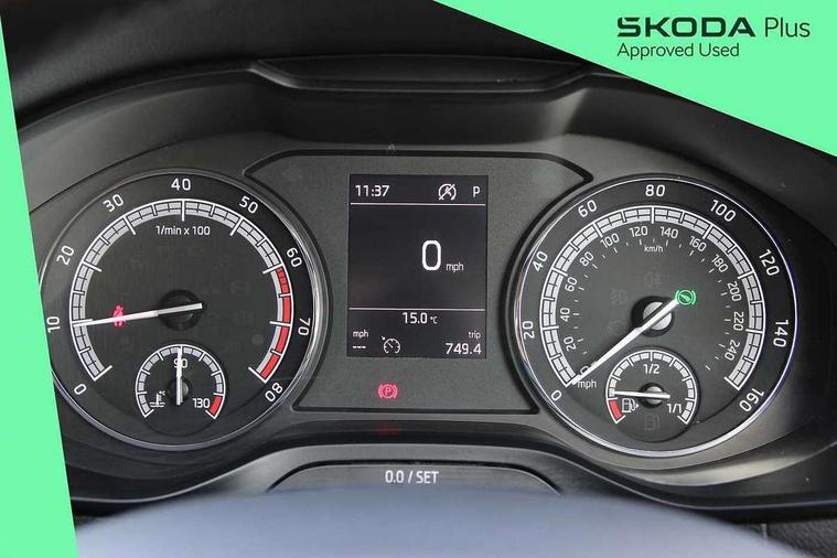 Chrome framed air vents, Storage on wheel cover, Alarm with interior monitoring, back up horn and tilt sensor with safe function, Electronic engine immobiliser, Remote central locking with 2 remote folding keys, DAB radio with Bluetooth, SD card slot, USB connection, Airbags - Front side, head, knee and curtain, Automatic door unlocking in case of crash, Automatic fuel cut off in case of crash, Driver airbag, Electronic parking brake with auto hold function, Emergency rear braking signal, ESC including ABS, MSR, ASR, EDS, HBA, DSR, RBS, MKB and traction control, Front assist radar scanning of the space in front of the car with automatic braking, Hill hold control, Passenger airbag with switch-off function, Pedestrian monitor, Three point seatbelts rear, Two tone horn, Tyre pressure display, Tyre pressure monitor, Acoustic glass, Aero front windscreen wipers with intermittent function, Automatic headlight control system, Body colour door mirrors and handles, Body coloured bumpers, Electric front and rear windows with child proof lock, Electrically adjustable heated folding and auto dimming door mirrors with boarding spots, Heated rear windscreen, LED rear lights with high functionality, Light assistant (coming/leaving home/tunnel light), Privacy glass, Safety reflectors on front doors, Third brake light, 1.5 litre bottle holders in driver and front passenger door panels, 12V socket in boot, 12v socket in front centre armrest with storage compartment and rear air vents, 2 Folding hooks and nets in boot, 2 Front readings lights for driver and passenger, 3 rear height adjustable headrests, 4 foldable roof handles with rear coat hooks, 4 lashing points on luggage floor, Backrest release, Cargo elements in boot, Chrome inner door handles, Driver and passenger seats height adjust, Dual zone climate control, Folding tables on the front seat backrests, Front seat and rear pockets, Height adjustable front three point seats belts with tensioners, Height/reach adjust steering wheel, Ice scraper, Illuminated and cooled glovebox, Illuminated luggage compartment, Isofix child seat preparation outer rear, Manual lumbar support for front seats, Net programme in boot, Pen holder, Pollen filter, Rear boot cover, Rear reading lights, Rear seats fixed folding and divided 60:40, Removable LED torch in the boot, Safety vest holder, Seatbelt reminder signalisation and pretensioner for all seats, Storage box in upper central dashboard closed, Storage net on centre console passenger side, Sunglasses storage compartment, Sunvisors with illuminated vanity mirrors, Umbrella under passenger seat, Driver alert system, Driver fatigue sensor, Driver profile selection, Electro-mechanical PAS, Outside temperature gauge, Service interval indicator, Start/stop system with regenerative braking,