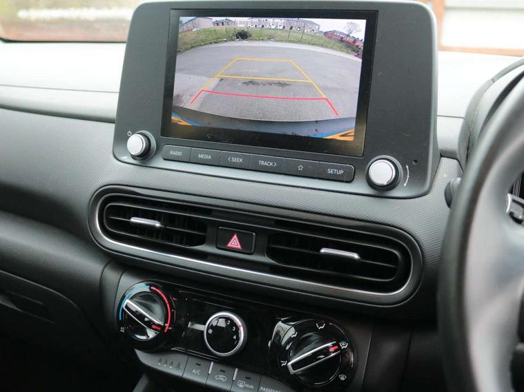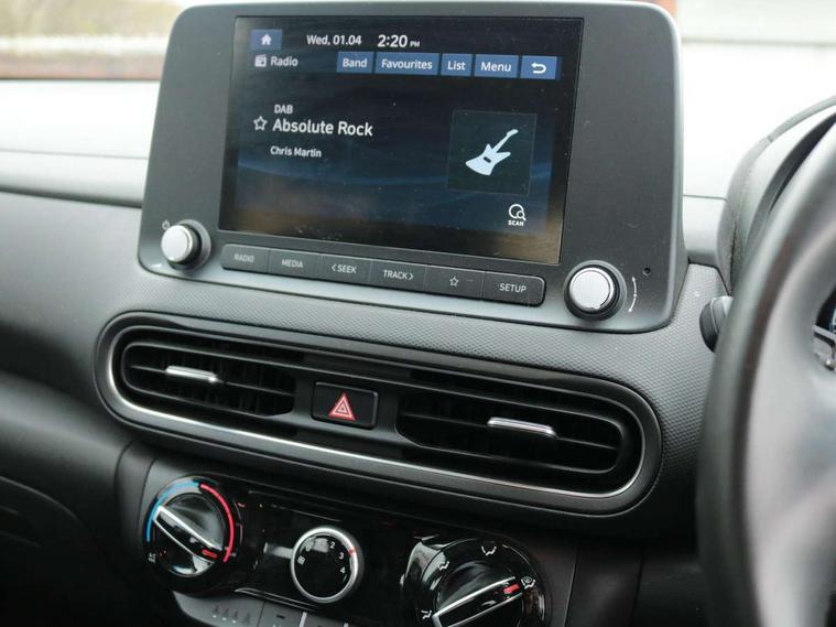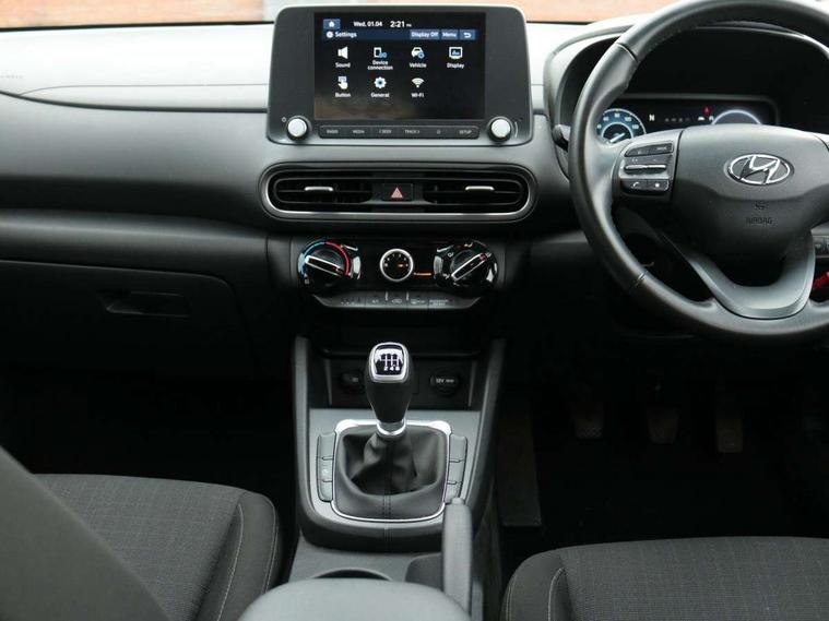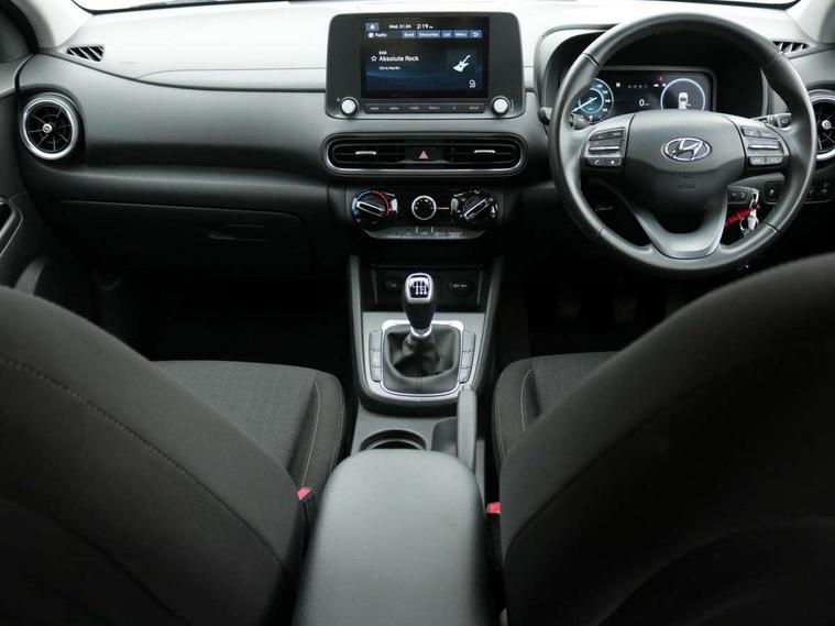 8" Touchscreen display audio + smart device integration, Bluetooth connectivity, Cruise control + speed limiter, Digital clock, Driver attention warning, Driver supervision instrument cluster with 10.25" LCD display, eCall emergency call system, Forward collision avoidance assist with pedestrian detection, Lane follow assist, Lane keep assist, Leading vehicle departure alert (LVDA), Parking system with rear camera and guidance system, PAS, Phone connection with apple carPlay and android auto, Rear parking sensor, Roadside assistance, Windscreen washer fluid sensor and warning indicator, 6 speed intelligent manual transmission, 6 speakers (2 front, 2 tweeters, 2 rear), Front USB ports, RDS and Digital DAB, Steering wheel mounted audio/phone controls, Automatic headlights with dusk sensor, Body colour door mirrors and handles, Door mirror integrated indicators, Electric front/rear windows with drivers one touch/anti-trap, Electrically adjustable and heated door mirrors, Halogen headlights, Halogen rear lights, LED daytime running lights, Positioning Lights - LED, Rain sensor, Rear roof spoiler with integrated LED brake light, Rear side wing doors, Rear wiper, Roof rails, Tinted glass with front door glass and windscreen with shade band, 12V power outlet in front console, 3 seat bench in 2nd row, 60/40 split folding rear seat, Adjustable head restraints, Air conditioning, Centre interior light, Cloth upholstery, Door scuff plate, Driver's seat height adjustment, Driver/passenger sunvisors and illuminated vanity mirrors, Front interior light, Front passenger seat manual adjustments, Height/reach adjustable steering column, Isofix rear child seat fastenings, Leather wrapped steering wheel and gear knob, Luggage compartment lighting, Luggage hooks, Metal paint effect interior door handles, Parcel shelf, Rear centre console with air vents, Single front passenger seat, Sunglasses holder, Vertical adjustment rear head restraints, Trailer wiring package - Kona, Airbags - front, front side and curtain airbags, Anti-lock brake system (ABS), Childproof rear door locks, Downhill brake control, EBD + Brake Assist, Electronic stability control, Fasten seatbelt reminder, Fixed 3 point for second row centre passenger seatbelt, Front seatbelt pretensioners, Height adjustable front seatbelts, Hill start assist control (HAC), Manual parking brake, Passenger airbag deactivate switch, Rear seat alert, Traction control, Tyre pressure monitoring system, Alarm/immobiliser, Deadlocks, Folding key, Locking wheel nuts, Remote central locking, 17" Alloy wheels,