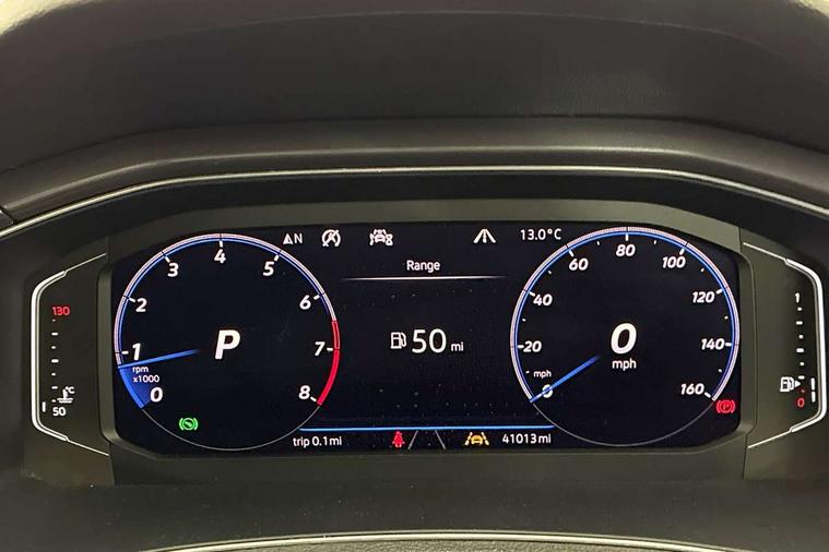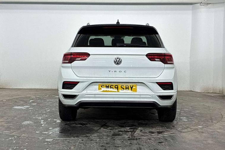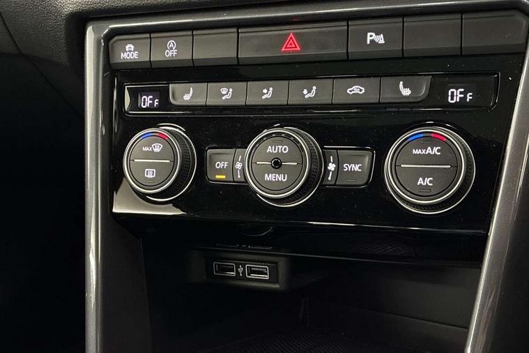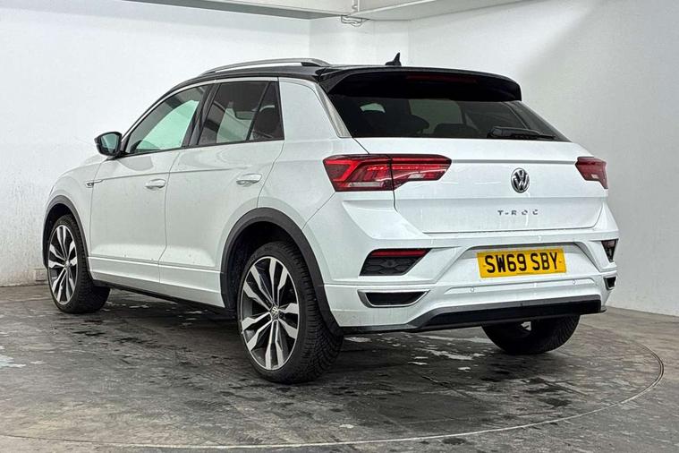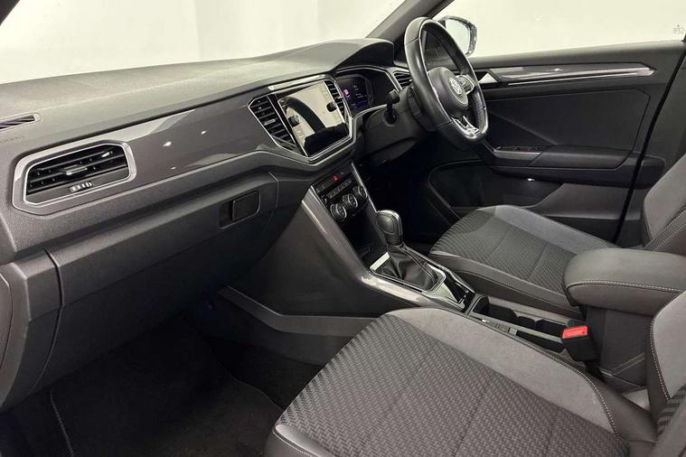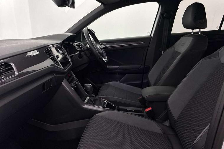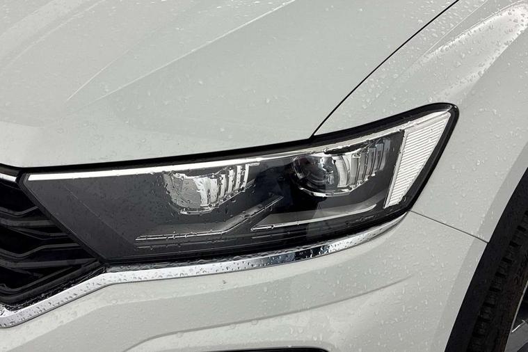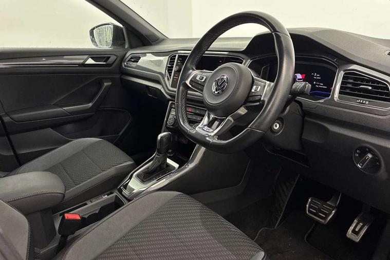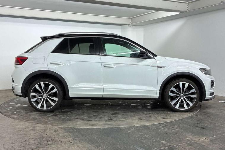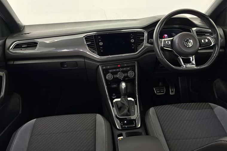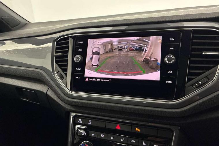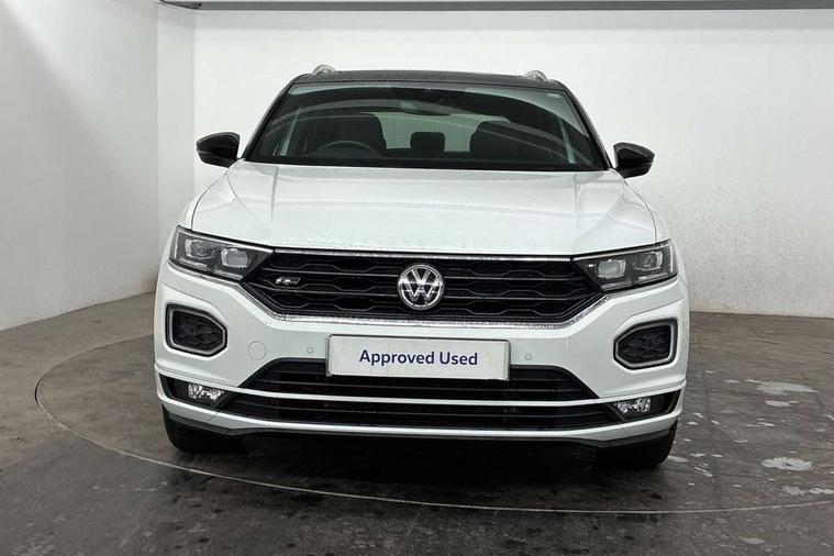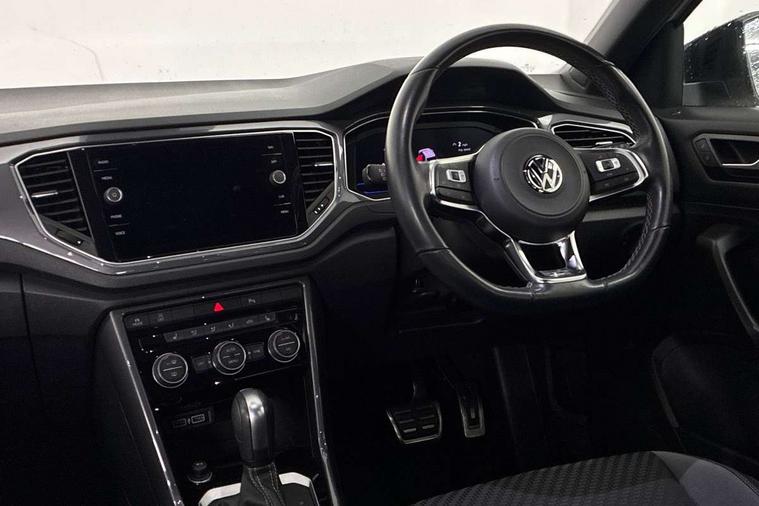 2 USB connection charging sockets, Active Info Display, 10.3" high resolution TFT dash display screen with customised information, Adaptive cruise control, App-Connect, Automatic start/stop system, Bluetooth telephone and audio connection for compatible devices, Car information display, Car-Net Security and Service, Discover navigation, 8" touch screen navigation/infotainment system with Car-Net, European map, CD/radio, 2D/3D map and speed limiter, Driver alert system with audible and visual fatigue detection system, Driver profile selection, Front assist, radar sensor controlled distance monitor, city emergency braking + predictive pedestrian protection, Lane assist, Multifunction computer with visual gear change recommendation for fuel consumption, Progressive power assisted steering, Service interval indicator, Think blue trainer driver tips and journey analysis, Voice activation, Warning sound and light for doors and tailgate open, Warning sound and light for front seatbelts unfastened, Battery regeneration during braking, Bluetooth - Simultaneous pairing of 2 compatible mobile devices, DAB Digital radio, Dynamic navigation based on TMC+, Multi device interface (MDI) with USB connection, Music playback - MP3, WMA and AAC files, Premium USB cable in choice of either Apple or Android smartphone compatibility, SD card slot, SMS functionality - read, compose and send SMS messages using touch-screen display, Three route options - Fast, Short, Eco, Title and cover art display, Auto dimming interior rear view mirror, Automatic hazard lights activation under emergency braking, Black grained lower door protectors, Black grained wheel arches, Body colour door handles, Body colour rear roof spoiler, Chrome effect left and right trapezoid exhaust tailpipe fascia surround, Chrome trim on upper and lower radiator grille, Door mirror integrated indicators, Dusk sensor, Electrically foldable, adjustable and heated door mirrors with puddle lights and reverse activated kerb-view adjustment on passenger's door mirror, Front and rear electric windows, Front fog lights with static cornering function, Front windscreen wiper with intermittent wipe and 4 position delay, Fully galvanised body, Heated rear window, High level 3rd brake light, LED darkened rear light clusters, LED rear number plate lights, Manual coming/automatic leaving home lighting function, Rain sensor, Rear tinted glass from B-pillar backwards approx 65% tinted, Rear windscreen washer and wiper with interval delay, 12V socket in centre console storage area, 2 LED front and rear reading lights, 3 rear head restraints, 4 load lashing points in luggage compartment, Aluminium pedals, Ambient lighting in front footwell and light strips below trim in front doors, Black decorative sleeve on gear handles, Black roof lining and sun visors, Carbon flag cloth upholstery, Climate control - 2 zone electronic air conditioning with automatic air recirculation and allergy filter, Drawer under drivers seat, Front + rear carpet mats, Front centre armrest with storage compartment, longitudinal and height adjustable and two rear air vents, Front cupholders x 2, Front footwell illumination, Front seat back storage pockets, Front sport seats, Glovebox, Height adjustable front seats, Height/reach adjust steering wheel, Illuminated vanity mirrors, Instrument lighting, white adjustable panel illumination, Interior light delay, Isofix easy fit child seat preparation for 2 outer rear seats, Load through provision with single cup holder when folded down, Luggage compartment cover, removable, Luggage compartment lighting, R Line badge, Split folding rear seat backrests with centre armrest, Storage compartment in left and right luggage area, Storage compartment in rear doors, Storage compartments in driver and front passenger doors, Three spoke multi function leather trimmed steering wheel and gear knob including paddle shift, Unique R Line door sill protectors, R line styling pack - T-Roc, Winter pack - T-Roc, 3 rear three point seatbelts, ABS, Driver and front passenger safety-optimised head restraints, Electronic parking brake with auto hold, ESC with EDL, ASR, EDTC and trailer stabilisation function, Front and rear curtain airbags, driver and front passenger airbags with passenger deactivation switch and front side impact airbags, Rigid safety cell with front and rear crumple zones, Three point height adjust front seatbelts + pretensioners, Tyre pressure loss indicator, Ventilated front and rear disc brakes, Volkswagen roadside assistance, Alarm with remote central locking and interior protection, Electronic engine immobiliser, Remote central locking with 2 remote folding keys, Shadow steel decorative inserts in dash and door panel, 19" Suzuka alloy wheels with low rolling resistance tyres and anti wheel bolts, Steel space saver spare wheel,
