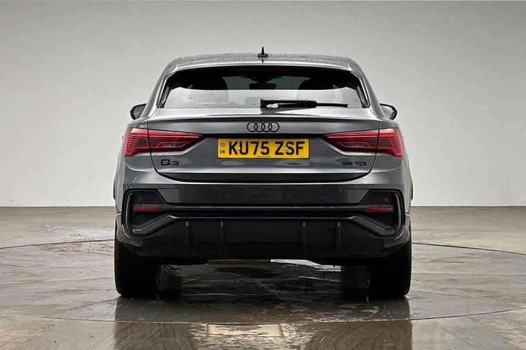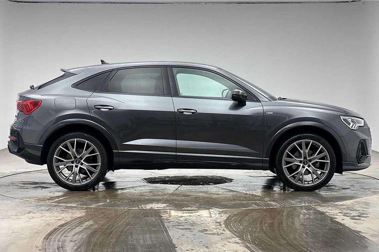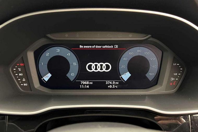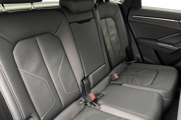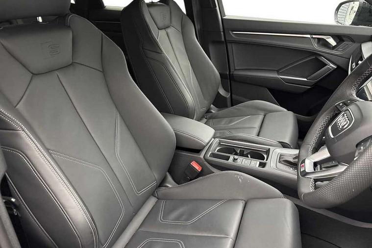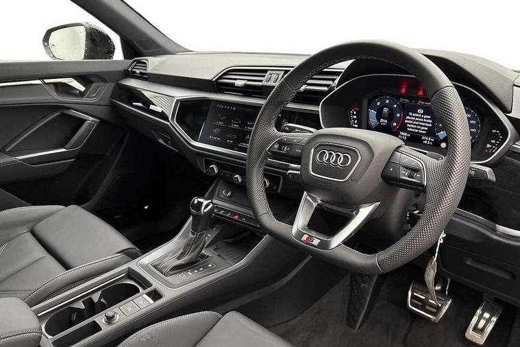 Audi connect safety and service, Audi drive select, Audi lane departure warning, Audi Virtual Cockpit - 10.25" display, Bluetooth interface, Camera based traffic sign recognition, Distraction and Fatigue warning, Legal emergency call, MMI Navigation Plus with high resolution 10.1 inch touchscreen colour display, Power operated tailgate, Progressive steering, Service interval indicator, Smartphone interface includes wireless Apple carplay/Android Auto, Start stop system with recuperation, Voice control system with natural language interaction, Diesel particulate filter, Sports suspension, 2 USB-C ports with charge and data functions, 6 passive loudspeakers, DAB digital radio module, Acoustic windscreen, Audi Beam uses LEDs to project the Audi logo onto the ground as you exit your Q3, Auto dimming door mirrors, Auto dimming frameless rear view mirror, Electrically folding, adjustable and heated door mirrors with integrated LED side indicators and kerb view function for passenger side, Front and rear electric windows, Front fog lights, Front underbody protection in manhattan grey paint finish, High gloss black finish B and C pillars, Honeycomb design radiator grille in matt anthracite black, LED Dynamic rear indicators, LED headlights with LED daytime running lights, LED rear lights, LED third brake light, Privacy glass dark tinted rear and rear-side windows (from B-pillar backwards), Rain and light sensors, Rear diffuser grille in grained matt black, Rear diffuser strip in matt anthracite black, Rear side wing doors, Rear underbody protection in matt black, Rear wiper, S line front and rear bumpers and side skirts in contrasting Manhattan grey paint finish, Variable front intermittent wipers, 12V socket in rear centre console, 3 seat bench in 2nd row, 40:20:40 folding with manual adjustment for 60:40 forwards/backwards position and backrest angle, Adjustable rear seat bench/backrest with centre armrest and cupholder, Black carpet mats, Black cloth headlining, Dual zone electronic climate control, Electric lumbar support, Front and rear black floor mats with contrast stitching in rock grey, Front and rear headrests, Front centre armrest, Height and reach adjustable steering wheel, Illuminated door sill trims with S logo, ISOFIX child seat mounting for front passenger with airbag deactivation and outer rear seat including top tether attachment point for outer rear seats, Luggage compartment sill protection in stainless steel, Manual front seats with height adjustment, Perforated leather gearknob, Single front passenger seat, Stainless steel pedals, Twin leather upholstery with front sport seats + S embossing, Black styling pack - Q3, Non smoking pack - Q3, 3x3 point rear seatbelts, 6 airbags - Driver, front passenger, curtain and side windows, Audi pre-sense front with pedestrain and cyclist recognition, Electrically operated child locks on rear doors, Electromechanical parking brake, Electronic stabilisation control including ABS, ASR and EDL, Front seatbelt reminder, Hill descent control, Hill hold assist, Pre sense basic, Seatbelt monitoring, Tyre pressure warning, Warning triangle and first aid kit, Anti theft wheel bolts, Immobiliser, Remote central locking, Thatcham approved category 1 anti theft alarm, Aluminium look interior elements, Detail dashboard around MMI touch colour display in glass look, black with surround in aluminium look, Leatherette door armrest, Piano black inlay,