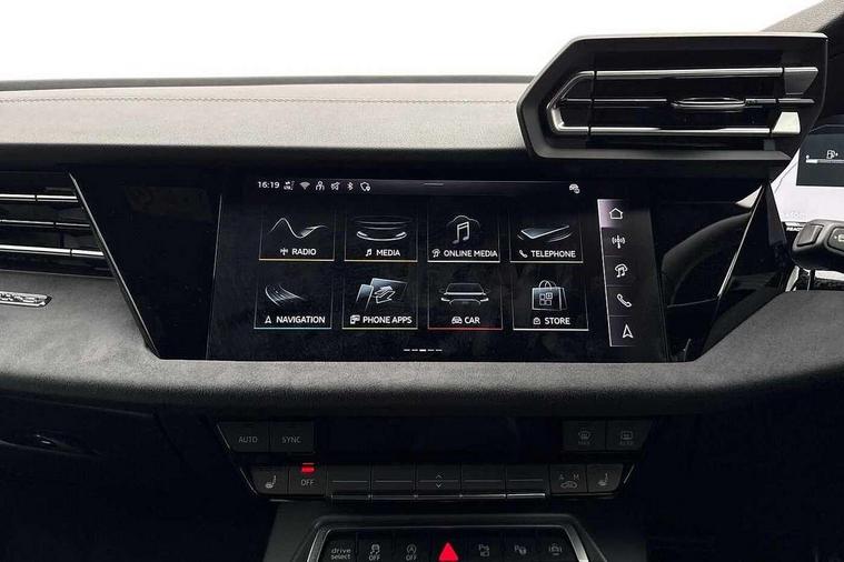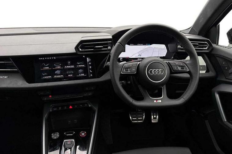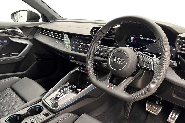 Adaptive cruise control (ACC), Adjustable speed limiter, Audi drive select (Auto, Comfort, Dynamic, Efficiency and Individual), Audi virtual cockpit plus - 12.3" full HD resolution dynamic digital instrument cluster, Automatic start/stop system with recuperation, Bluetooth interface, Camera based traffic sign recognition, Collision avoidance assistant, Driver attention and fatigue detection, e-Call (emergency call), Emergency assist, Intersection assist, Lane departure warning system, MMI Navigation Plus with high resolution 10.1" colour touch screen display, Park Assist with parking system Plus, Progressive steering, Reversing camera, Service indicator, Smartphone interface with app store includes wireless Apple carplay, Android auto and Amazon alexa integration, Trip computer, Voice control system with natural language interaction, quattro permanent all-wheel drive with torque splitter, S sport suspension with spring damper adjustment and lowering by 15mm, Audi Phonebox light with wireless charging, DAB Digital radio, USB ports with charging function in the rear, Anthracite grey Audi rings (front and rear), Audi Beam uses LEDs to project the rhombus S logo onto the ground as you exit your S3, Auto dimming frameless rear view mirror, Black accents front and rear bumpers including air inlets, Black accents in front grille and frame, Black accents in window trims, Electrically adjustable/heated/folding/auto dimming door mirrors with integrated LED indications + kerb view function for passenger side, Exterior model badging, Front and rear side air inlets in grained matt black with dark liquid chrome frame, Front electric windows, Front radiator grill in high gloss dark chrome, Heat insulating glass windscreen, Illuminated door sills with aluminium inserts at the front with S logo, LED 3rd brake light, Light and rain sensors, Privacy glass - dark tinted rear window, rear door and side windows, Rear diffuser and grill in grained matt black with inlay in dark liquid chrome, Rear electric windows, Rear side wing doors, Rear wiper, S grille, S3 front bumper with S specific air intake grilles, S3 roof spoiler, Side sill trim in dark liquid chrome, 12V socket and storage compartment in front centre console, 3 seat bench in 2nd row, 3 spoke flat bottomed leather multifunction sport steering wheel with gear shift paddles, 3-zone deluxe automatic air conditioning, 4 way electrically adjustable lumbar support for driver and front passenger, 40/20/40 split folding rear seat bench, Black cloth headlining, Black front and rear floor mats, Fine Nappa leather upholstery with front sports seats S embossed logo, Front and rear centre armrest in artificial leather with contrasting stitching on armrests and instrument panel, Front and rear headrests, Heated front seats, Height and reach adjustable steering wheel, i-Size child seat mounting on the front passenger side and outer rear seats, i-Size and top tether on the outer rear seats, Manual boot compartment lid, Manually adjustable front seats, Rear centre armrest with cupholder, S badging on the steering wheel, Seat side bolsters, Single front passenger seat, Stainless steel pedals and front footrest in black, Aluminium interior elements pack - A3, Storage package - A3, Technology pack with Matrix LED headlights - A3, 3x3 point rear seat belts, Driver and front passenger airbag with passenger airbag deactivation, Electronic Stabilisation Control (ESC) including ABS, ASR and EDL, First aid kit with warning triangle and 2 safety vests, Front side airbags with head airbags and interaction airbag, Hill hold assist, Pre-sense front with pedestrian and cyclist detection, Seatbelt monitoring, Tyre pressure loss indicator, Anti theft alarm, Anti-theft wheel bolts, Electronically operated child locks, Immobiliser, Black dashboard, Tyre repair kit,