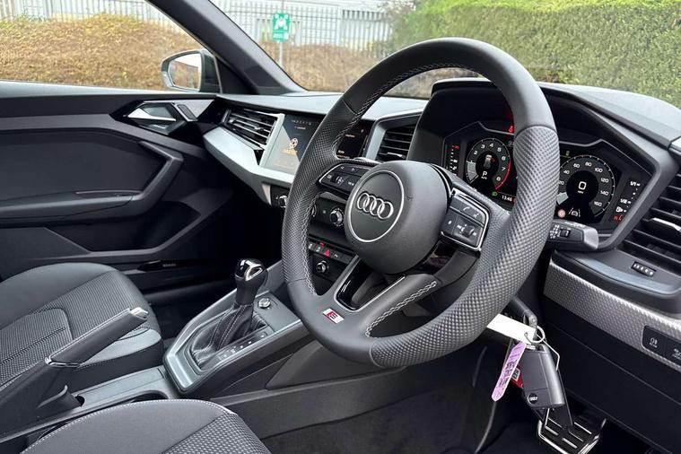 10.25" Digital instrument cluster display classis style instrument dials + speed, odometer, time, outside temperature, telephone menu + fuel level warning, Advanced driver attention and drowsiness monitor, Audi connect emergency call and service, Audi drive select, Audi remote connect and control, Bluetooth interface, Camera based traffic sign recognition, Cruise control, Driver's information system, Electromechanical power steering, Lane departure warning system, Rear parking sensor, Service interval indicator, Smartphone interface, Speed limiter, Start stop system with recuperation, Voice control system, Washer fluid level indicator, Sports suspension, 2 x USB type C connection points, 6 loudspeakers, DAB Digital radio, MMI radio plus with 10.1" colour MMI display screen and MMI touch, Auto dimming rear view mirror, Body coloured door mirrors, Door sill trims with aluminium inlays and S line logo in front, Electric front and rear windows, Electrically adjustable, heated, folding door mirrors with integrated LED side indicator, Front side air inlets in grained matt black and C frame in anthracite black, Headlight cleaning system, Heat insulating glass windscreen and side windows, Heated rear windscreen, High level LED brake light, LED daytime running lights, LED headlights with range control LED rear lights + dynamic rear indicators, Light and rain sensors, Privacy glass, Radiator grille and rear diffuser in matt anthracite black, Radiator protective grille frame in matt aluminium silver, Rear fog lights, Rear side wing doors, Rear wiper, Side front spoiler lips in grained matt black, 12V socket in centre console with two cup holders, 3 rear seats with headrests, 3 seat bench in 2nd row, 3 spoke leather multi-function plus steering wheel features S badging and grips in perforated leather with contrast stitching, 40:60 Split folding rear seat or fully collapsed, Black carpets, Black cloth headlining, Front and rear velour black floor mats with contrast stitching in fine silver, Front head restraints, Front passenger seat, Height and reach adjustable steering wheel, Interior lighting includes roof module, front and rear reading lights and right luggage compartment lighting, ISOFIX child seat mounting for front passenger and outer rear seats including top tether attachment point of outer rear seats, Leather gear knob with aluminium trim, Leather handbrake grip, Manual air conditioning, Manual height adjustable for driver and front passenger seat, Manually adjustable lumbar support in front seats, Stainless steel pedals, Ambient lighting package - A1, Luggage compartment pack - A1, S line exterior styling pack - A1 Sportback, 3x3 point rear seatbelts, Audi pre-sense front with pedestrain and cyclist recognition, Brake assist function, Driver and front passenger airbag with front side and head airbags, Electronic Stability Control including ABS, EBD, ASR and EDL, Front passenger airbag deactivation switch, Hill hold assist, Manual rear child locks, Seatbelt height adjustment for front seats, Seatbelt monitoring, Tyre pressure loss indicator, Warning triangle and first aid kit, Anti theft alarm, Anti theft wheel bolts, Immobiliser, Remote control key with safelock, Aluminium trim for control switches, air vents and digital instrument cluster, Black dashboard, Silver grey inlays polygon structure in diamond paint finish, Structured grey accent surfaces insert of air vents, interior door handle recesses and centre console in quartz paint finish,