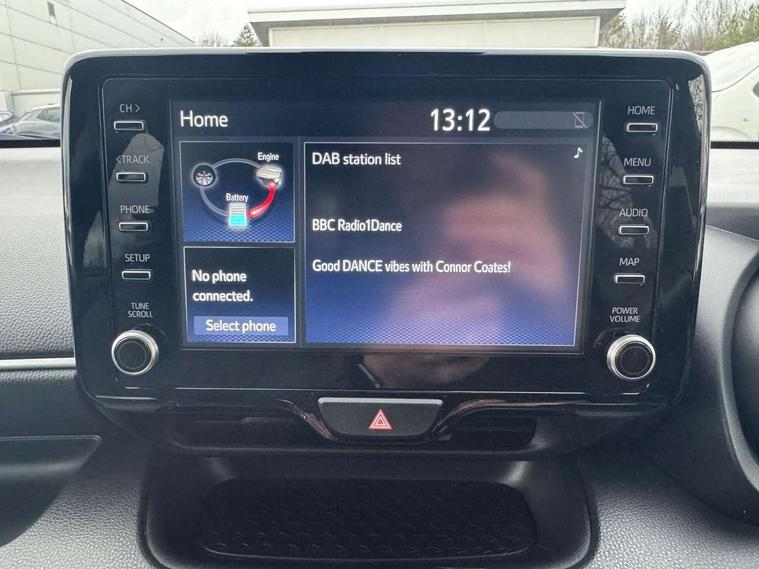 7" Digital Combimeter, Adaptive cruise control, Adjustable speed limit with speed warning, Bluetooth connectivity, Colour binocular inspired displays with digital speedometer, E-call, Electric power steering, Hybrid energy display, Lane trace assist, Multi information display switches on steering wheel, Pre-collision system (PCS), Reversing camera, Smartphone integration with Apple CarPlay and Android auto, Tailgate, Voice recognition, Vehicle Stability Control (VSC), 4 speakers, 9" Multimedia touch display, Toyota Touch 3 system with DAB radio, USB connection, Acoustic windscreen glass, Auto high beam assist, Auto windscreen wipers, Automatic headlights, Body coloured door mirrors, Electric adjustable heated door mirrors, Follow me home headlights, Front auto power windows with anti jam protection, LED daytime running lights, LED front fog lights, LED front light guide, LED Headlights, LED High mounted stop lamp, LED Indicators, LED rear light guide, Manual headlight levelling, Painted chequered front grille, Rain sensor, Rear auto power windows with anti jam protection, Rear privacy glass, Rear roof spoiler, Rear side wing doors, Rear wiper, Shark fin antenna, Turning signal integrated indicators in door mirrors, Variable front intermittent wipers, 3 adjustable rear headrests, 3 seat bench in 2nd row, 3 spoke leather steering wheel, 60/40 split folding rear seat, Active headrests, Adjustable boot height, Auto air conditioning, Coat hooks in rear grab handles, Cup holders (2 front & door), Data Communication Module (DCM) connected services, Fabric upholstery, Front armrest, Glovebox, Grey roof lining, Height adjustable driver's seat, Isofix seat fixing, Leather gearshift, Pollen filter, Shopping bag hooks, Single front passenger seat, Tilt/telescopic steering column, 3 point seatbelts on all rear seats, ABS+EBD+Brake assist, Electronic parking brake, Emergency brake light system (EBS), Front passenger airbag on/off switch, Front seatbelt reminder, Hill start assist control (HAC), Rear child proof door locks, Rear seat belt reminder, Supplemental Restraint System (SRS) 8 airbags: Driver & passenger's airbags, dual side curtain airbags, side impact airbags, front centre airbag, Toyota Safety Sense 3 with over the air updates, Tyre pressure warning system, 2x Master key, Alarm/immobiliser, Remote powered central double locking doors, Soft touch instrument panel, Space saver spare wheel,