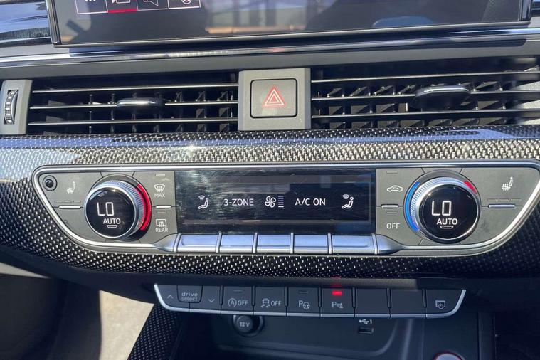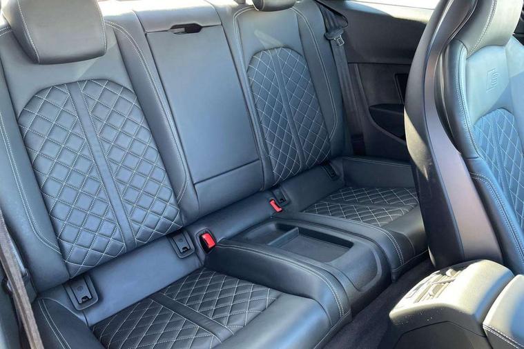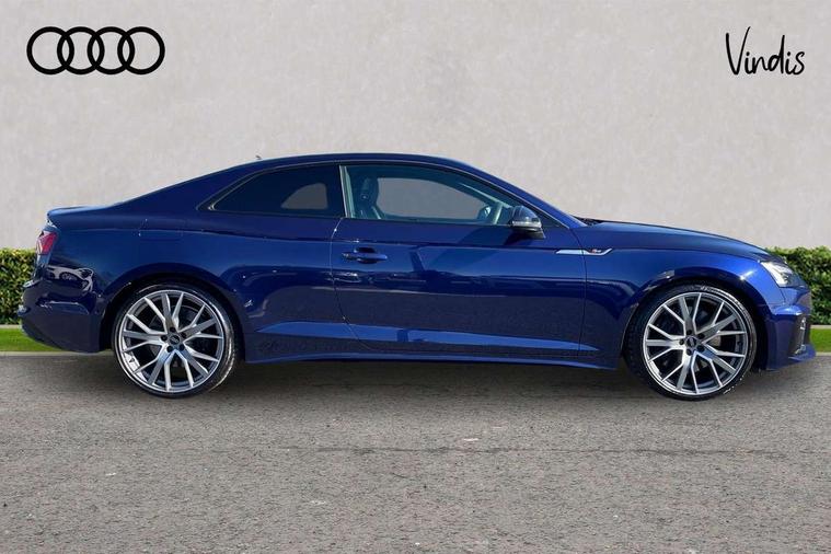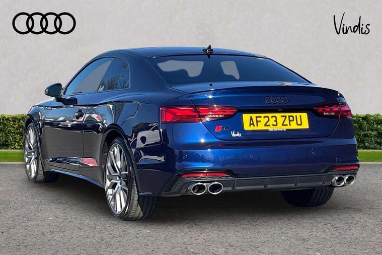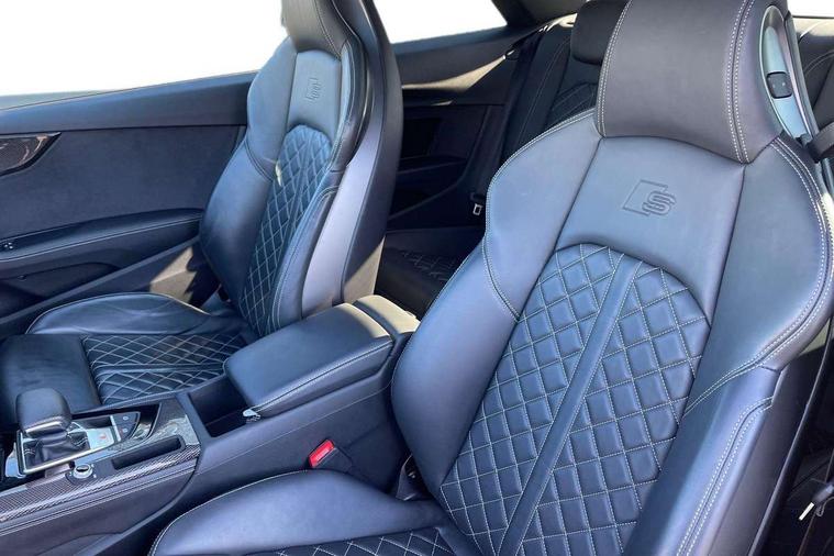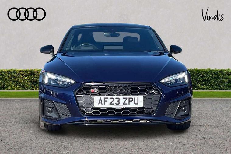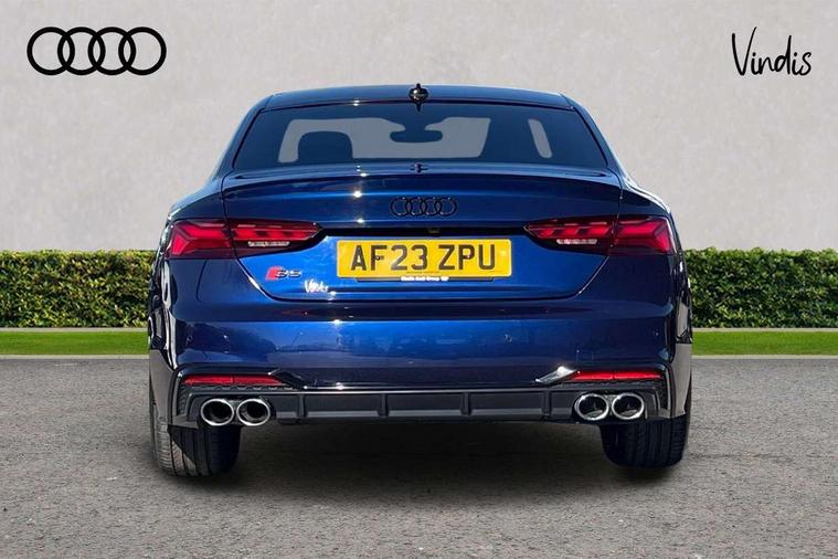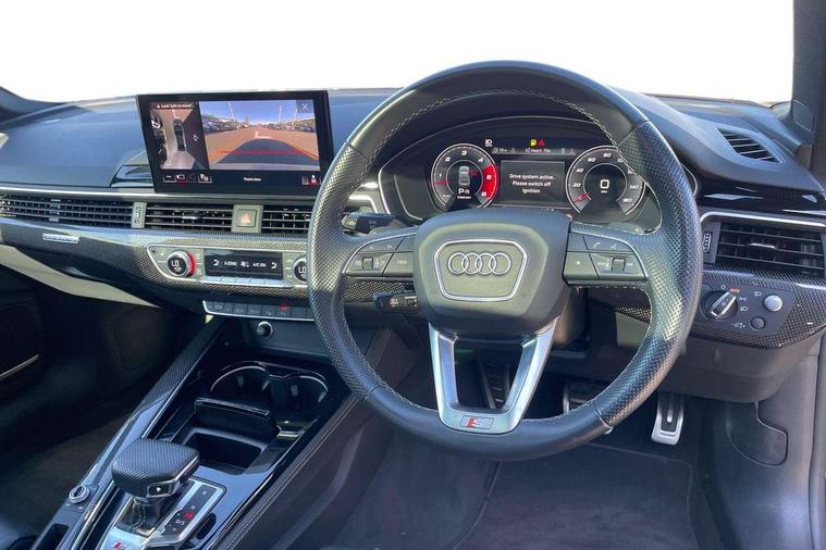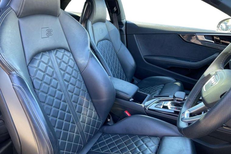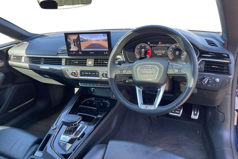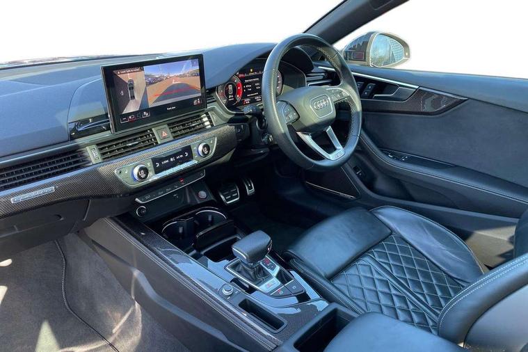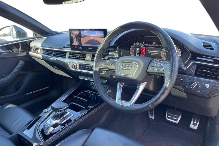 360 camera, Advanced key with Audi hands free boot opening system, Audi connect safety and service (e-call), Audi connect with Amazon Alexa Integration, Audi drive select (Auto, Comfort, Dynamic, Efficiency and Individual), Audi phone box light with wireless charging, Audi smartphone interface, Audi virtual cockpit - 12.3" full colour digital instrument cluster, vehicle/engine speed, Radio/media information+Driver assistance systems, Automatic start-stop system with coasting functionality and efficiency programme, Bluetooth interface, Electric boot lid release, Electro-mechanical power steering, Email, calendar and text messages displayed via MMI, Head up Display, MMI nav+ with MMI touch - 10.1" high resolution MMI display, touch sensitive, 3D map, route/country info, dynamic route guide, personal route assist, Park assist system, S instrument dials, Service interval indicator, Voice control system, 58 Litre fuel tank, Adaptive S sport suspension with damping control, Audi sports differential, Diesel particulate filter, Bang and Olufsen 3D sound system, CD player, DAB digital radio reception, Two additional USB ports for rear passenger in rear centre console, Two SDXC card slots, Audi Beam uses LEDs to project Vorsprung logo, Auto dimming rear view mirror, Badges on front wing, Body colour door handles, Body colour front spoiler lip, Body colour side sill trim, Door mirrors folding with auto-dimming and memory function, Electric adjustable heated door mirrors, Electric front windows, Front and rear bumpers with side skirts, Front fog lights, Headlight cleaning system, Kerb-view function for passenger side, LED daytime running lights, LED side indicator lights integrated into door mirrors, LED third brake light, Matrix LED headlights with Audi laser light, dynamic light sequencing and dynamic indicator, Panoramic glass sunroof, Privacy glass, Rain and light sensors, Rear boot, Rear side wing doors, S radiator grille in twilight grey matt with dual struts in aluminium and S5 logo, S rear diffuser in twilight grey matt and honeycomb grille in black, S rear spoiler, S specific dual branch chrome tailpipes with twin oval pipes on left and right, S specific side air inlets in titan black with chrome inlays in unique S design, Variable front intermittent wipers, Windscreen with acoustic glazing, 2 seat bench in 2nd row, 3 spoke heated high multi-function leather steering wheel, 40/20/40 split folding 2 seater rear seat bench with rear centre armrest, Adjustable steering column, Black cloth headlining, Black perforated leather gearknob, Contrast stitching on seats, steering wheel and gear lever gaiter, Deluxe 3 zone electronic climate control, Electrically adjustable front seats with memory function for driver's side, Fine nappa leather upholstery with S embossed logo + super sports seats, Front centre armrest, Front head restraints, Front/rear floor mats, Gear lever with diamond S badge, Heated front and outer rear seats, Illuminated door sill trim with S logo, ISOFIX child seat mounting and top tether, Key with S logo, Luggage compartment mat, Pneumatically adjustable lumbar support with massage function, Rear headrests, Single front passenger seat, Stainless steel pedals, Sunvisors with vanity mirrors, Tool kit, Black styling pack - S5 Coupe/Sportback, Driver assistance tour pack - A5, Extended leather pack - A5, Extended LED Interior Pack - A5/S5, 2 x 3-point rear seat belts, 6 airbags - Driver, front passenger, curtain and side airbags, Brake calipers painted black with S logo at the front, Electromechanical parking brake, Electronic Stabilisation Control (ESC) including ABS, ASR and EDL, Front passenger airbag deactivation, Height adjustable front seatbelts, Hill hold assist, Multi collision brake assist, Pop-up bonnet for pedestrian protection, Pre sense city, S model enhanced braking system, Seatbelt monitoring, Tyre pressure warning, Variable restraint system, Warning triangle and first aid kit, Anti theft alarm system, Anti theft wheel bolts, Immobiliser, Keyless Go, Remote central locking, 20" 5 V spoke star design alloy wheels in matt grey look gloss turned finish, Tyre repair kit,
