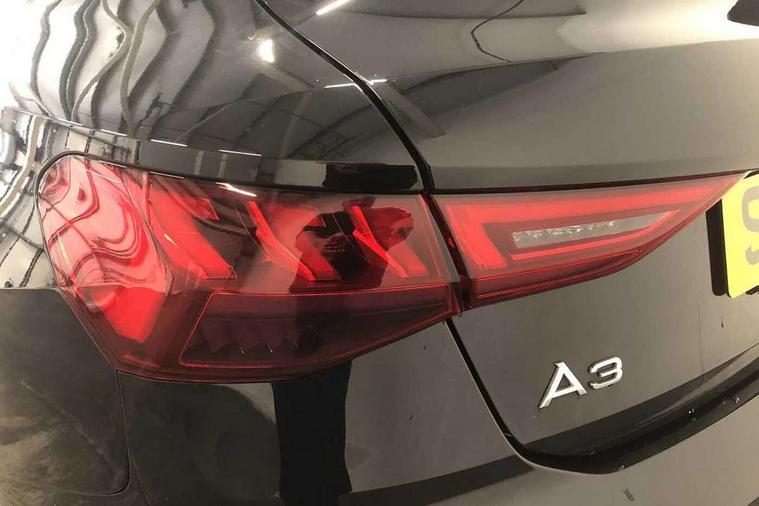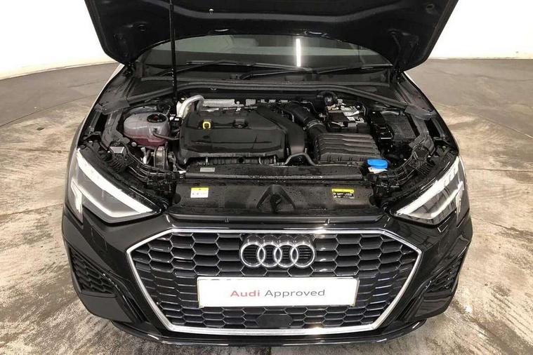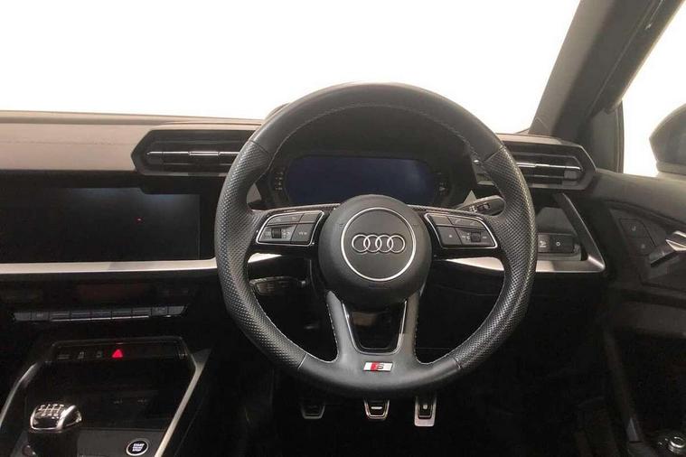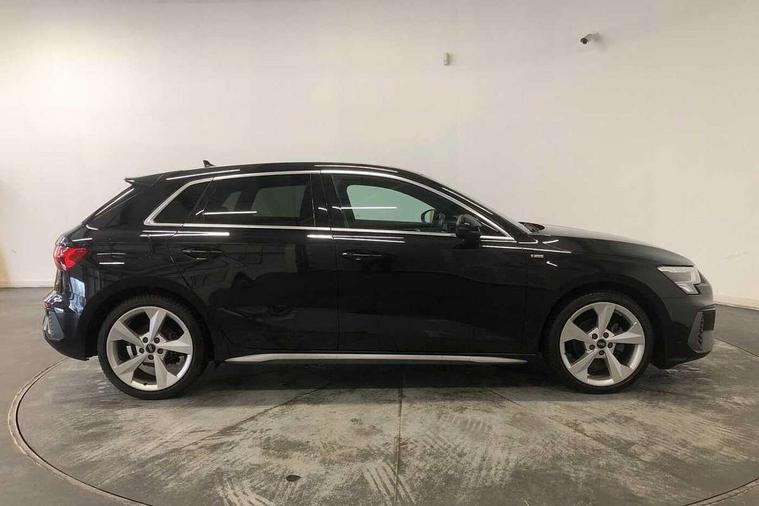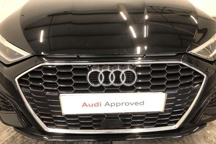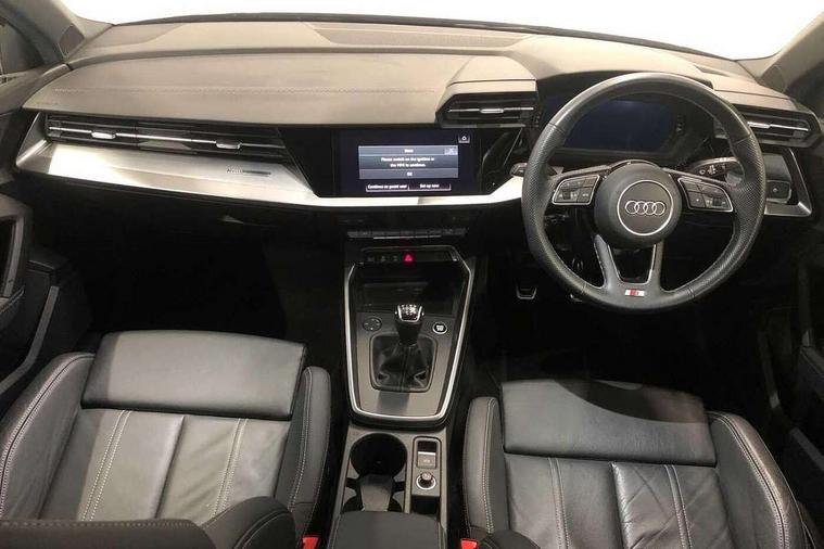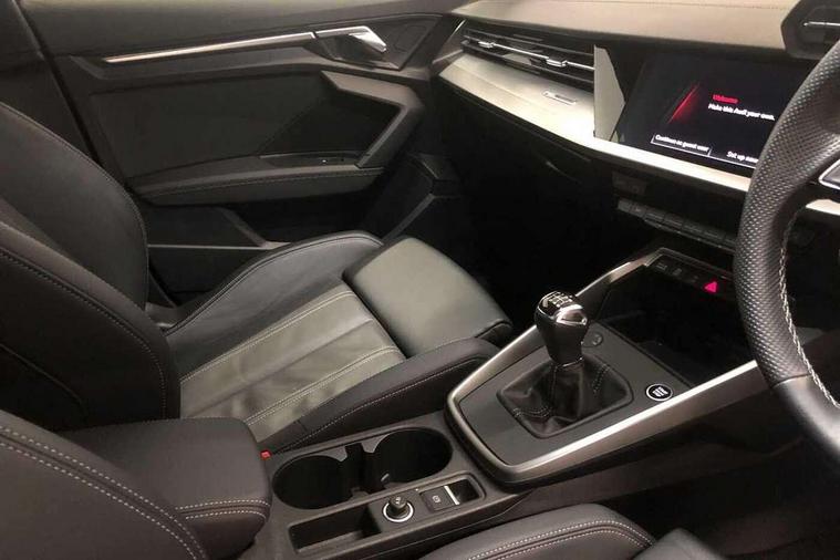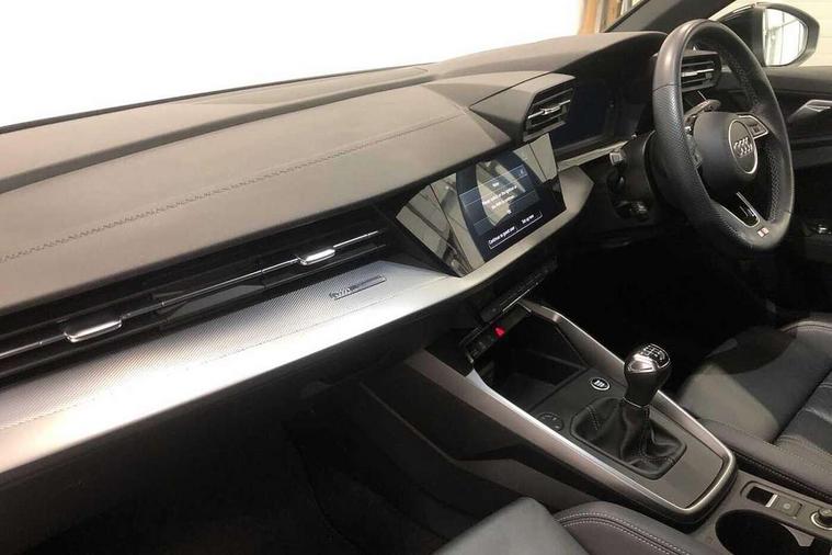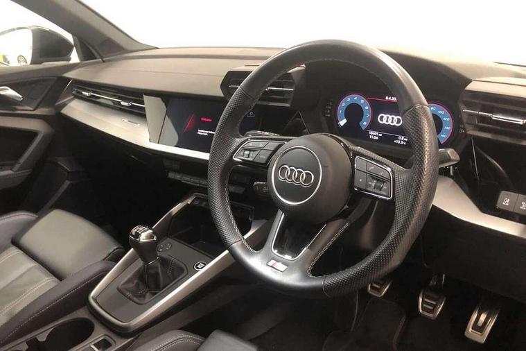 Audi drive select (Auto, Comfort, Dynamic, Efficiency and Individual), Audi smartphone interface, Audi Virtual Cockpit - 10.25" digital and colour instrument cluster, Automatic start/stop system with recuperation, Bluetooth interface, Collision avoidance assistant, Cruise control, e-Call (emergency call), Electromechanical power speed sensitive steering, Lane departure warning system, MMI Navigation Plus with high resolution 10.1" colour touch screen display, Rear parking sensors, Service indicator, Trip computer, Voice control system with natural language interaction, 2xUSB-C connection with data and charging functions, 6 passive loudspeakers, DAB Digital radio, 3rd brake light, Acoustic glass windscreen, Aluminium window trim, Auto dimming frameless rear view mirror, Electrically adjustable/heated/folding/auto dimming door mirrors with integrated LED indications + kerb view function for passenger side, Front electric windows, Illuminated aluminium inserts front door sills with S logo, LED daytime running lights, LED headlights with LED rear lights and dynamic rear indicators, Light and rain sensors, Privacy glass - dark tinted rear window, rear door and side windows, Rear electric windows, Rear side air outlets in grained matt black, Rear side wing doors, Rear wiper, S line bumpers, S roof spoiler, 12V socket and storage compartment in front centre console, 3 seat bench in 2nd row, 40/20/40 split folding rear seat bench with cupholder, Black cloth headlining, Dual zone electronic climate control, Front and rear centre armrest in leather, Front and rear headrests, Front/rear floor mats, Height and reach adjustable steering wheel, Illuminated vanity mirror, Interior lighting - glove compartment light and right hand side, Luggage compartment floor covering, Manual boot compartment lid, Manually adjustable front seats, Seat side bolsters, Single front passenger seat, Stainless steel pedals and front footrest in black, Twin leather upholstery with front sports seats S embossed logo, Aluminium interior elements pack - A3 Sportback, S line styling pack - A3 Sportback, 3x3 point rear seat belts, Audi pre sense front, Driver and front passenger airbag with passenger airbag deactivation, Electronic Stabilisation Control (ESC) including ABS, ASR and EDL, First aid kit with warning triangle and 2 safety vests, Front side airbags with head airbags and interaction airbag, Pre-sense front with pedestrian and cyclist detection, Seatbelt monitoring, Tyre pressure loss indicator, Anti theft alarm, Anti-theft wheel bolts, Immobiliser, Manual child locks, Remote control central locking, Accent surfaces in the dashboard and centre console in platinum grey silk effect paint finish, Dark spectrum aluminium inlays,