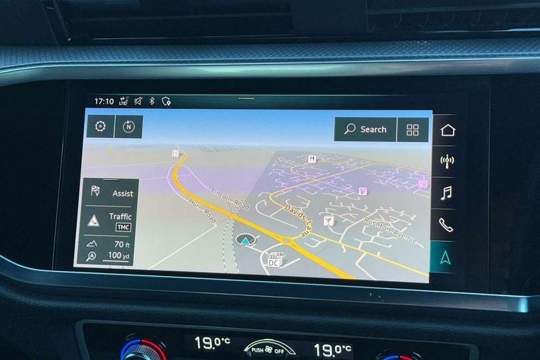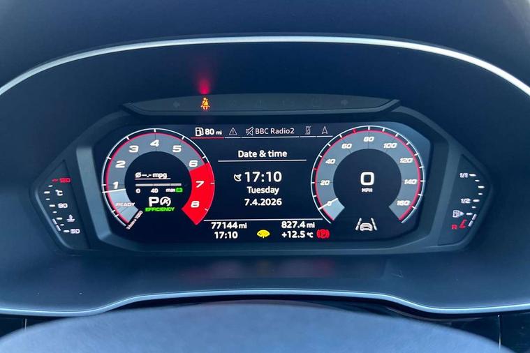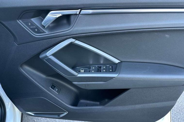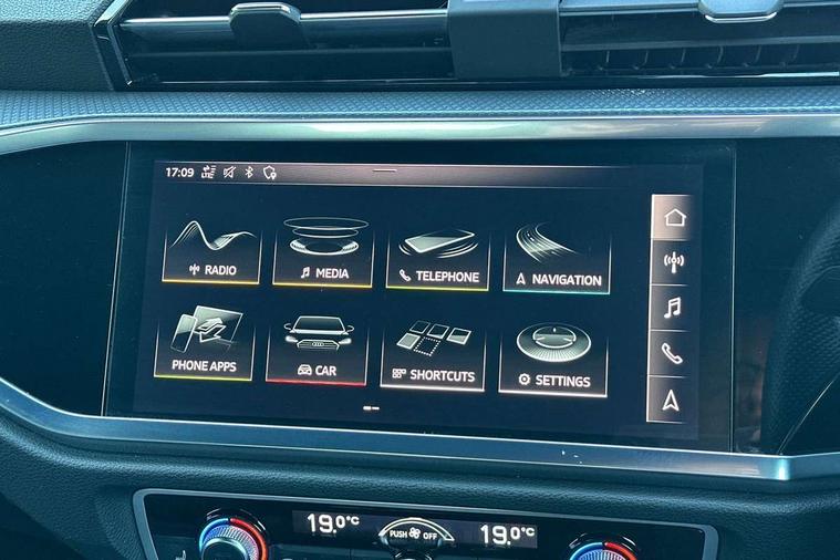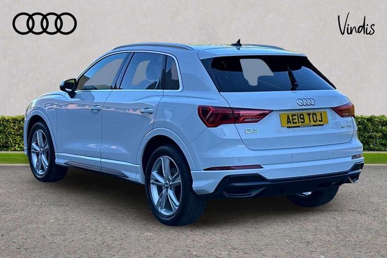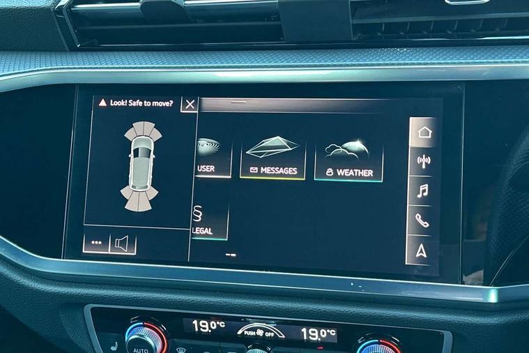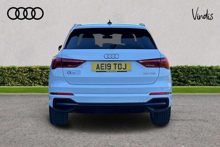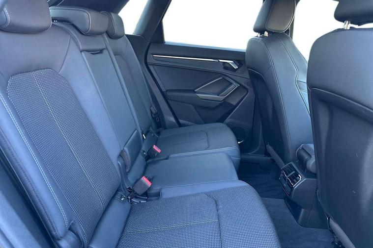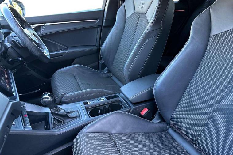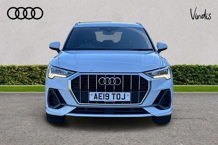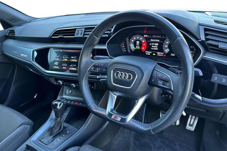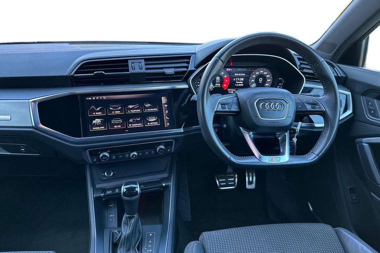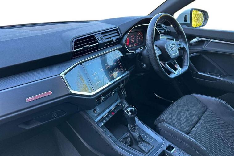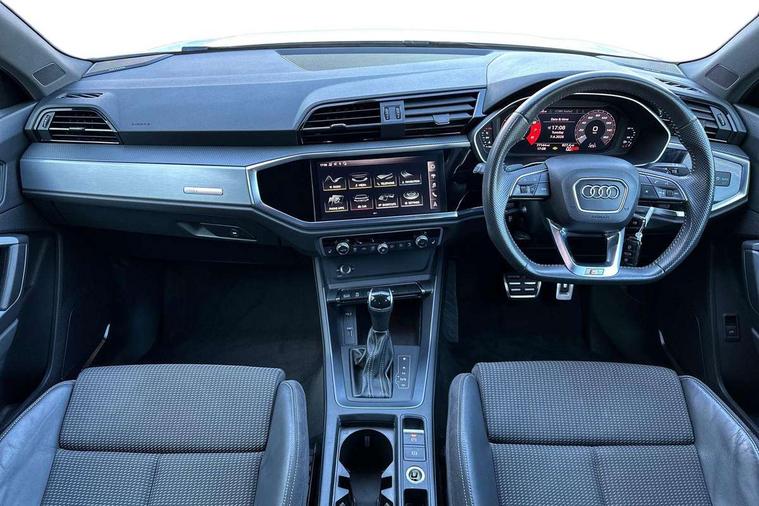 Audi connect safety and service (e-call), Audi drive select, Audi lane departure warning, Audi side assist, Audi smartphone interface, Audi Virtual Cockpit - 10.25" display, Bluetooth interface, MMI navigation plus with MMI touch, Power opening/closing tailgate, Progressive steering, Service interval indicator, Stop/start system, Voice control system, DAB digital radio module, Acoustic windscreen, Aluminium roof rails, Aluminium window trim, Auto dimming rear view mirror, Body colour door mirrors, Body coloured bumpers, Diffuser in matt Platinum grey, Electrically adjustable and heated door mirrors with integrated LED side indicators, Front and rear electric windows, Front fog lights, Front side air inlets in matt platinum grey, Front spoiler blade in matt platinum grey, Grille vertical bars in aluminium silver/Matt, High gloss black finish B and C pillars, Privacy glass, Rain and light sensors, Rear diffuser strip in selenite silver, S Line badge on wings, S Line front and rear bumpers, Side skirt insert in matt Platinium grey, Titanium black radiator grille, 12V socket in rear centre console, 40:20:40 split folding rear bench seat, Adjustable rear seat bench/backrest with centre armrest and cupholder, Aluminium door sill trims, Black cloth headlining, Dual zone climate control, Front and rear black floor mats with contrast stitching in rock grey, Front and rear headrests, Front centre armrest with storage compartment and angle adjustment, Illuminated door sill trims with S logo, ISOFIX child seat mounting and Top Tether with front passenger airbag deactivation, Perforated leather gearknob, Stainless steel luggage compartment sill finisher, Stainless steel pedals, Non smoking pack - Q3, 3x3 point rear seatbelts, 6 airbags - Driver, front passenger, curtain and side windows, Audi pre-sense front with pedestrain and cyclist recognition, Electronic stabilisation control including ABS, ASR and EDL, Hill hold assist, Pre sense basic, Seatbelt monitoring, Tyre pressure warning, Warning triangle and first aid kit, Anti theft alarm, Anti theft wheel bolts, Remote central locking, Dark matt brushed aluminium inlay, MMI touch colour display in gloss black with aluminium surround,