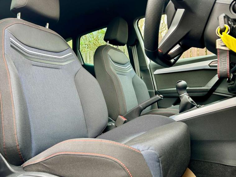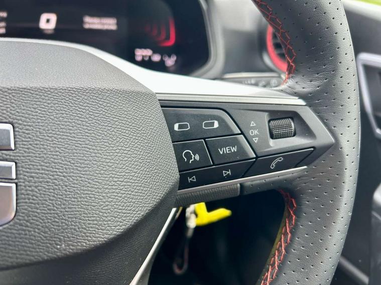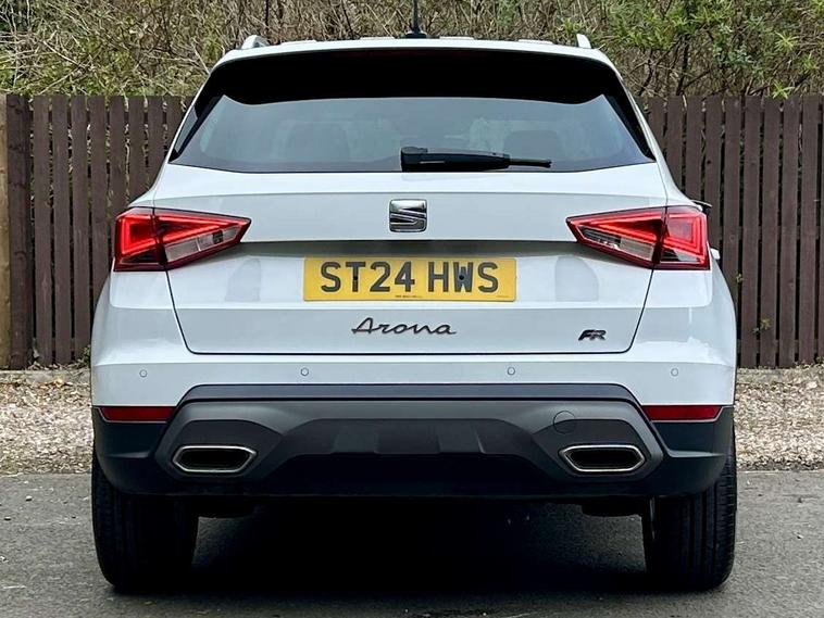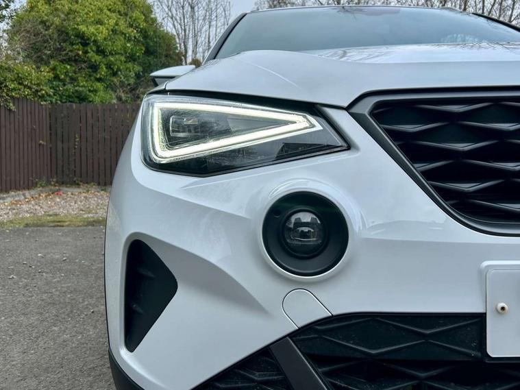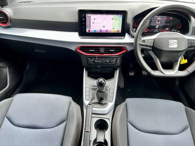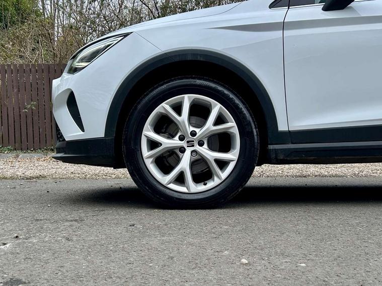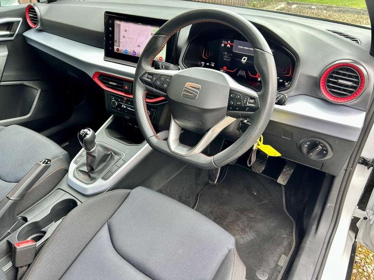 'Lights On' Reminder warning buzzer, 8" Digital cockpit, Digital clock, E-call, Electric speed sensitive power steering, Full Link Smartphone Integration with Mirror Link, Apple Car Play, Google Android Auto with USB Type C cable for Apple and Android compatibility, Lane keeping system, Low fuel warning light, Outside temperature display, Rear parking sensor, RPM counter, Seat connect with safety, service, remote and online, SEAT Drive profile - Four different models normal-sport-eco-individual, steering response, throttle response, Trip computer, Wireless phone charger, 9.2" colour touchscreen with navigation system, voice control and USB port (type c), Bluetooth interface for hands free and audio streaming, DAB digital radio and AM/FM radio, Steering wheel mounted audio controls, Anti theft roof antenna, Auto dimming interior rear view mirror, Automatic activation of hazard warning lights, Body coloured bumpers, Body coloured door handle inserts, Chrome roof rails and window surrounds, Dark tinted rear windows, Electric front/rear windows, Electrically adjustable, heated and folding door mirrors, Front fog lights with cornering function and rear fog light, FULL LED automatic headlights with dynamic headlight range control, coming and leaving home, LED daytime running lights, LED rear tail lights and licence plate lights, Protective side mouldings, Rain sensing wipers, Rear side wing doors, Rear spoiler, Rear window wash/wipe, Roof colour door mirrors, Third brake light, Twin exhaust pipe styling hidden exhaust pipe, Visible VIN plate, Windshield wiper with intermittent control and potentiometer, 2 cupholders, 3 seat bench in 2nd row, 60/40 split folding rear seat, Aircare filter, Black interior roof, Cloth upholstery, Double boot floor, Driver sunvisor with covered mirror + card holder, Dual zone climate control, Front courtesy light with front reading lights, Front sport seats, Gear shift indicator, Height adjustable front seats, Height/reach adjustable steering column, Illuminated boot, Instrument lighting with brightness control, Interior ambient lighting, Interior light in footwell, central console and door panel, ISOFIX points in outer rear seats with top tether anchorage points, Passenger sunvisor with vanity mirror, Perforated flat bottomed leather steering wheel/gear knob/handbrake with red stitching and FR logo, Single front passenger seat, Two front and three rear height adjustable headrests, Interior chrome pack - Arona, 3 point seatbelts on all rear seats, ABS, Active front headrests, Child locks on rear doors, Driver and front passenger airbags with front passenger airbag de activation, front side and curtain airbags, Electronic stability control, Emergency Brake Assist (EBA) and front assist, Front and rear seatbelt reminder, Hill hold control, Multi-Collision braking, Tiredness recognition system, Traction control, Tyre pressure monitoring system, Alarm with back-up horn, Electronic engine immobiliser, Locking wheel bolts, Remote central locking + deadlocks, Tow away protection, Titan black dashboard, 17" Dynamic alloy wheels,