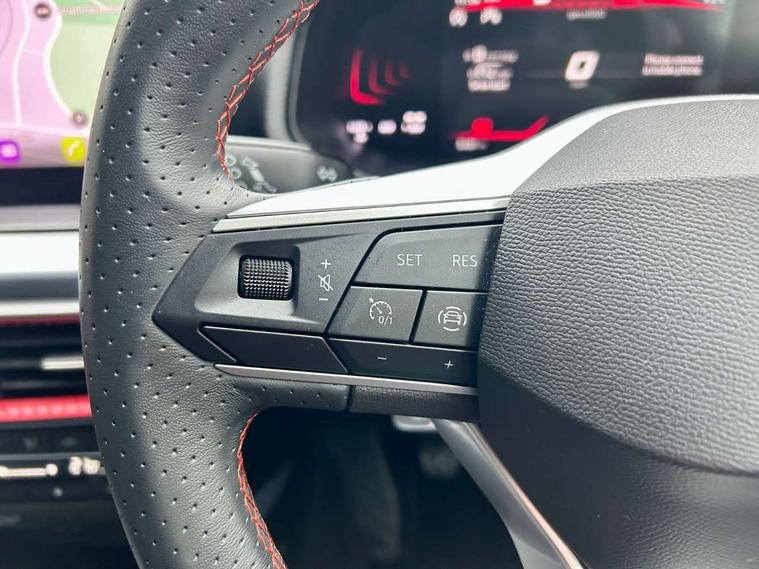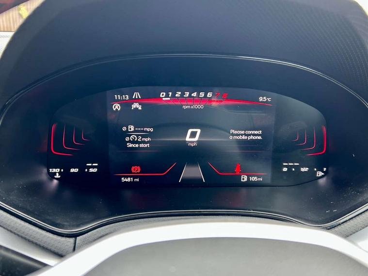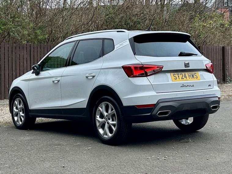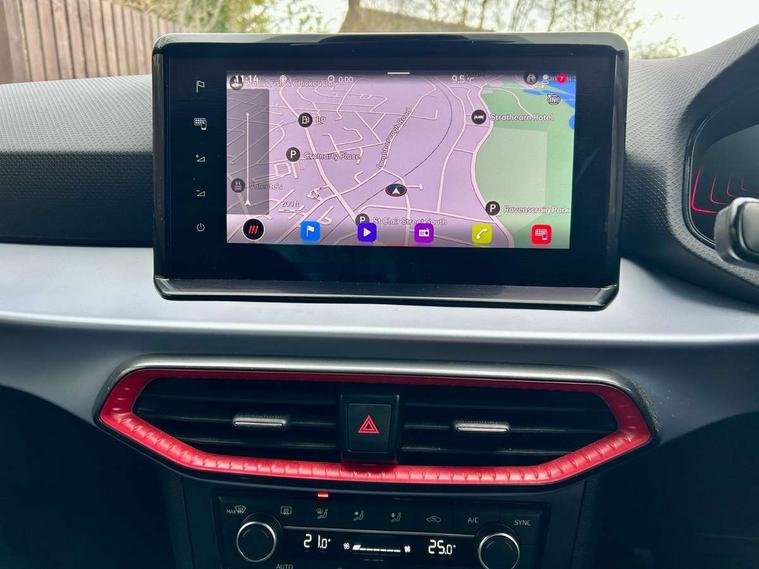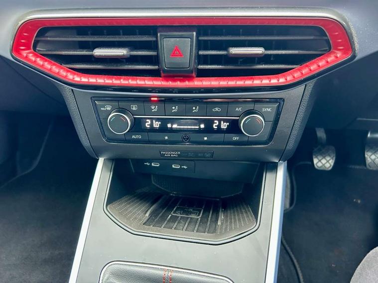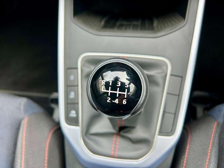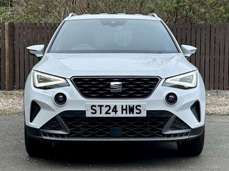 'Lights On' Reminder warning buzzer, 8" Digital cockpit, Digital clock, E-call, Electric speed sensitive power steering, Full Link Smartphone Integration with Mirror Link, Apple Car Play, Google Android Auto with USB Type C cable for Apple and Android compatibility, Lane keeping system, Low fuel warning light, Outside temperature display, Rear parking sensor, RPM counter, Seat connect with safety, service, remote and online, SEAT Drive profile - Four different models normal-sport-eco-individual, steering response, throttle response, Trip computer, Wireless phone charger, 9.2" colour touchscreen with navigation system, voice control and USB port (type c), Bluetooth interface for hands free and audio streaming, DAB digital radio and AM/FM radio, Steering wheel mounted audio controls, Anti theft roof antenna, Auto dimming interior rear view mirror, Automatic activation of hazard warning lights, Body coloured bumpers, Body coloured door handle inserts, Chrome roof rails and window surrounds, Dark tinted rear windows, Electric front/rear windows, Electrically adjustable, heated and folding door mirrors, Front fog lights with cornering function and rear fog light, FULL LED automatic headlights with dynamic headlight range control, coming and leaving home, LED daytime running lights, LED rear tail lights and licence plate lights, Protective side mouldings, Rain sensing wipers, Rear side wing doors, Rear spoiler, Rear window wash/wipe, Roof colour door mirrors, Third brake light, Twin exhaust pipe styling hidden exhaust pipe, Visible VIN plate, Windshield wiper with intermittent control and potentiometer, 2 cupholders, 3 seat bench in 2nd row, 60/40 split folding rear seat, Aircare filter, Black interior roof, Cloth upholstery, Double boot floor, Driver sunvisor with covered mirror + card holder, Dual zone climate control, Front courtesy light with front reading lights, Front sport seats, Gear shift indicator, Height adjustable front seats, Height/reach adjustable steering column, Illuminated boot, Instrument lighting with brightness control, Interior ambient lighting, Interior light in footwell, central console and door panel, ISOFIX points in outer rear seats with top tether anchorage points, Passenger sunvisor with vanity mirror, Perforated flat bottomed leather steering wheel/gear knob/handbrake with red stitching and FR logo, Single front passenger seat, Two front and three rear height adjustable headrests, Interior chrome pack - Arona, 3 point seatbelts on all rear seats, ABS, Active front headrests, Child locks on rear doors, Driver and front passenger airbags with front passenger airbag de activation, front side and curtain airbags, Electronic stability control, Emergency Brake Assist (EBA) and front assist, Front and rear seatbelt reminder, Hill hold control, Multi-Collision braking, Tiredness recognition system, Traction control, Tyre pressure monitoring system, Alarm with back-up horn, Electronic engine immobiliser, Locking wheel bolts, Remote central locking + deadlocks, Tow away protection, Titan black dashboard, 17" Dynamic alloy wheels,