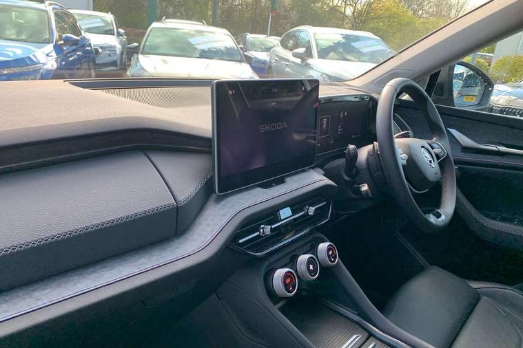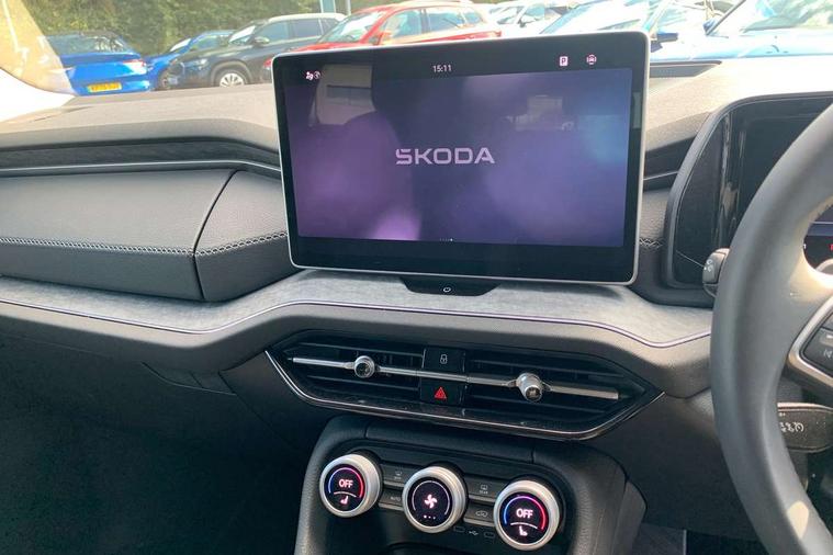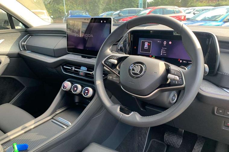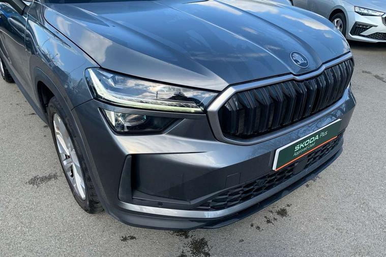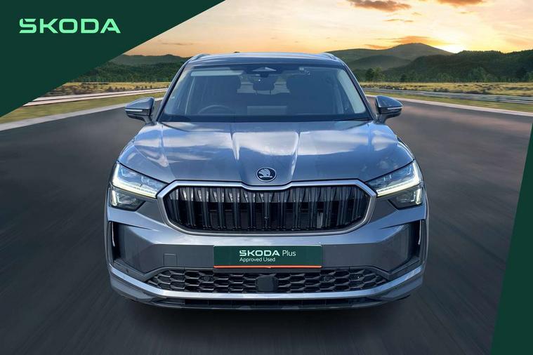 13" satellite navigation touchscreen display, Blind spot detection with door exit warning, Bluetooth system, ChatGPT functionality, Drive mode selector, Driver alert with fatigue sensor, Driver drowsiness alert system, Dry display cleaner, e call+, Front cross traffic assist, Lane assist, PAS, Rear traffic assist, Tailgate unlocking from outside, Traffic sign recognition, USB C Port x 2 in front centre console, Virtual Cockpit - 10.25" digital display, Voice control system, Wireless charging for two smartphones (15W) with cooling function, Wireless SmartLink for Apple CarPlay and Android Auto, Stop/start function, 2x USB-C in the rear, DAB Digital radio, Aero front windscreen wipers with intermittent function, Auto dimming rear view mirror, AWL (all weather lighting) and all weather light with cornering function, Black wheel arch surrounds, Body colour bumpers, Body colour door mirrors and handles, Cornering light and poor weather light, Electric folding /adjustable/separted heated/folding door mirrors, auto dimming with boarding sports and memory function, Electric front and rear windows, Exterior black decorative trims, Heat insulating glass in windshield, Heated rear window, Ice scraper in fuel tank cap, Invisible tailpipe, LED daytime running lights, LED rear fog light, LED third brake light in rear spoiler, Light assistant with automatic headlight control and coming home feature, Logo projection in door mirrors, Privacy glass, Rear side wing doors, Rear spoiler, Rear window wiper, Red decorative strip between rear LED lights, Safety reflectors on front and rear doors, Window control switches with black trim, Windscreen wipers with rain sensor, Without engine designation, 1.5l bottle holder points in all door, 12V socket in boot, 1x centre rear reading light, 2 seat bench in 3rd row, 3 configurable smart dials with 32mm coloured display, 3 seat bench in 2nd row, 4 foldable roof handles with rear coat hooks, Ambient interior lighting - Dashboard, front-door stowage compartments, front and rear door panels and footwell lighting, Automatic gear selector on steering wheel, Chrome interior door handles, Driver/front passenger reading lights, Fabric headlining, Fixed bench 40:60:40 split folding backrests, Front and rear floor mats, Front centre armrest with jumbo box storage compartment, cup holder and 12V socket, Front courtesy lights, Height adjustable front headrests, Isofix child seat fittings in outer middle row rear seats and front passenger with top tether, Manually adjustable steering column, Pollen filter, Rear centre armrest with cupholders, Rear seat boot backrest release, Retractable luggage compartment cover, Single front passenger seat, Sliding trunk cover, Small Bags on the inner sides of the front backrests, Storage pocket including mobile phone pockets on the backs of the front seats, Sunvisors with illuminated vanity mirrors, Three rear height adjustable headrests, Ticket holder on A Pillar, Tri zone climate control, Umbrella in door panel x1 made from sustainable materials, Upper and lower glovebox with card holder and coin compartment, USB C port by rear view mirror for charging only (15W), Exterior styling pack - Kodiaq, Auto door release and activation of warning lights in the event of an accident, Driver and front passenger airbag with knee airbag and front passenger airbag deactivation, Electric child locks, Electronic parking brake, ESC (incl. ABS+EMD+MSR+ASR+EDL+HBA+DSR+RBS+ESBS+MCB+TSA+XDS), Front assist with braking reaction to vehicles, pedestrians and cyclists, Front disc brakes, Fuel cut off safety device, Height adjustable front 3 point seatbelts + pretensioners, Hill hold control, Junction assist with automatic emergency braking, Rear disc brakes, Safety vest holder in door, Seat belt reminder for all seats, Three point rear seat belts, Two tone horn, Tyre pressure monitor, Anti-theft wheel bolts, Immobiliser, Remote central locking with 2 keys, Breakdown kit,