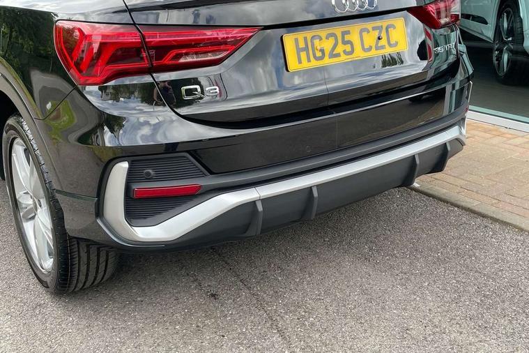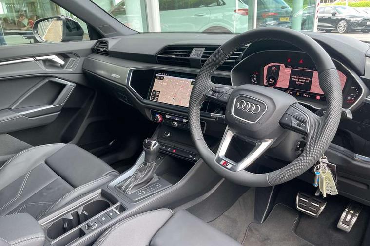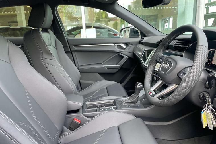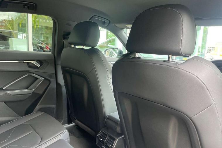 Audi connect safety and service, Audi drive select, Audi lane departure warning, Audi Virtual Cockpit - 10.25" display, Bluetooth interface, Camera based traffic sign recognition, Distraction and Fatigue warning, Legal emergency call, MMI Navigation Plus with high resolution 10.1 inch touchscreen colour display, Power operated tailgate, Progressive steering, Service interval indicator, Smartphone interface includes wireless Apple carplay/Android Auto, Start stop system with recuperation, Voice control system with natural language interaction, Sports suspension, 2 USB-C ports with charge and data functions, 6 passive loudspeakers, DAB digital radio module, Acoustic windscreen, Aluminium window trim, Auto dimming door mirrors, Auto dimming frameless rear view mirror, Diffuser grille in grained matt black, Diffuser trim in selenite silver, Electrically folding, adjustable and heated door mirrors with integrated LED side indicators and kerb view function for passenger side, Front and rear electric windows, Front fog lights, Front side air inlets in selenite silver, Front underbody protection in manhattan grey paint finish, Grille surround in aluminium silver matt, High gloss black finish B and C pillars, LED Dynamic rear indicators, LED headlights with LED daytime running lights, LED rear lights, LED third brake light, Privacy glass dark tinted rear and rear-side windows (from B-pillar backwards), Radiator grille in anthracite black with inlay in matt aluminium silver, Rain and light sensors, Rear side wing doors, Rear underbody protection in matt black, Rear wiper, S line badges on front wings, S line front and rear bumpers and side skirts in contrasting Manhattan grey paint finish, Side skirt insert in matt Platinium grey, Variable front intermittent wipers, 12V socket in rear centre console, 3 seat bench in 2nd row, 3 spoke leather multifunction steering wheel features S badging and grips in perforated leather with contrast stitching, 40:20:40 folding with manual adjustment for 60:40 forwards/backwards position and backrest angle, Adjustable rear seat bench/backrest with centre armrest and cupholder, Black cloth headlining, Dual zone electronic climate control, Electric lumbar support, Front and rear black floor mats with contrast stitching, Front and rear headrests, Front centre armrest, Height and reach adjustable steering wheel, Illuminated door sill trims with S logo, ISOFIX child seat mounting for front passenger with airbag deactivation and outer rear seat including top tether attachment point for outer rear seats, Luggage compartment sill protection in stainless steel, Manual front seats with height adjustment, Perforated leather gearknob, Single front passenger seat, Stainless steel pedals, Twin leather upholstery with front sport seats + S embossing, Non smoking pack - Q3, 3x3 point rear seatbelts, 6 airbags - Driver, front passenger, curtain and side windows, Audi pre-sense front with pedestrain and cyclist recognition, Electrically operated child locks on rear doors, Electromechanical parking brake, Electronic stabilisation control including ABS, ASR and EDL, Front seatbelt reminder, Hill descent control, Hill hold assist, Pre sense basic, Seatbelt monitoring, Tyre pressure warning, Warning triangle and first aid kit, Anti theft wheel bolts, Immobiliser, Remote central locking, Thatcham approved category 1 anti theft alarm, Aluminium look interior elements, Dark matt brushed aluminium inlay, Detail dashboard around MMI touch colour display in glass look, black with surround in aluminium look, Leatherette door armrest,
