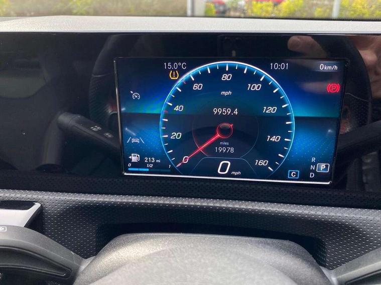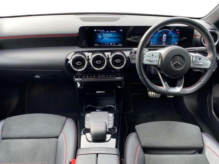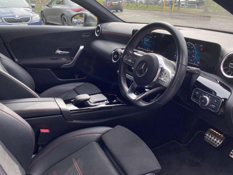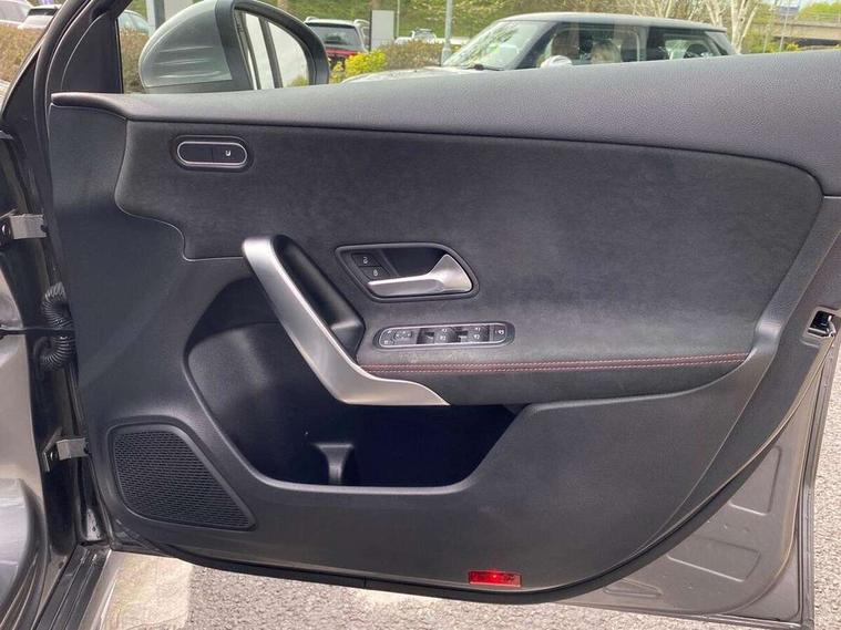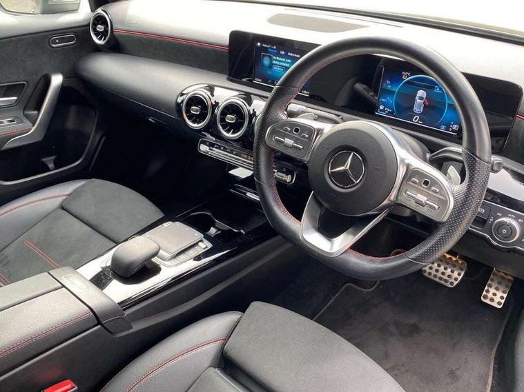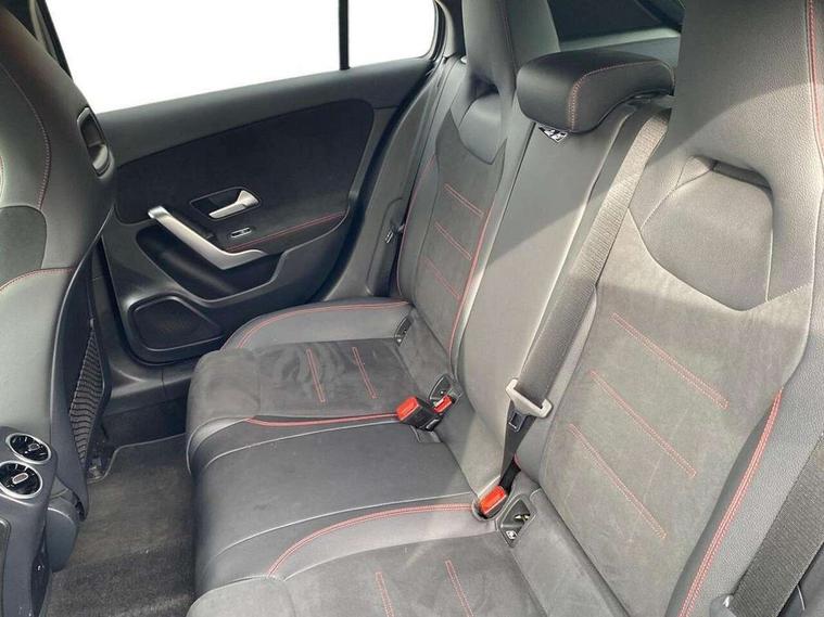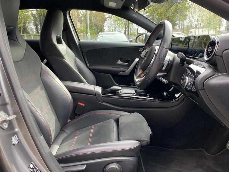 180 degree rear view camera with parking guidelines, 7" colour screen in instrument panel, 7" touchscreen media display, Attention assist, Brake pad wear indicator warning light, Car wash mode, Cruise control + speed limiter, Direct steering, Dual bluetooth interfaces, DYNAMIC SELECT with a choice of driving modes (ECO, Comfort, Sport and Individual), ECO start/stop function, Fluid level warning indicator for fuel, oil, coolant and washer fluid, Hard-disk navigation, Hey Mercedes Voice activation, Lamp failure indicator, Mercedes me connect including emergency call system, accident recovery, breakdown and maintenance management, Mercedes me remote services, Outside temperature gauge, Owners manual in English, Pre-installation for private car sharing, Preinstallation for Mercedes Benz link, Service indicator (ASSYST), Speed sensitive power steering, Trip computer, Lowered comfort suspension, Rear axle multi-link, 2 USB ports (type C) in rear stowage compartment and one in front of center console, 6 speakers, DAB Digital radio, MBUX multimedia system with DAB digital radio and touchpad including satellite navigation, Mercedes-Benz sound system - 100W, 4 Electric Front and Rear windows, Adaptive brake lights, AMG bodystyling - Front apron with splitter in chrome, rear apron with chrome trim and chrome visible trim elements in tailpipe, Black weather strip, Body colour bumpers, Body colour door handles, Body colour side skirt, Body coloured door mirrors, Chrome beltline trim, Diamond radiator grille with chrome pins and silver louvre + chrome insert, Electric adjustable and heated door mirrors with integrated LED side indicators, Exhaust system - Twin visible tailpipes in polished stainless steel, Headlamp assist automatic headlamp activation, Heated glass rear windscreen + timer control, LED high performance headlamps with integrated LED daytime running lights, LED tail lamp, LED third brake light, Privacy glass, Radio aerial, Rain sensing windscreen wipers with two sensitivity settings, Rear fog lights, Rear wiper, Window line trim strip in chrome, 3 Spoke flat bottom leather multi function steering wheel with perforated leather in grip area, 40:20:40 split folding rear seats, Artico man-made leather/Microfibre Dinamica upholstery with red contrast stitching, Auto Mercedes-Benz child seat recognition sensor, Black air vents with surround in silver chrome, Black roof lining, Brushed stainless steel sports pedals with rubber studs, Controller on centre console with chrome surround, Floor mats with stitched edging and AMG lettering, Front centre armrest with storage compartment, Front door sills with Mercedes Benz lettering, Front seat backs luggage nets, Front seat cushion length adjustment, Galvanished gear shift paddles on steering wheel, Heated front seats, Height/reach adjustable steering column, Interior mirror with reading lamps in black and frameless, Manual height adjustable front seats, Rear head restraints, Seat occupancy sensor for front passenger seat, Sports seats with integrated headrests, Stowage compartment in centre console with retractable cover, Sunvisors with illuminated vanity mirrors, Touchpad on center console, Twin front cupholders, Two zone thermotronic luxury automatic climate control, Light and sight pack - A Class, Seat comfort pack - A Class, 3 rear 3 point seatbelts, ABS with Brake Assist, Active bonnet, Active brake assist includes forward collision warning system with autonomous braking, Adaptive brake assist with hold function and hill start assist, Childproof locks manually operated for rear doors and electrically operated for rear power windows, Crash responsive emergency lighting, Driver and passenger head and side airbags, Drivers knee airbag, Dual stage driver/passenger airbags, Electronic parking brake, ESP curve dynamic assist, ESP with ASR, Front and rear seatbelt reminder, Front brake callipers with Mercedes Benz lettering, ISOFIX and top tether child seat fixing points in two outer rear seats, Tyre pressure monitoring system, Warning triangle and first aid kit, Window airbags, Alarm system/interior protection/immobiliser, Keyless Go, Remote central locking and crash sensor with emergency opening function, Urban guard vehicle protection system with immobiliser and interior protection, Black seatbelts, Dinamica microfibre trim in black, 18" AMG 5 twin spoke light alloy wheels in titanium grey with highsheen finish, Summer tyres, Tirefit sealant kit,
