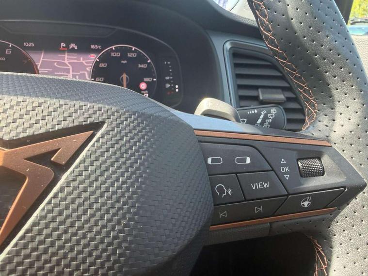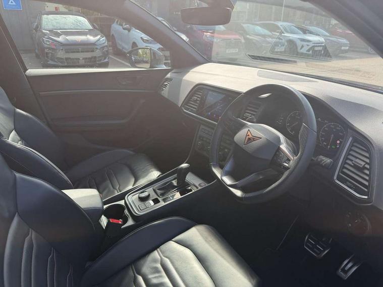 CUPRA drive profile -Normal, Sport, CUPRA and Individual modes, steering/throttle response, gearshift mode, sound actuator and dynamic chassis control, Digital cockpit, E-call, Electric tailgate with virtual pedal, Front and rear view camera, Outside temperature gauge, Progressive power assisted steering, Self parking functionality (includes front and rear parking sensors), Top view camera, Trip computer, Wireless full link smartphone integration, Wireless phone charger, CUPRA sport suspension, Steering wheel mounted audio/phone controls, Body colour bumpers with dark aluminium diffusor, Body coloured wheel arch surrounds, Dark tinted rear windows, Daytime running lights, Door mirrors with welcome CUPRA light silhouette, Dynamic headlight range control with self adjusting whilst driving, Electric adjustable/heated/folding door mirrors, Front and rear electric windows, Front grille frame in chrome, Full LED headlamps with lens and LED front fog lamps with cornering function, Gloss black door mirrors, Gloss black roof rails, Gloss black side mouldings, Gloss black side window trim, Illuminated aluminium front door sill, LED rear tail lights with dynamic indicators, Rear fog lights, Rear side wing doors, Rear spoiler, Rear wash/wipe, Specific CUPRA design front bumper, Third brake light, Visible twin black exhaust pipes in both sides with dark aluminium diffuser, 12V socket in front, 3 seat bench in 2nd row, 60/40 split folding rear seat, Aluminium pedals, Black roof lining, Cupra steering wheel emblem, Dual zone climate control, Electric driver seat with memory function, Front and rear head restraints, Front centre armrest, Front seat back storage pockets, Heated front seats, Heated steering wheel, Height adjustable driver and passenger seat with lumbar adjustment, ISOFIX points in outer rear seats with top tether anchorage points, Leather sport bucket seats, Leather steering wheel and gear knob, Multicoloured ambient lighting with LED interior illumination, Pedal cluster, Rear armrest and easy back seat release mechanism from boot, Single front passenger seat, Sports steering wheel, Steering wheel mounted gearshift paddles, Storage compartment in roof console for sunglass, Storage compartment under driver's seat, Convenience pack - Ateca, Interior lighting pack - Ateca, Navigation system plus pack with DAB - Ateca, Safe and driving pack with High beam control - Ateca, 3x3 point rear seatbelts, ABS, Traction control system (TCS), Electronic stability control (ESC) and Electronic differential lock system (XDS), Airbags - Driver and front passenger airbag with deactivation, front side, two curtain and driver's knee airbags, Black brake callipers with CUPRA logo, Electric parking brake with auto hold function, Front and rear seatbelt reminder, Front assist with autonomous emergency braking, Hill hold control, Manual rear child locks, Single tone horn, Tiredness recognition system, Tyre pressure monitoring system, Alarm, Keyless entry, Locking wheel bolts,