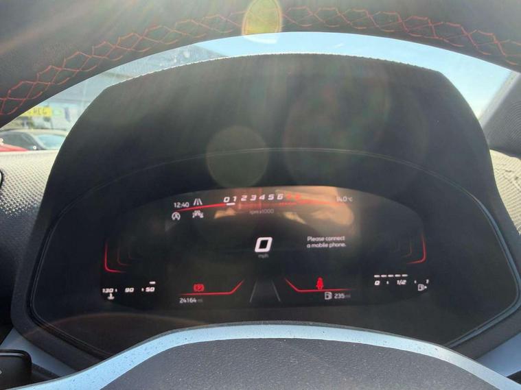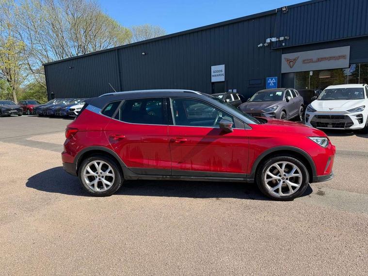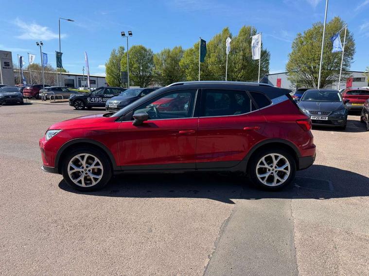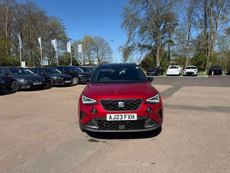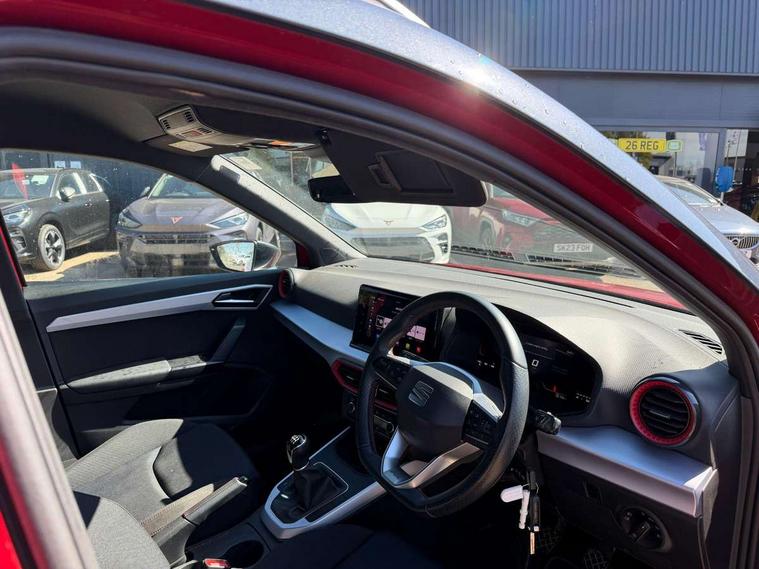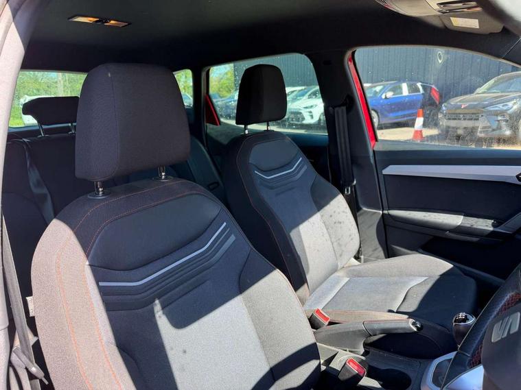 'Lights On' Reminder warning buzzer, 8" Digital cockpit, Digital clock, E-call, Electric speed sensitive power steering, Full Link Smartphone Integration with Mirror Link, Apple Car Play, Google Android Auto with USB Type C cable for Apple and Android compatibility, Lane keeping system, Low fuel warning light, Outside temperature display, Rear parking sensor, RPM counter, Seat connect with safety, service, remote and online, SEAT Drive profile - Four different models normal-sport-eco-individual, steering response, throttle response, Trip computer, Wireless phone charger, 9.2" colour touchscreen with navigation system, voice control and USB port (type c), Bluetooth interface for hands free and audio streaming, DAB digital radio and AM/FM radio, Steering wheel mounted audio controls, Anti theft roof antenna, Auto dimming interior rear view mirror, Automatic activation of hazard warning lights, Body coloured bumpers, Body coloured door handle inserts, Chrome roof rails and window surrounds, Dark tinted rear windows, Electric front/rear windows, Electrically adjustable, heated and folding door mirrors, Front fog lights with cornering function and rear fog light, FULL LED automatic headlights with dynamic headlight range control, coming and leaving home, LED daytime running lights, LED rear tail lights and licence plate lights, Protective side mouldings, Rain sensing wipers, Rear side wing doors, Rear spoiler, Rear window wash/wipe, Roof colour door mirrors, Third brake light, Twin exhaust pipe styling hidden exhaust pipe, Visible VIN plate, Windshield wiper with intermittent control and potentiometer, 2 cupholders, 3 seat bench in 2nd row, 60/40 split folding rear seat, Aircare filter, Black interior roof, Cloth upholstery, Double boot floor, Driver sunvisor with covered mirror + card holder, Dual zone climate control, Front courtesy light with 2x front and 2x rear reading lights, Front sport seats, Gear shift indicator, Height adjustable front seats, Height/reach adjustable steering column, Illuminated boot, Instrument lighting with brightness control, Interior ambient lighting, Interior light in footwell, central console and door panel, ISOFIX points in outer rear seats with top tether anchorage points, Passenger sunvisor with vanity mirror, Perforated flat bottomed leather steering wheel/gear knob/handbrake with red stitching and FR logo, Single front passenger seat, Two front and three rear height adjustable headrests, Interior chrome pack - Arona, 3 point seatbelts on all rear seats, ABS, Active front headrests, Child locks on rear doors, Driver and front passenger airbags with front passenger airbag de activation, front side and curtain airbags, Electronic stability control, Emergency Brake Assist (EBA) and front assist, Front and rear seatbelt reminder, Hill hold control, Multi-Collision braking, Tiredness recognition system, Traction control, Tyre pressure monitoring system, Alarm with back-up horn, Electronic engine immobiliser, Locking wheel bolts, Remote central locking + deadlocks, Tow away protection, Titan black dashboard, 17" Dynamic alloy wheels,