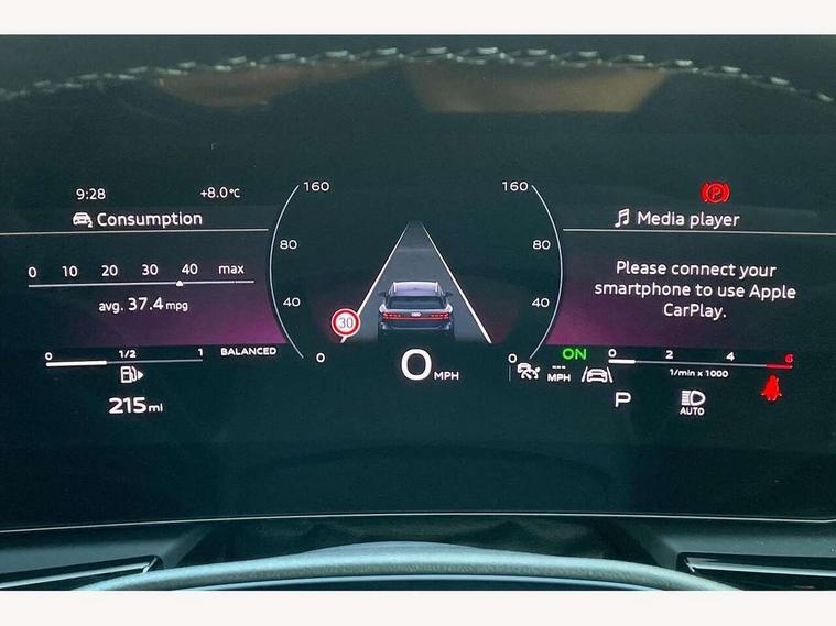 Audi application store, Audi assistant, Audi connect emergency call and service, Audi connect with Amazon Alexa Integration, Audi digital key, Audi drive select, Audi phone box with wireless charging, Audi virtual cockpit, Automatic start/stop system with coasting functionality, Bluetooth interface, Luggage compartment lid with Electric opening / closing, MMI navigation plus with high resolution 14.5" OLED touchscreen colour display, Power assisted steering, Service interval indicator, Smartphone interface includes wireless Apple carplay/Android Auto, Voice control system, Quattro with ultra technology, Sports suspension, Audi sound system impressive sound with 10 loudspeakers including centre speaker and subwoofer, 6-channel amplifier with a total output of 180 watts, DAB Digital radio, USB ports with charging function, Aluminium roof rails, Audi Matrix LED technology, Auto dimming rear view mirror, Automatic-dynamic headlight range control, Body colour door mirrors, Body coloured door handles, Dipped beam, main beam, position light, dynamic indicator and cornering light, Door mirrors - electrically adjustable, heated, folding and auto dimming on both sides, Dynamic light scenarios of the coming home/leaving home function when stationary, Electric front/rear windows, Frameless auto dimming interior rear view mirror, Front illuminated aluminium inlay door sill trims with S logo, Headlight cleaning system, LED headlights Plus incl. digital daytime running lights, turning light, all-weather light, motorway light, manouevring light and intersection light, LED rear lights pro incl. brake lights, tail lights, rear number plate lights, reversing lights, continuous light strip, LED third brake light, Privacy glass, Rain and light sensors, Rear and side windows with heat insulating glass, Rear side wing doors, Rear wiper, Roof spoiler, S line exterior styling, Sport exterior inc Radiator grille, air inlets and diffuser in scandium grey as well as inlay in diffuser in selenite silver, White rhombus logo projection light in exterior mirrors, Window trim strips in aluminium look, Windscreen with heat insulating and acoustic glazing, 3 seat bench in 2nd row, 3-spoke Sport leather steering wheel flat top and bottom with multifunction and shift paddles, 4 way electric lumbar support for driver and front passenger, 4 zone deluxe automatic climate control, 40:20:40 split folding rear seat bench with centre armrest and cup holders, Centre armrest, front- adjustable angle with four settings, Electrically adjustable front seats, Front head restraints, Heated front seats, i-Size child seat mounting on the front passenger side and outer rear seats, i-Size and top tether on the outer rear seats, Manual steering wheel adjustment, Net partition, Rear headrests, Single front passenger seat, Sport front seats, Stainless steel pedals and footrest, Steering wheel trim in chrome look, S emblem, steering wheel grips in perforated leather and contrasting stitching, Twin leather/artificial leather upholstery, Ambient lighting package plus - A6, Drive and Park assistance package - A6, Protective warning assistance package - A6, 3x3 point rear seat belts, Acoustic vehicle alerting system, Black seat belts, Convenience key with safelock, Driver and front passenger airbags, EBD - Electronic brakeforce distribution, Electric rear child safety lock, Electromechanical parking brake, Electronic Stability Control (ESC) including ABS, ASR and EDL, First aid kit with warning triangle and vests, Front passenger airbag deactivation, Seatbelt monitoring, Side airbags front with head airbag system and interaction airbag, Standard 18"steel disc brakes front and rear, Tyre pressure monitoring system, Anti theft alarm, Anti-theft wheel bolts, Immobiliser, Keyless Go, Remote central locking, Accents in the interior in aluminium look, Inlays in matt brushed aluminium with linear embossing, anthracite, Upper and lower interior elements in leatherette with contrasting stiching, Wraparound interior elements in artificial leather, Tyre repair kit,
